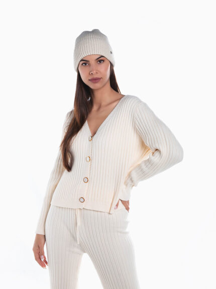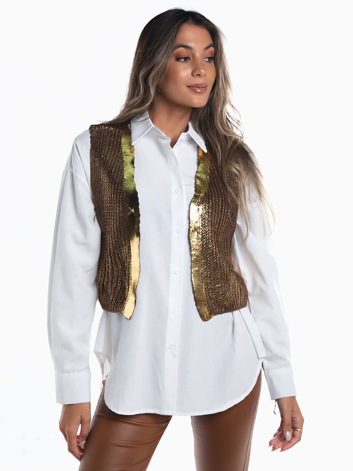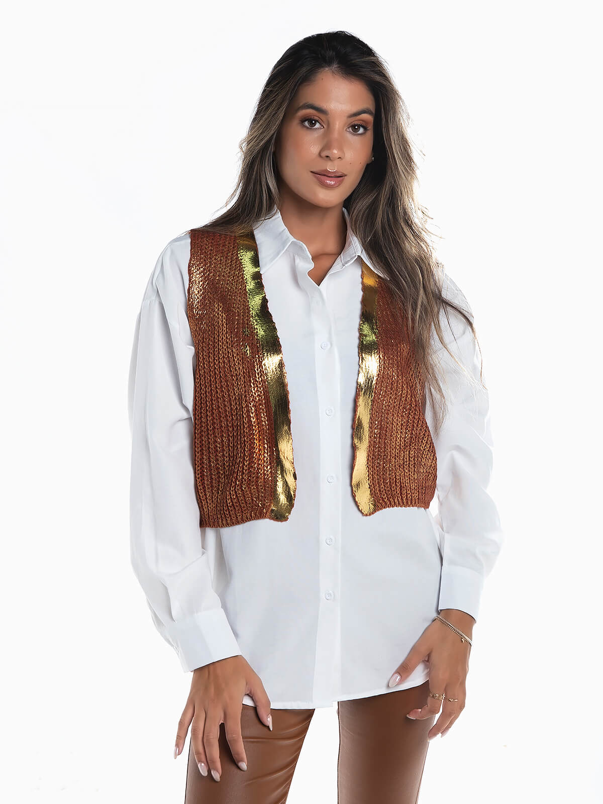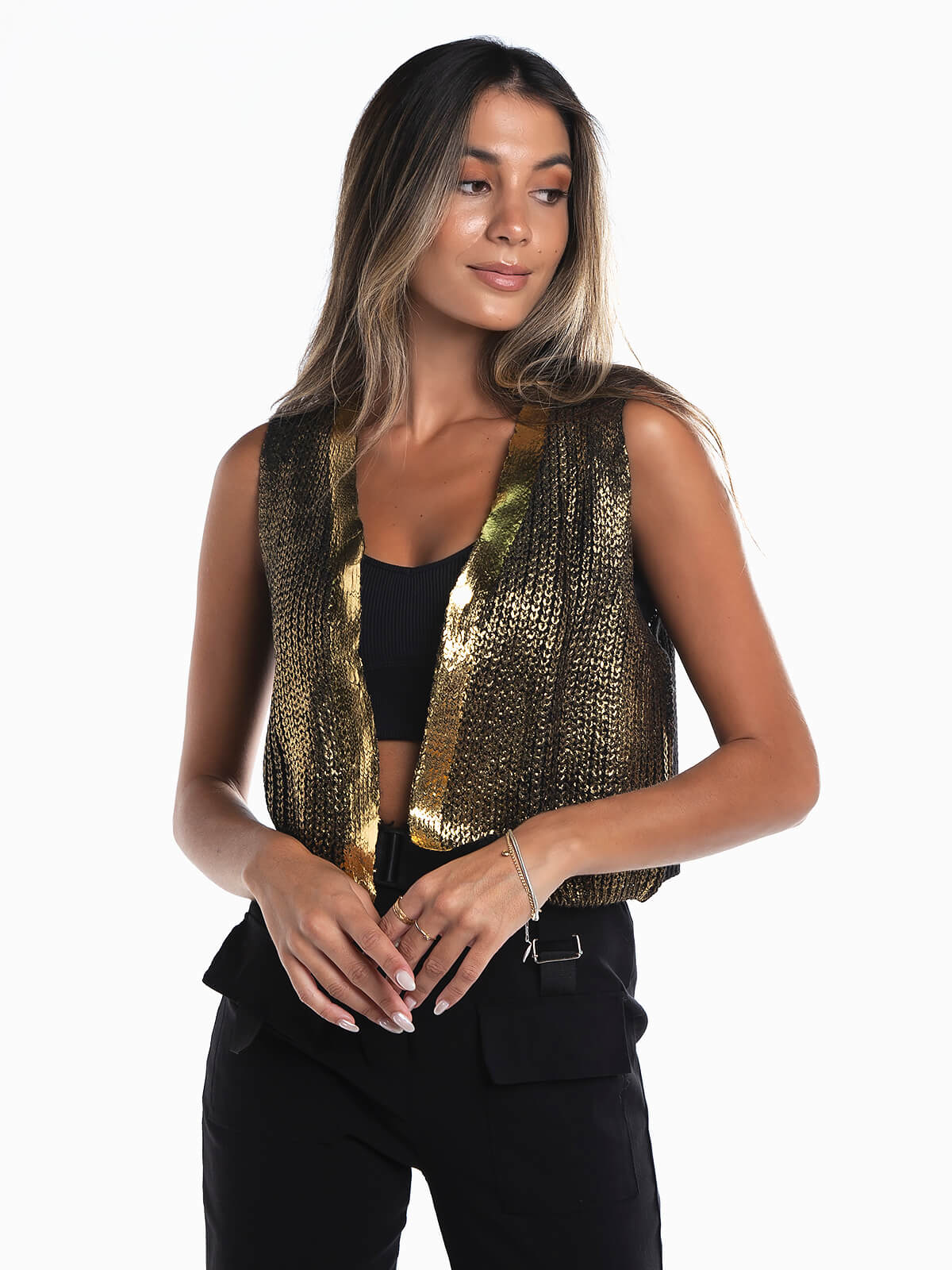 Colete curto aberto em malha brilhante para senhora. Colete manga cava com extremidades douradas.