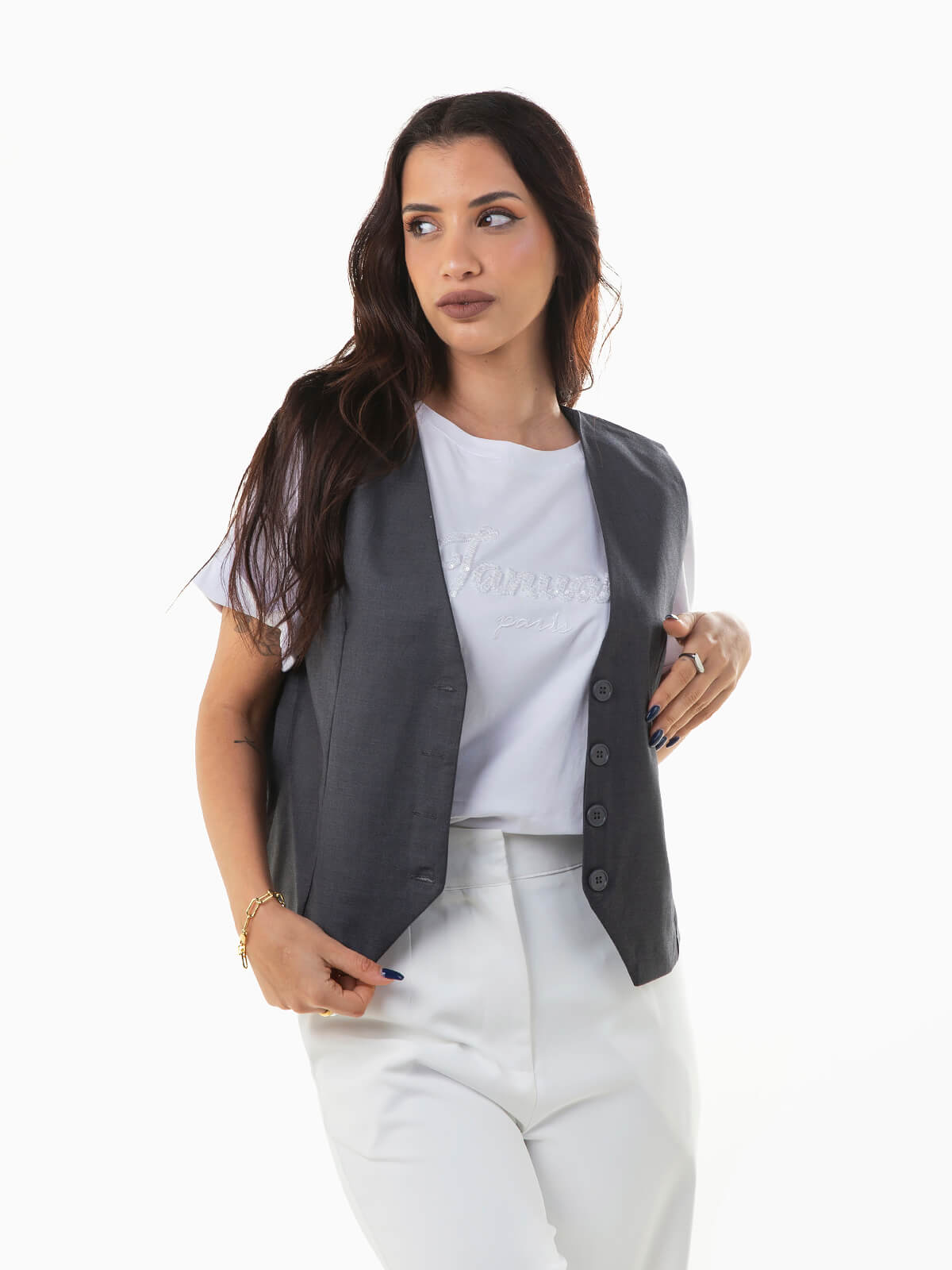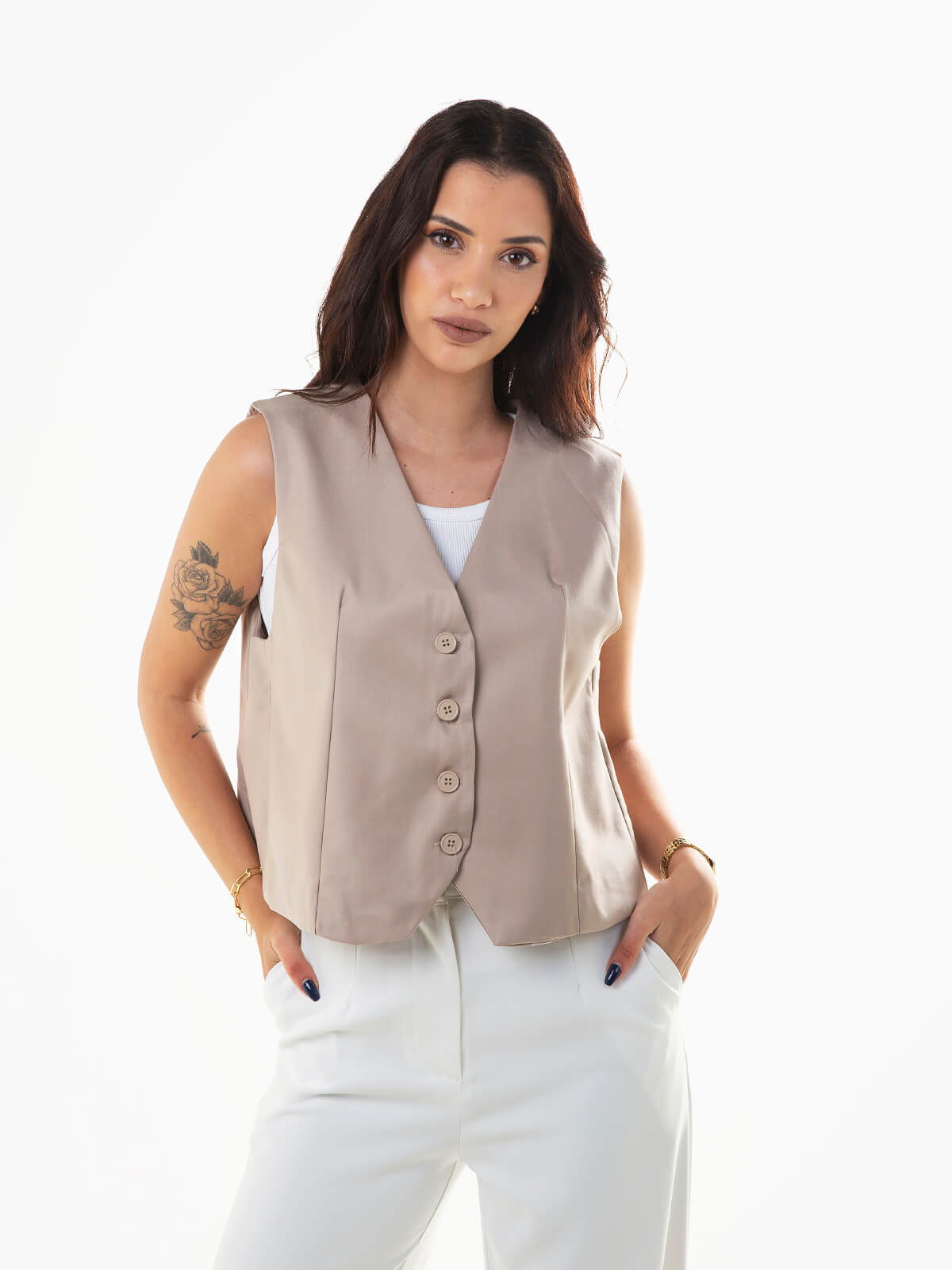 Colete curto de fato para mulher com interior forrado. Colete básico com decote em V e aperto frontal de botões.