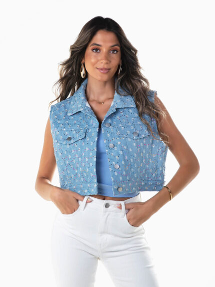Colete de fato com riscas diplomáticas e interior forrado. Colete para senhora com gola de lapela e aperto cruzado de botão.