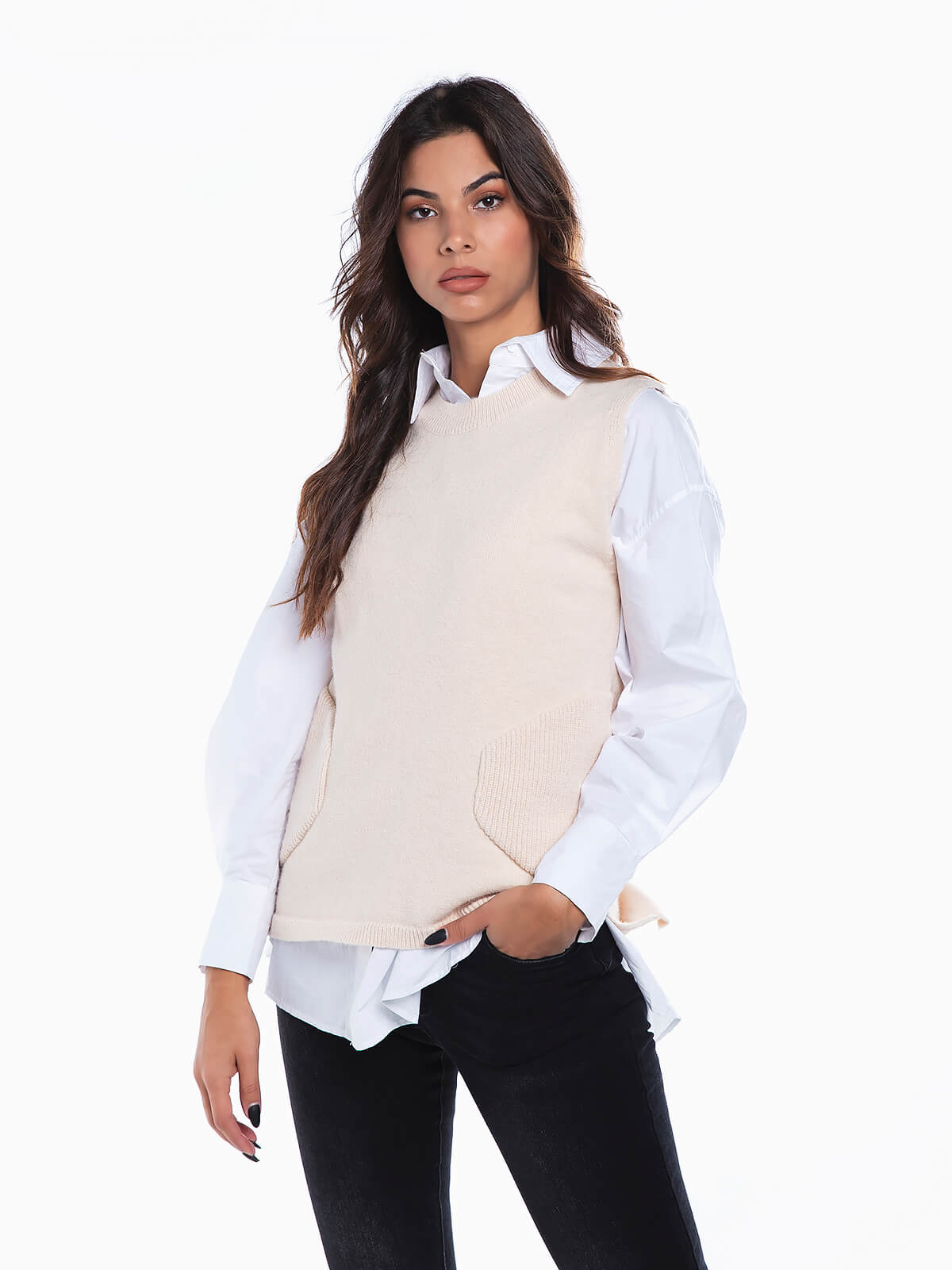 Colete de malha com bolsos canelados de lado. Decote redondo. Extremidades caneladas.