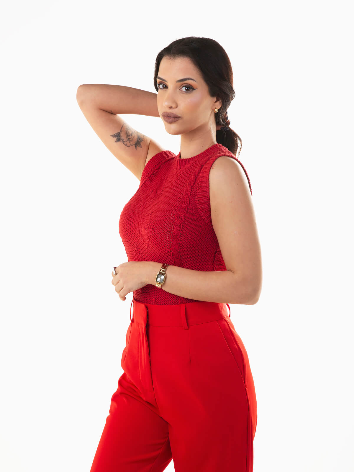 Colete de malha com detalhes trançados e losangos. Colete sem mangas para senhora com acabamentos canelados e decote redondo.