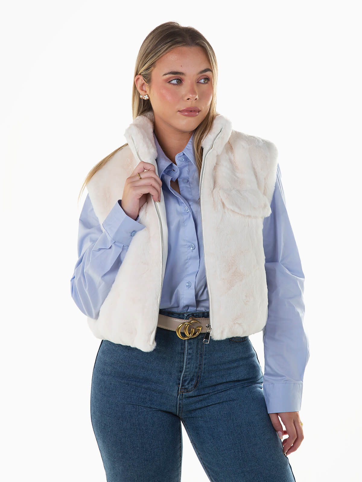 Colete de pelo sintético com interior forrado para senhora. Colete com gola alta e palas decorativas. 2 bolsos. Aperto fecho zíper.