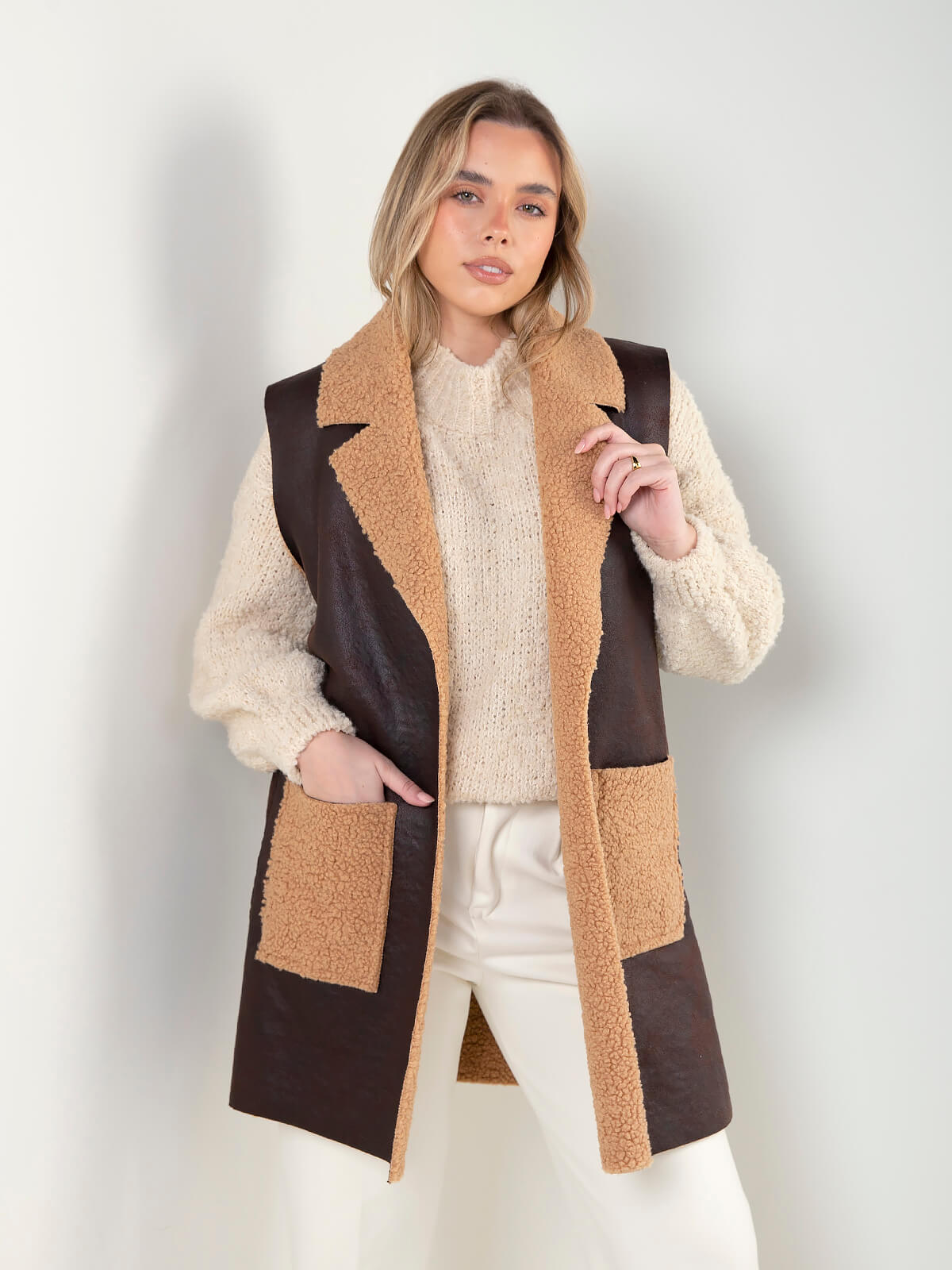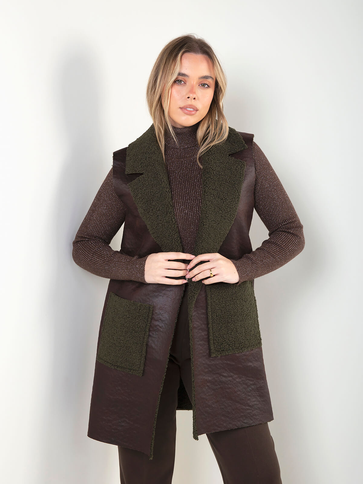 Colete comprido em camurça, com interior em tecido de pelo encaracolado que garante maior conforto nos dias frios. Design aberto, com gola de abas e bolsos frontais, ideal para criar looks de inverno práticos e atuais.