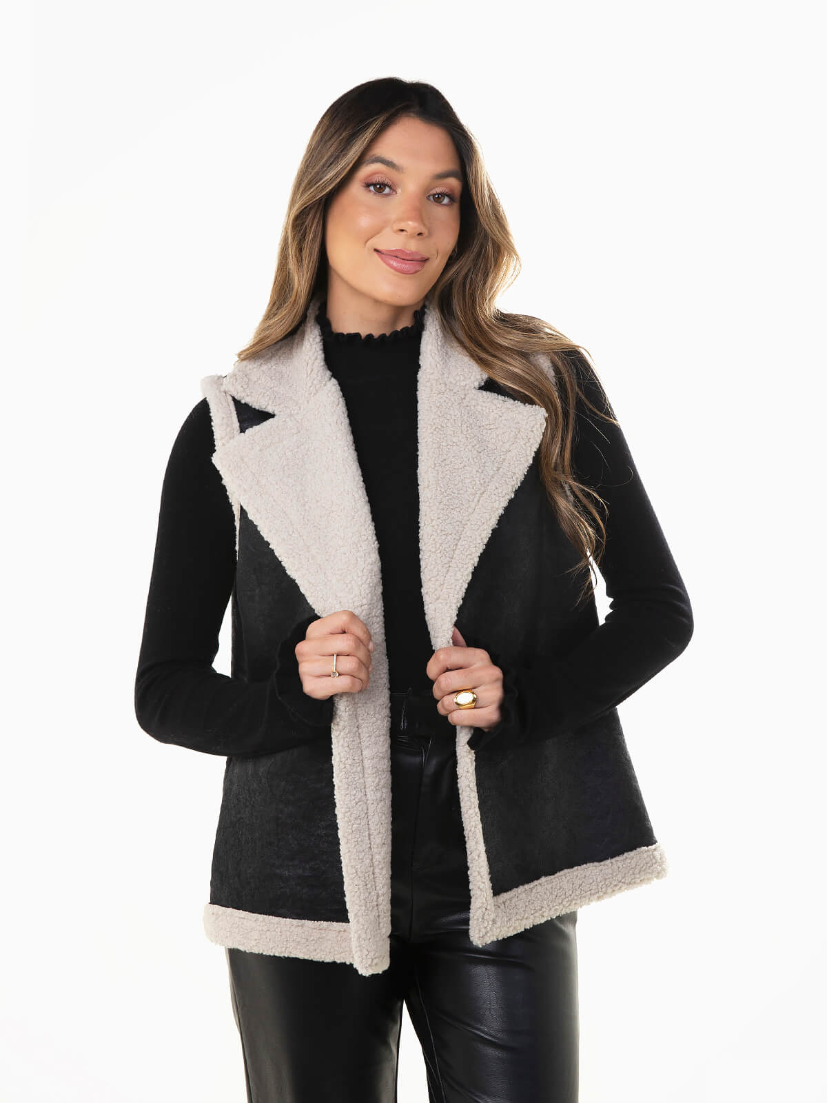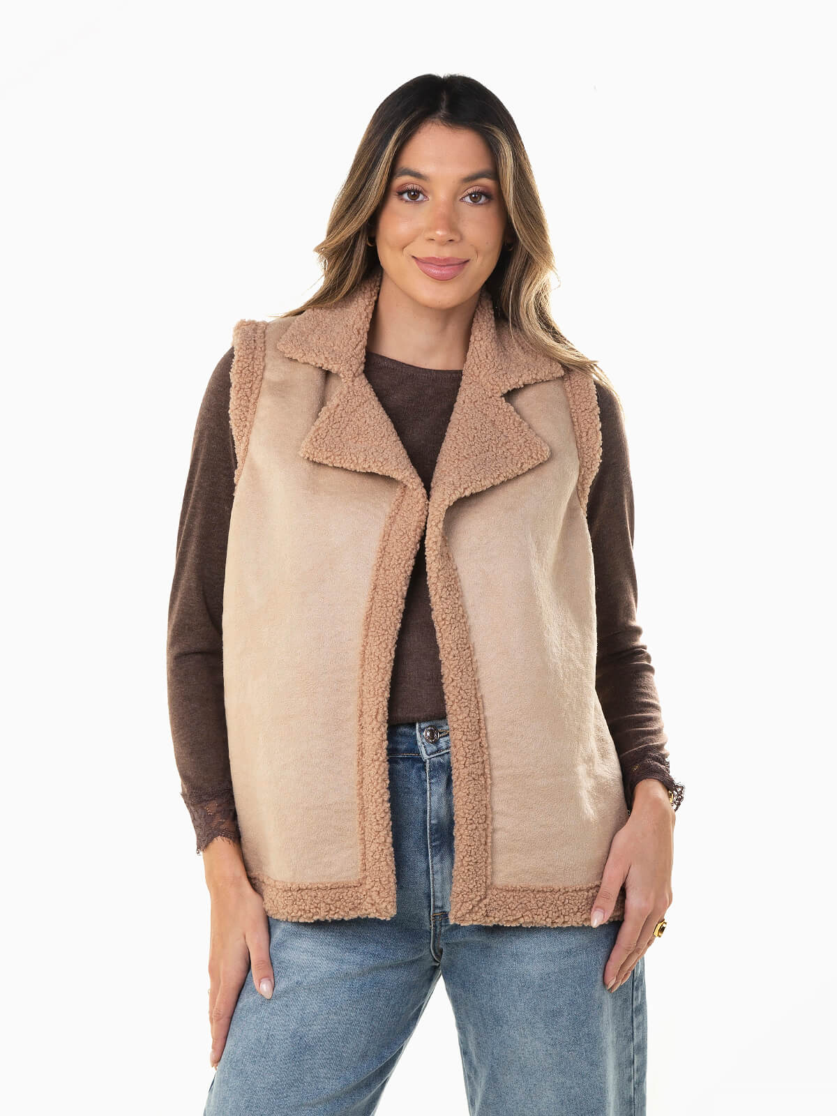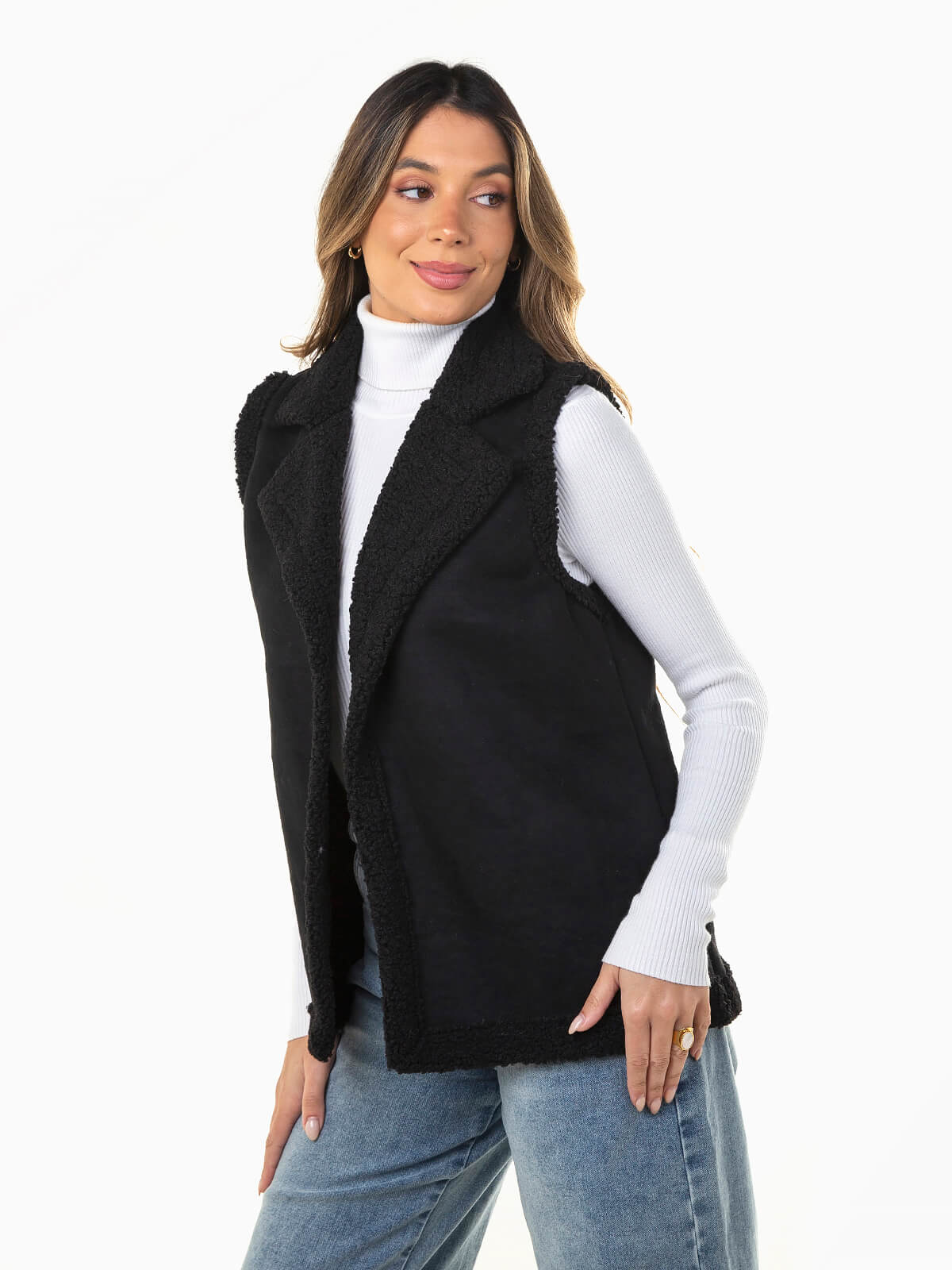 Colete em camurça sintética com gola estruturada e interior em pelo encaracolado. Design aberto, confortável e perfeito para elevar looks de inverno.