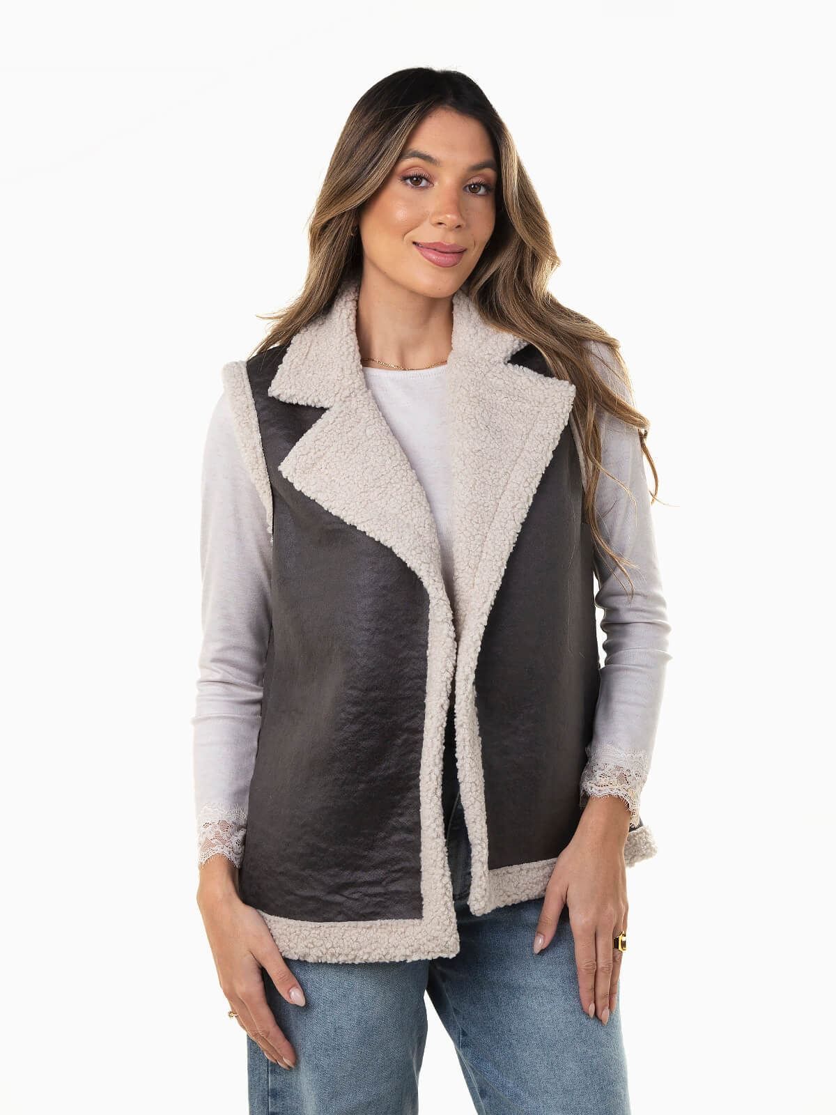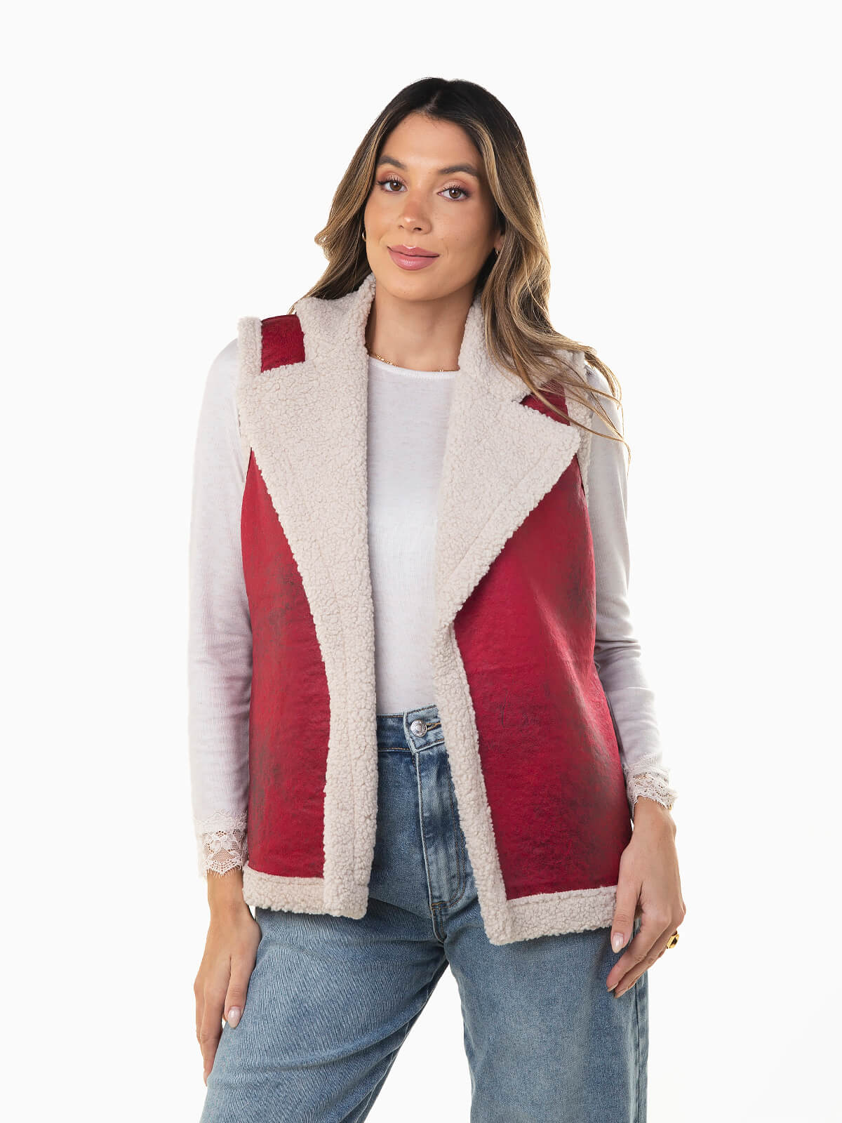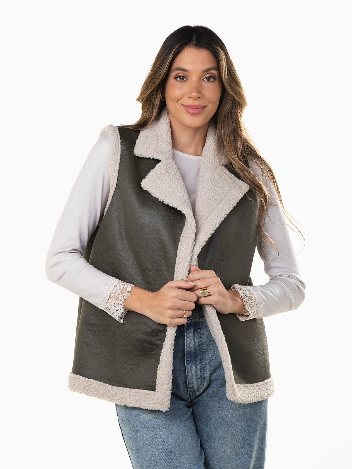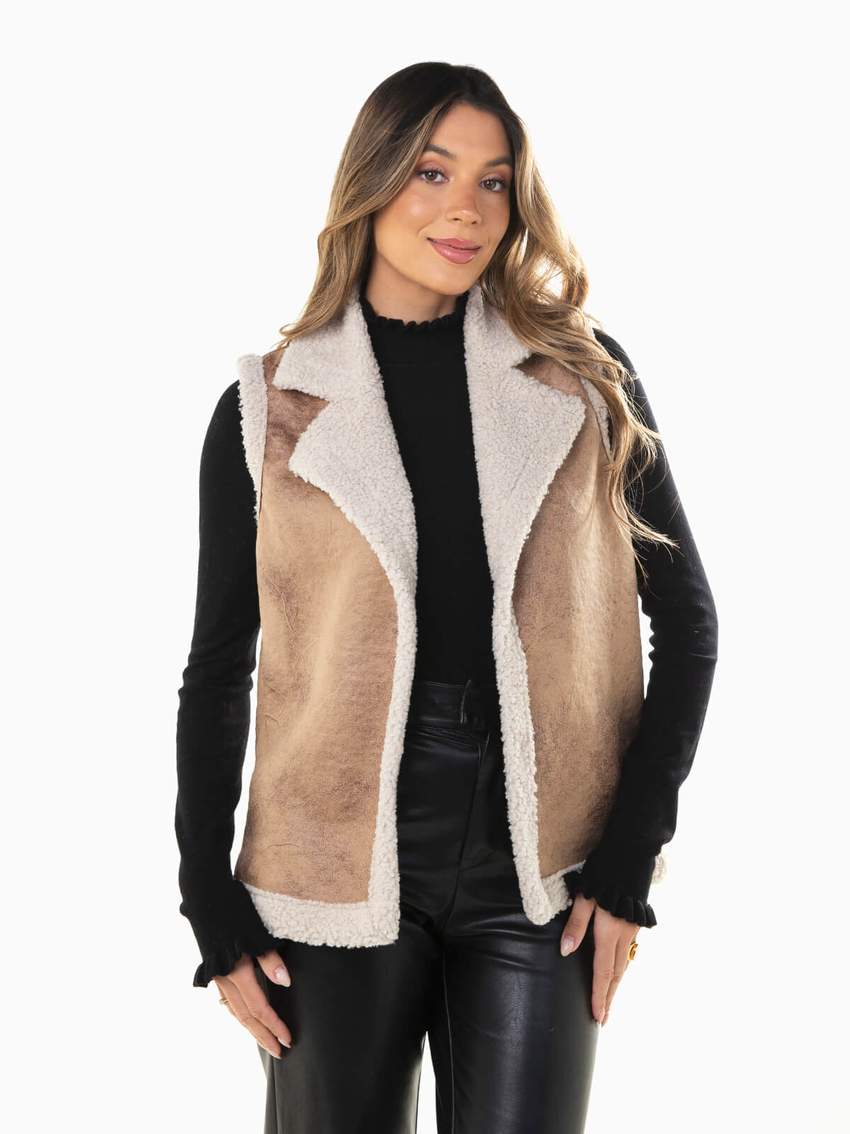 Colete em camurça sintética com gola estruturada e interior em pelo encaracolado. Design aberto, confortável e perfeito para elevar looks de inverno.