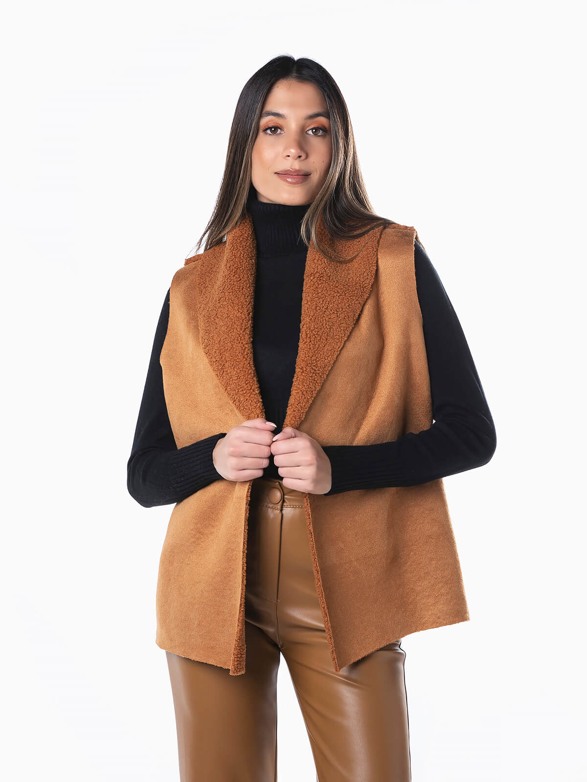 Colete efeito camurça combinado com interior terry. Colete aberto para senhora com gola virada.