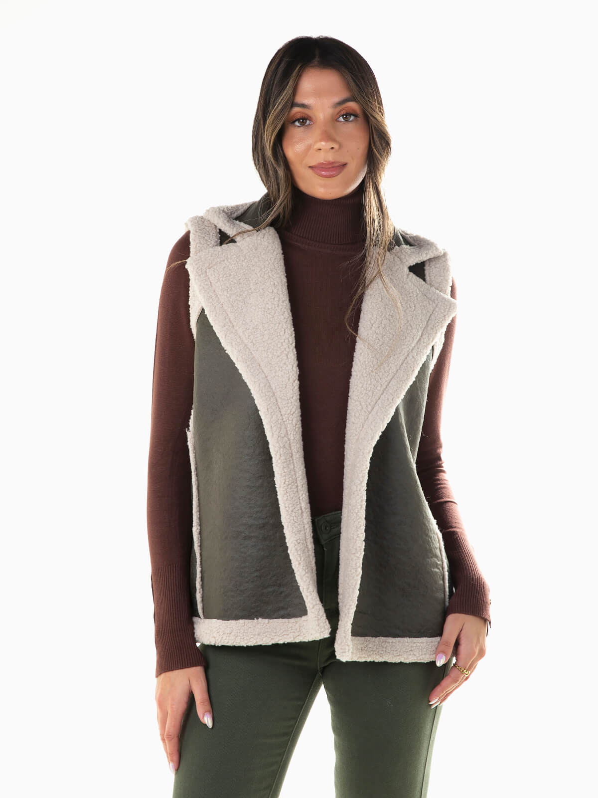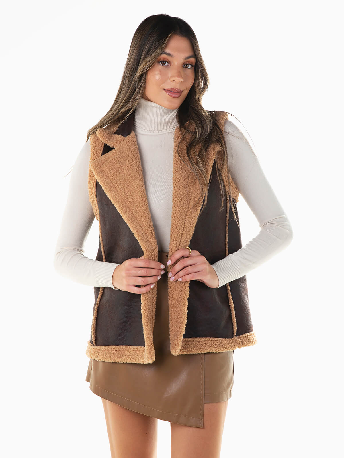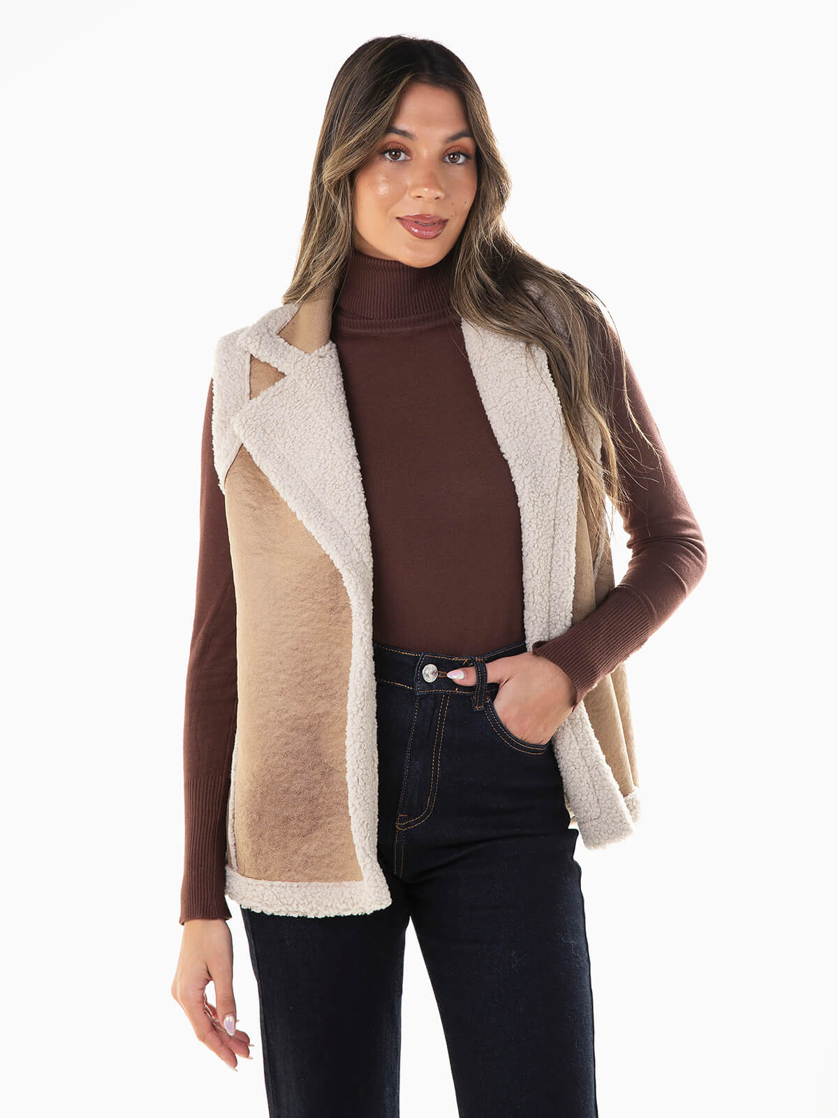 Colete efeito pele com pelo sintético no interior e extremidades. Colete aberto com gola abas e lapelas.