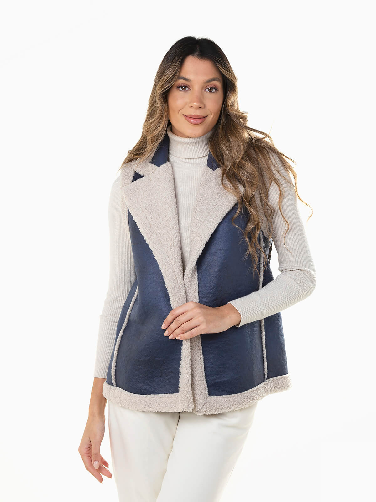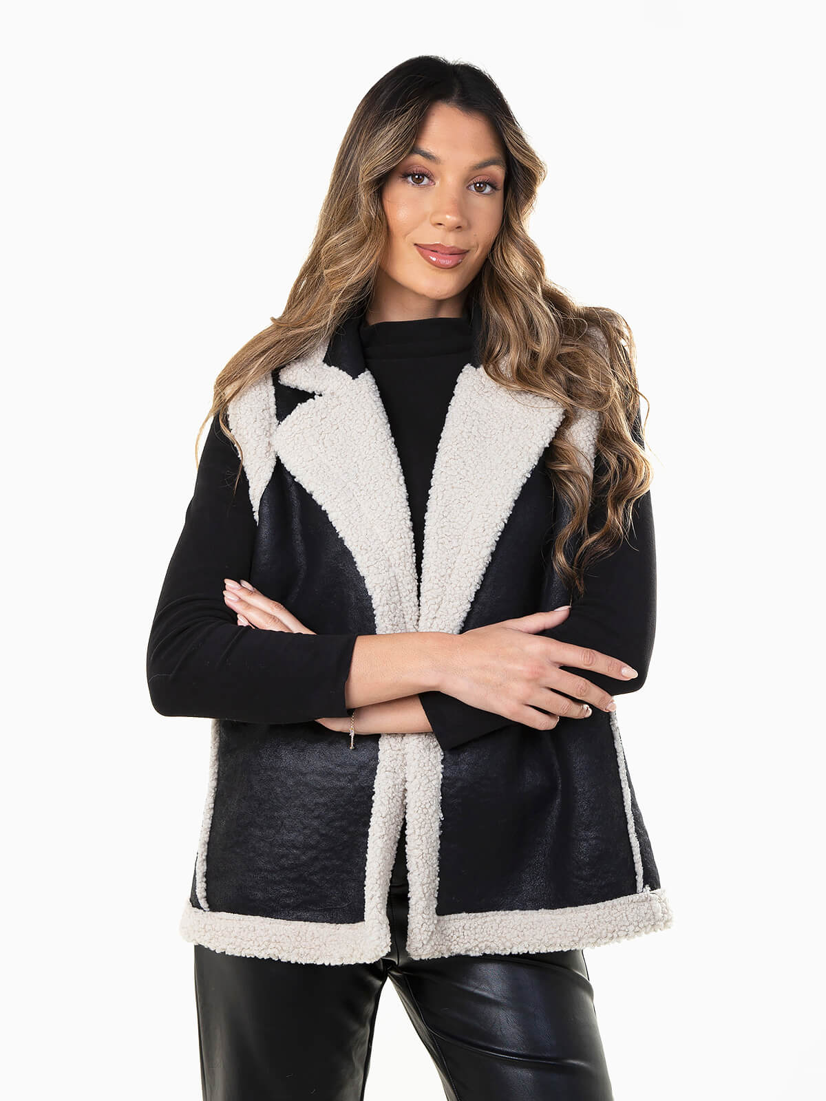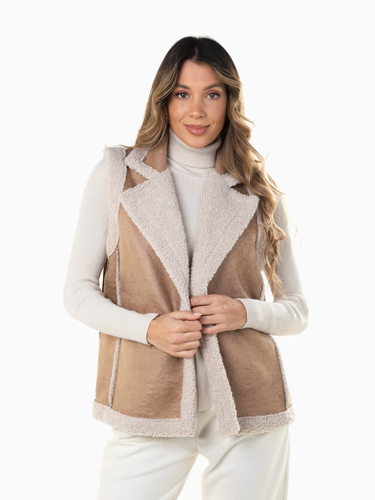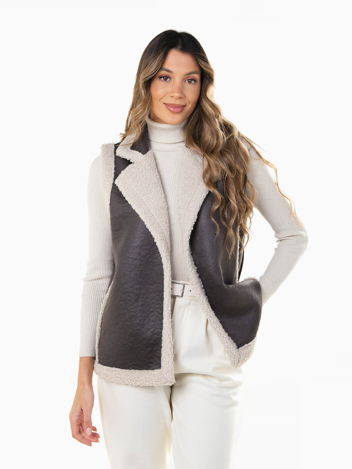 Colete em efeito pele envelhecida com interior e rebordo em pelo encaracolado. Modelo aberto, quente e moderno.