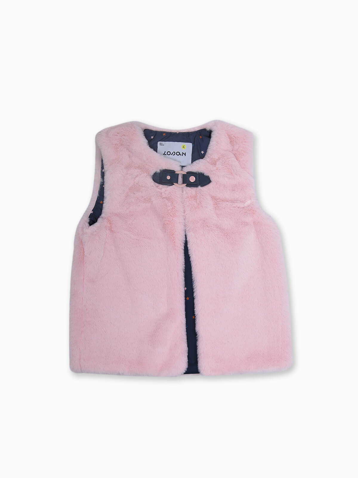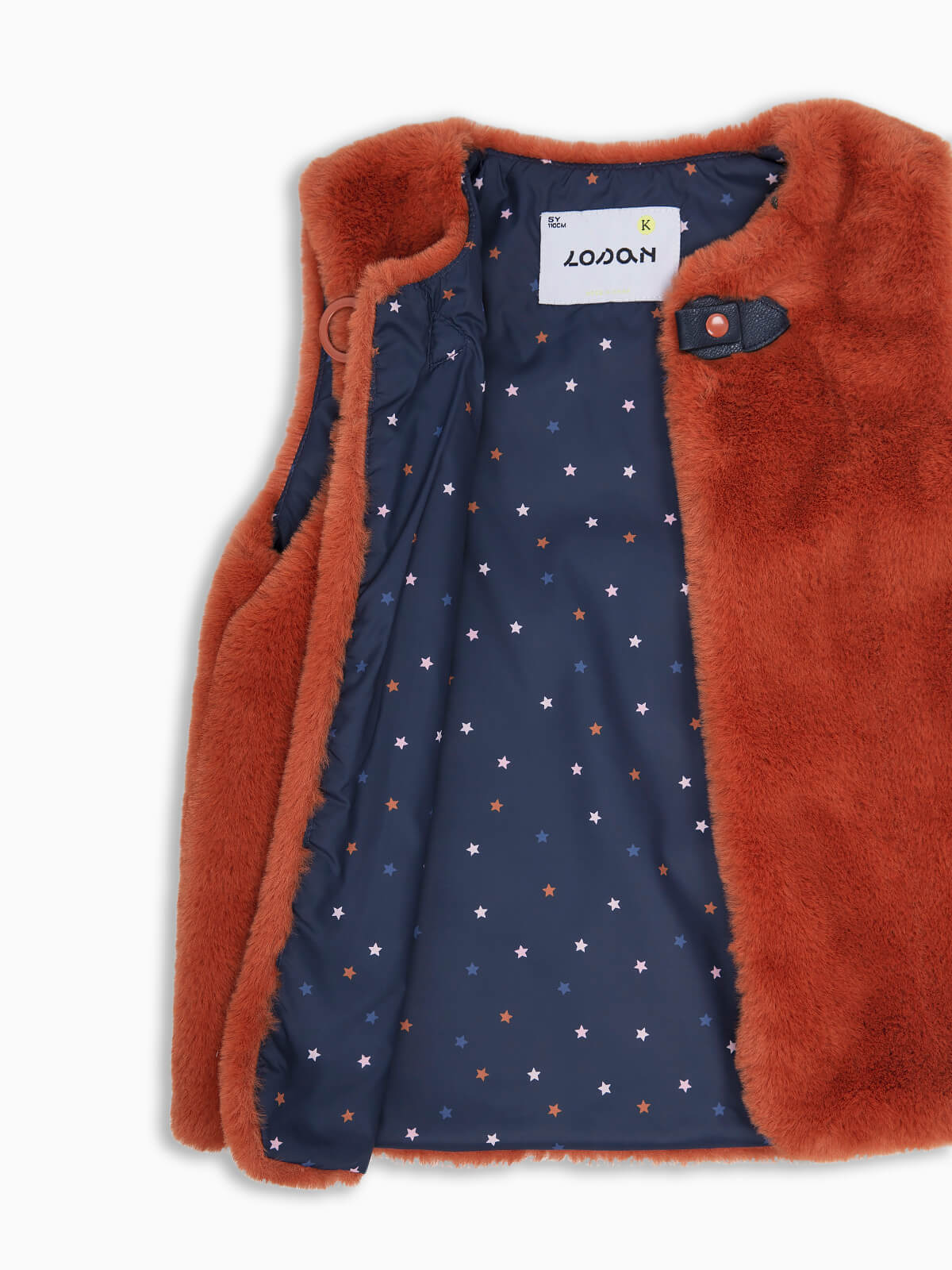 Colete em pelo para menina. Colete com forro estampado estrelas. Decote redondo. Aperto de colchete.