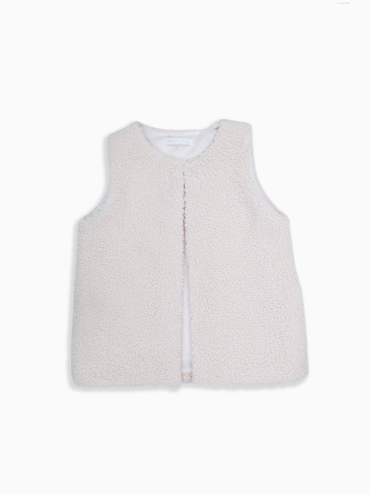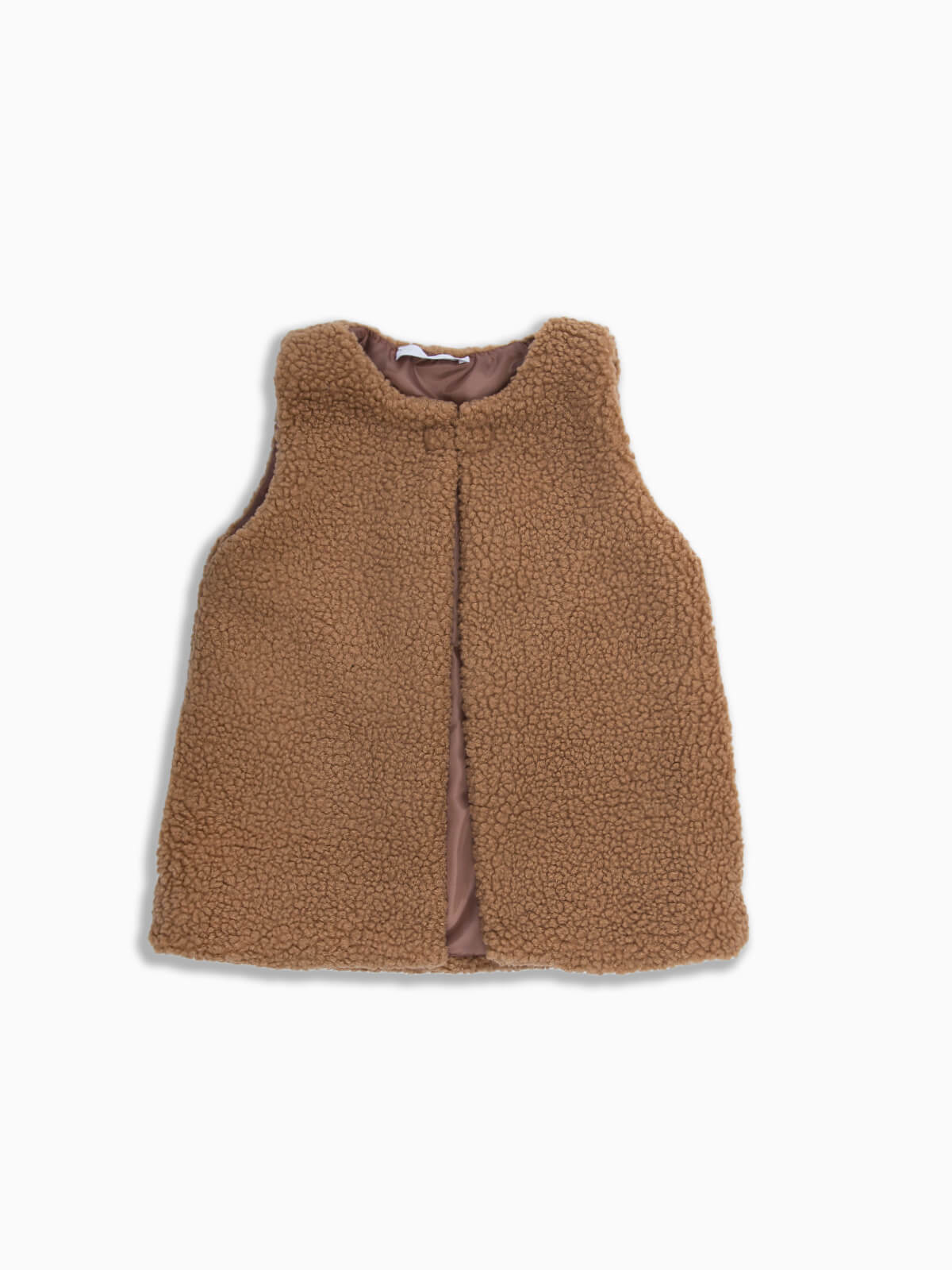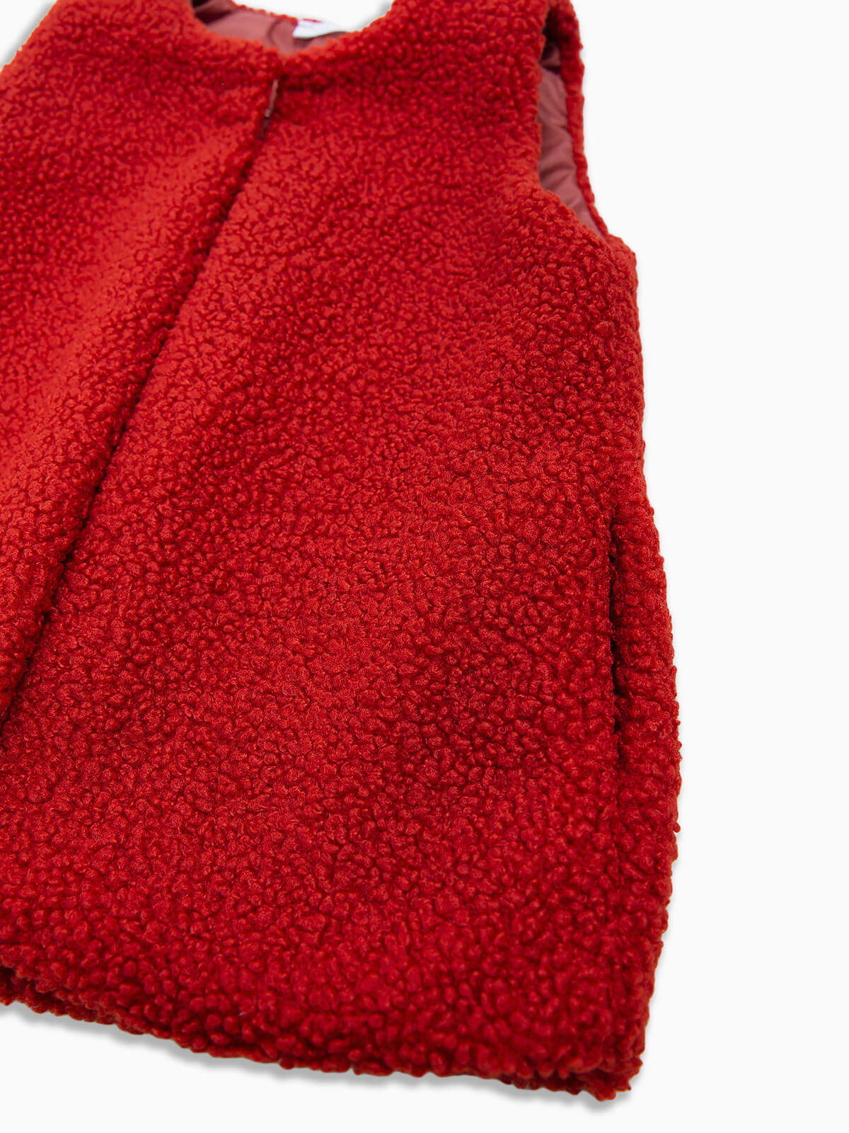 Colete em velocino para menina com forro interior. Aperta com colchete na parte superior.