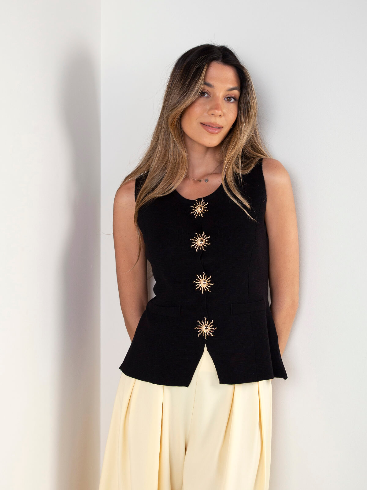 Colete de corte estruturado com decote redondo e fecho frontal com botões dourados decorativos. Apresenta pormenores de bolsos falsos na frente e acabamento ajustado ao corpo.