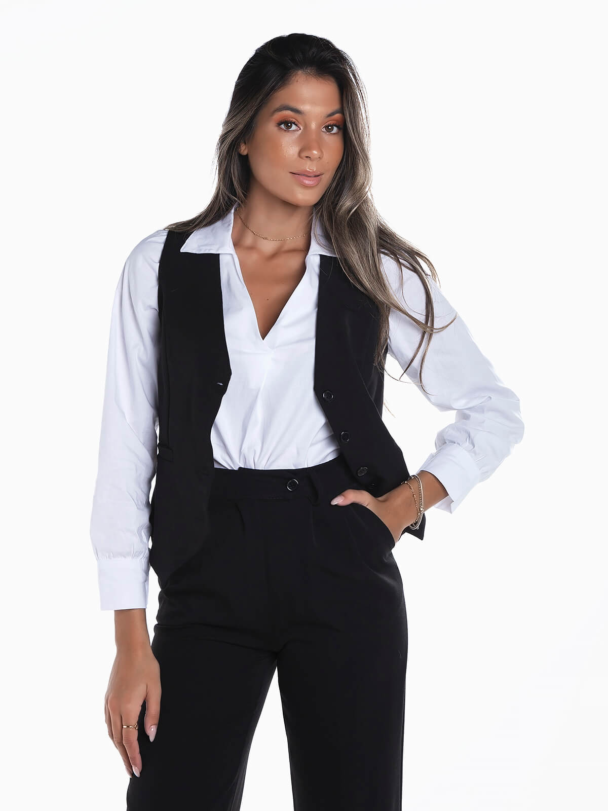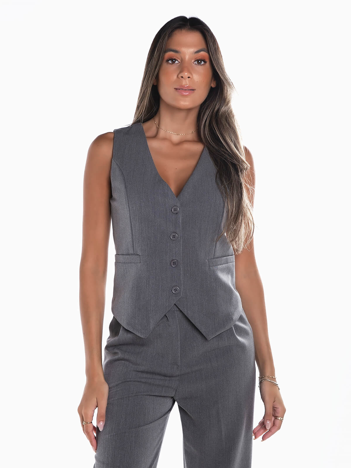 Colete de fato com aperto de botões à frente. Colete estilo alfaiate sem mangas com interior forrado. Decote em bico. Bolsos decorativos.