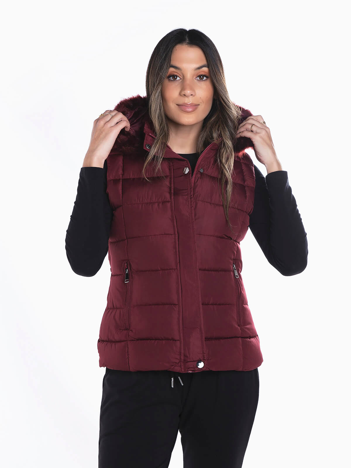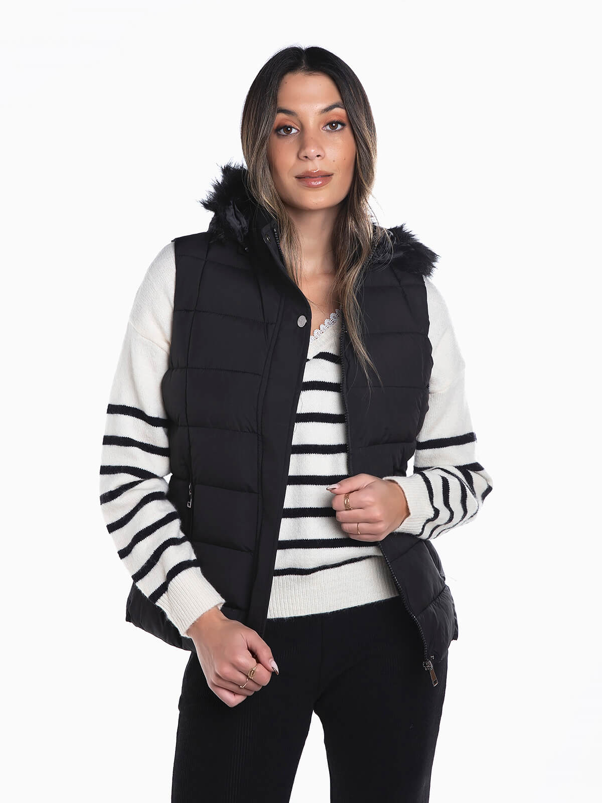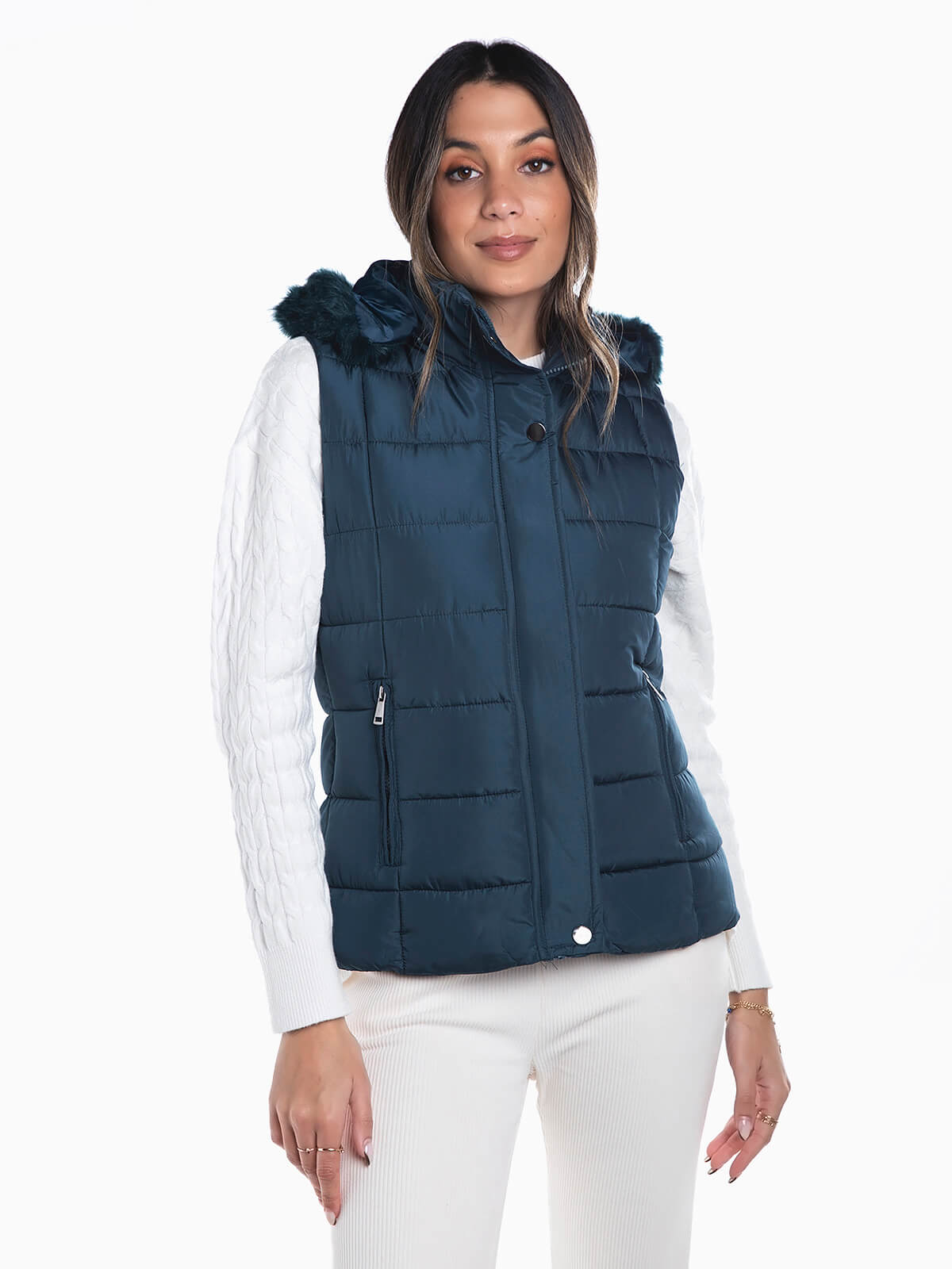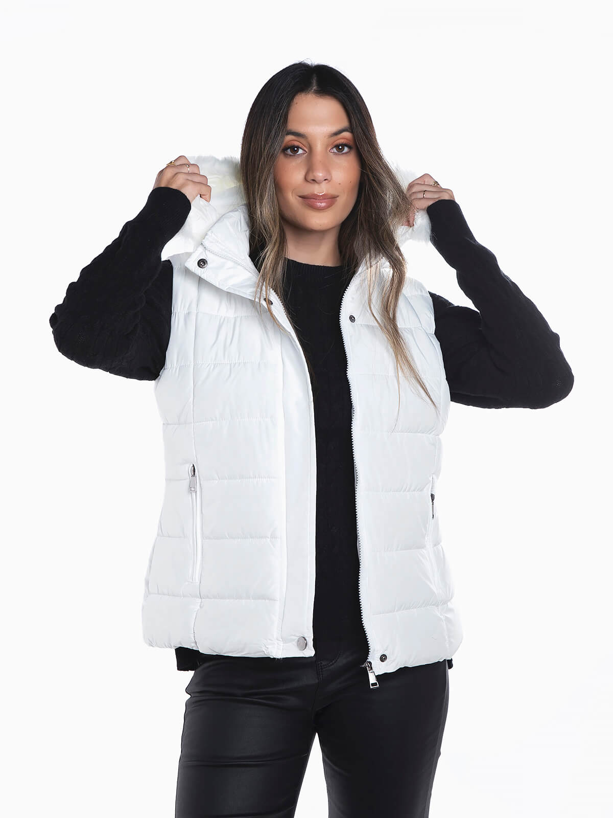 Colete impermeável com capuz removível e pormenor pelo. Colete acolchoado manga cava com gola alta. 2 bolsos. Aperto de fecho zíper e botões pressão.