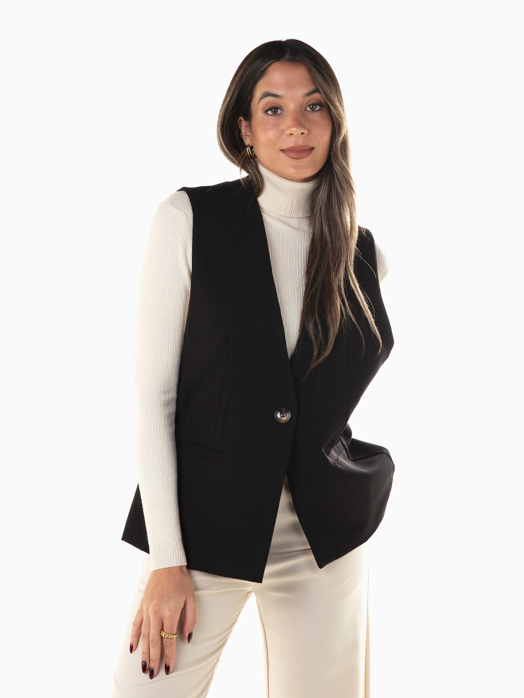 Colete largo com aperto de botão. Colete de fato com interior forrado e bolsos decorativos. Decote em V.