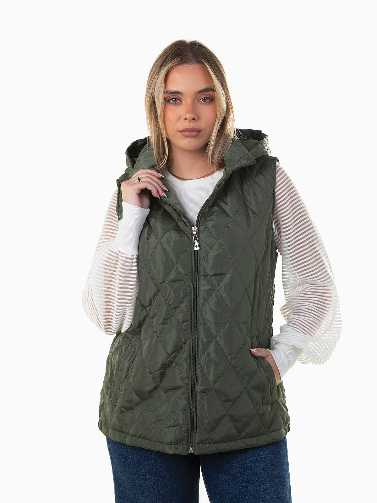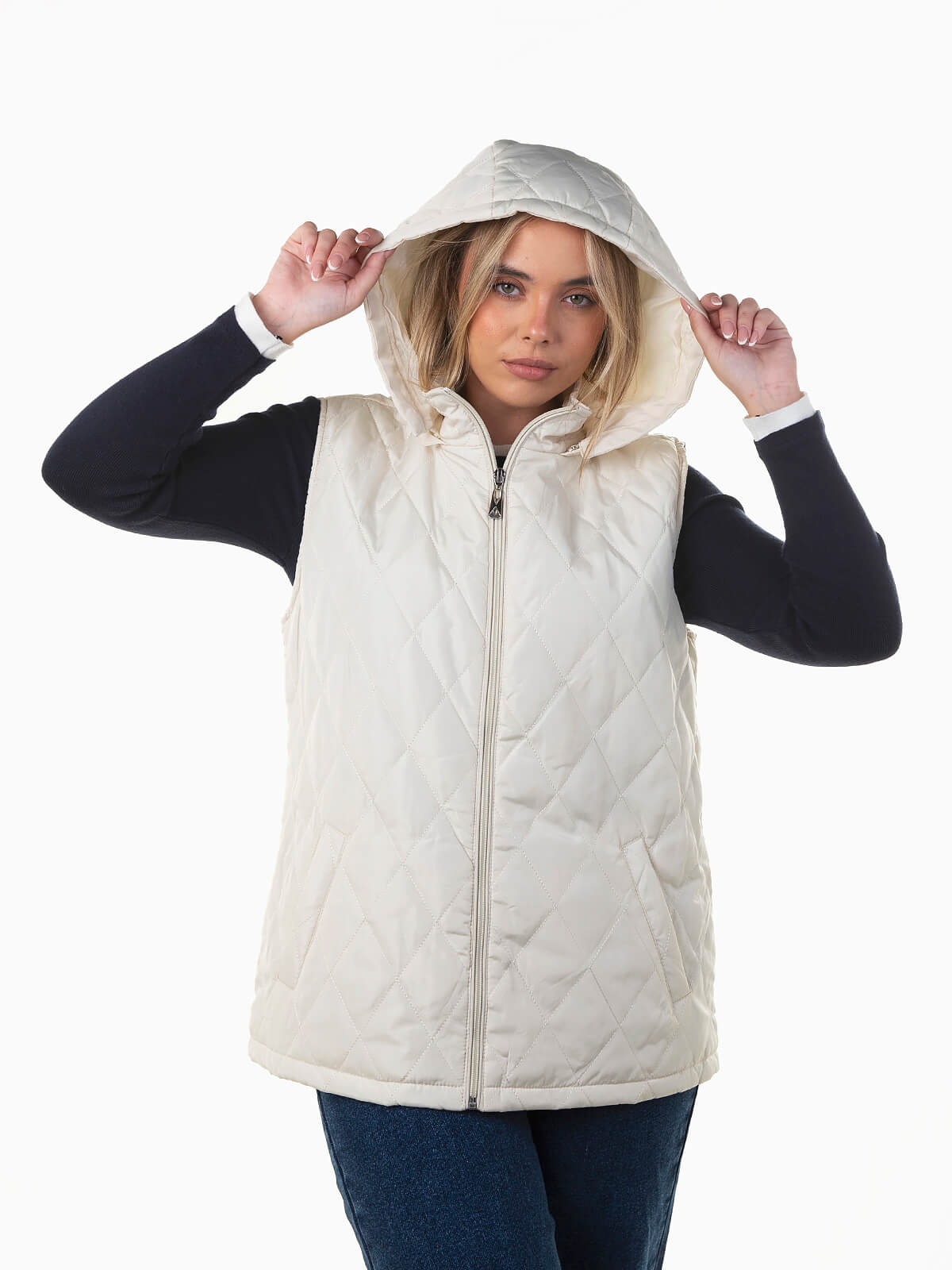 Colete acolchoado leve com capuz removível e gola alta. Modelo prático e confortável, com dois bolsos laterais e aperto de fecho zíper. Oferece proteção ligeira contra a chuva, ideal para sobrepor em camisolas ou malhas e criar looks casuais de meia-estação.