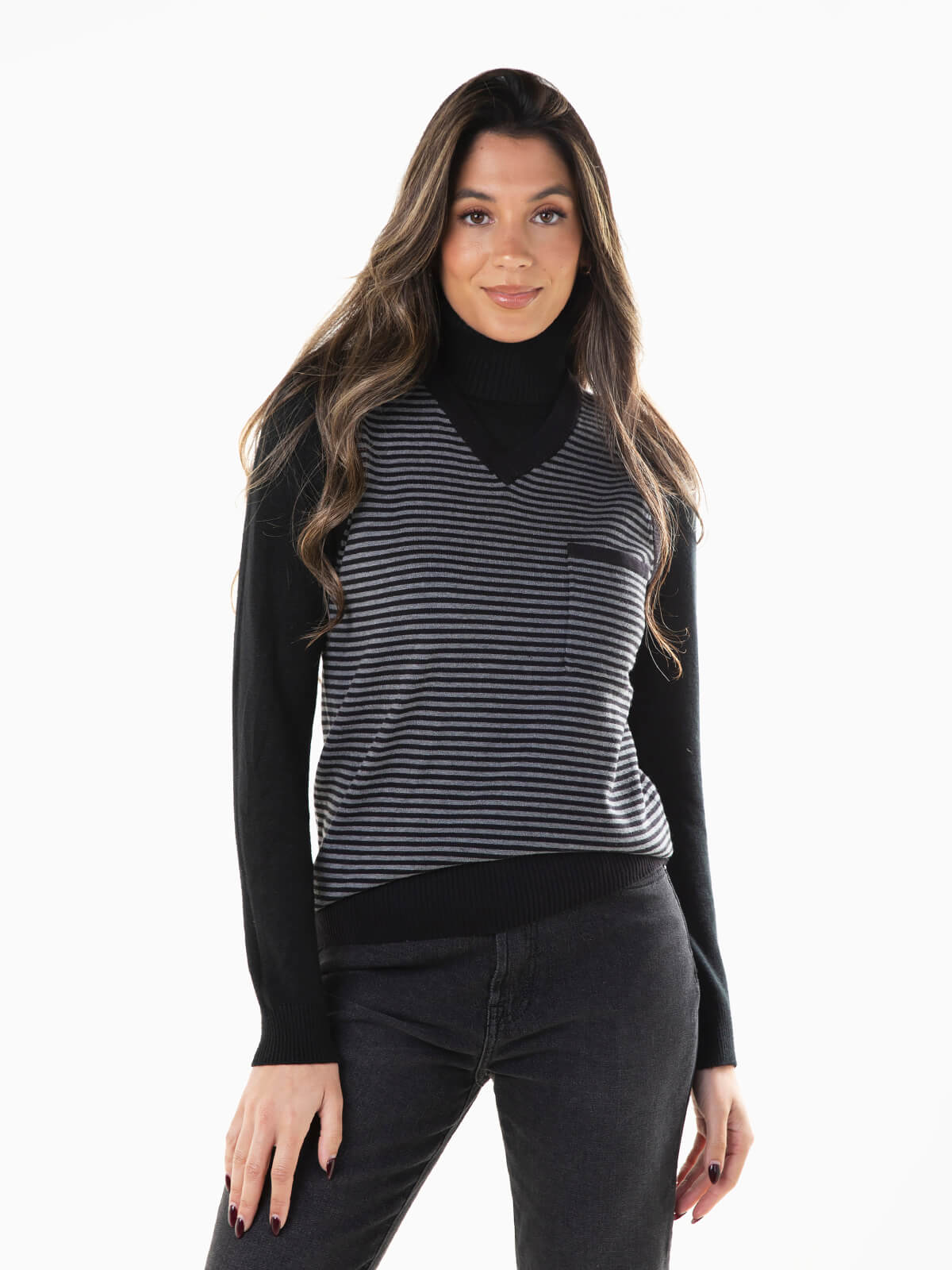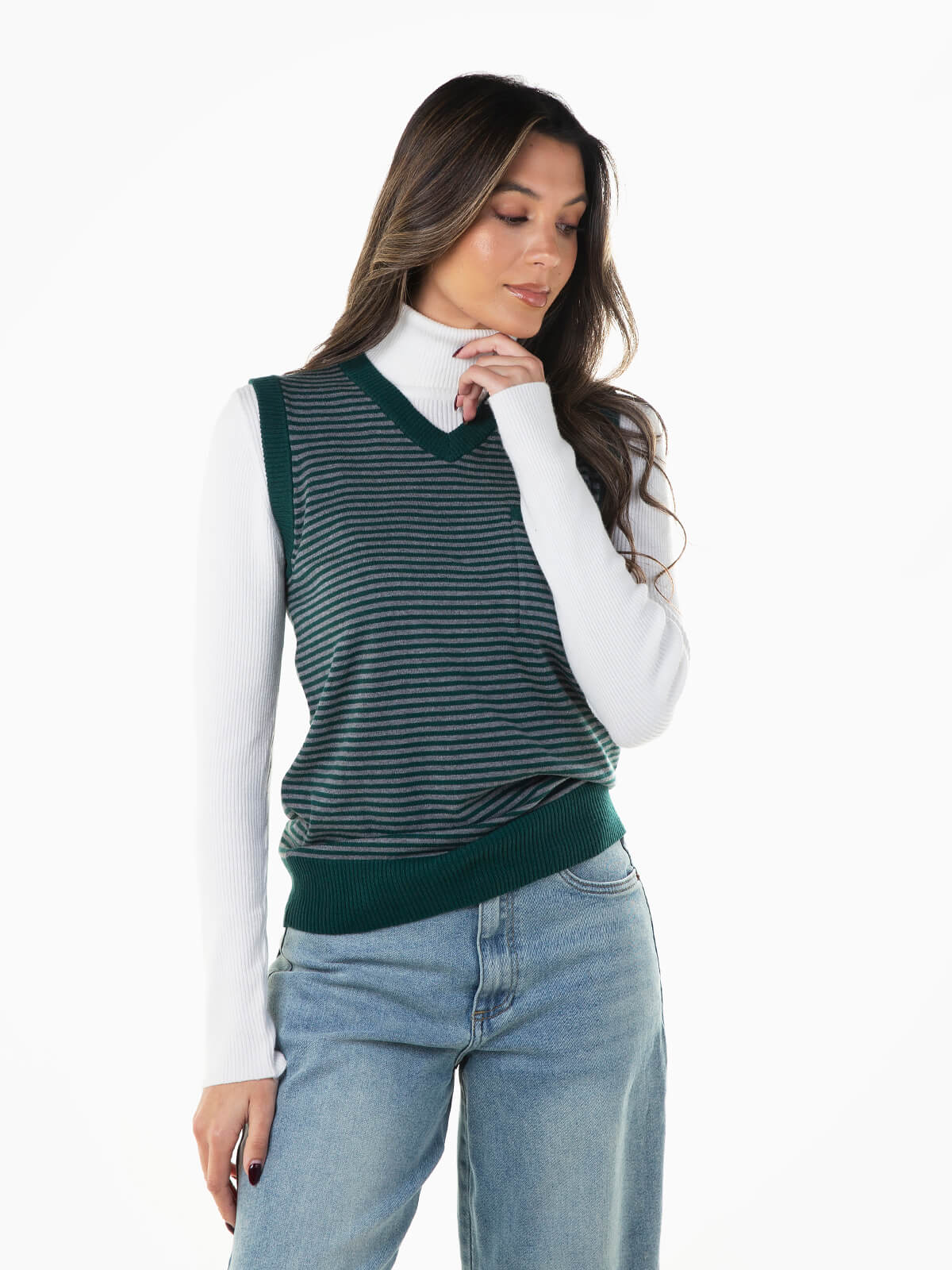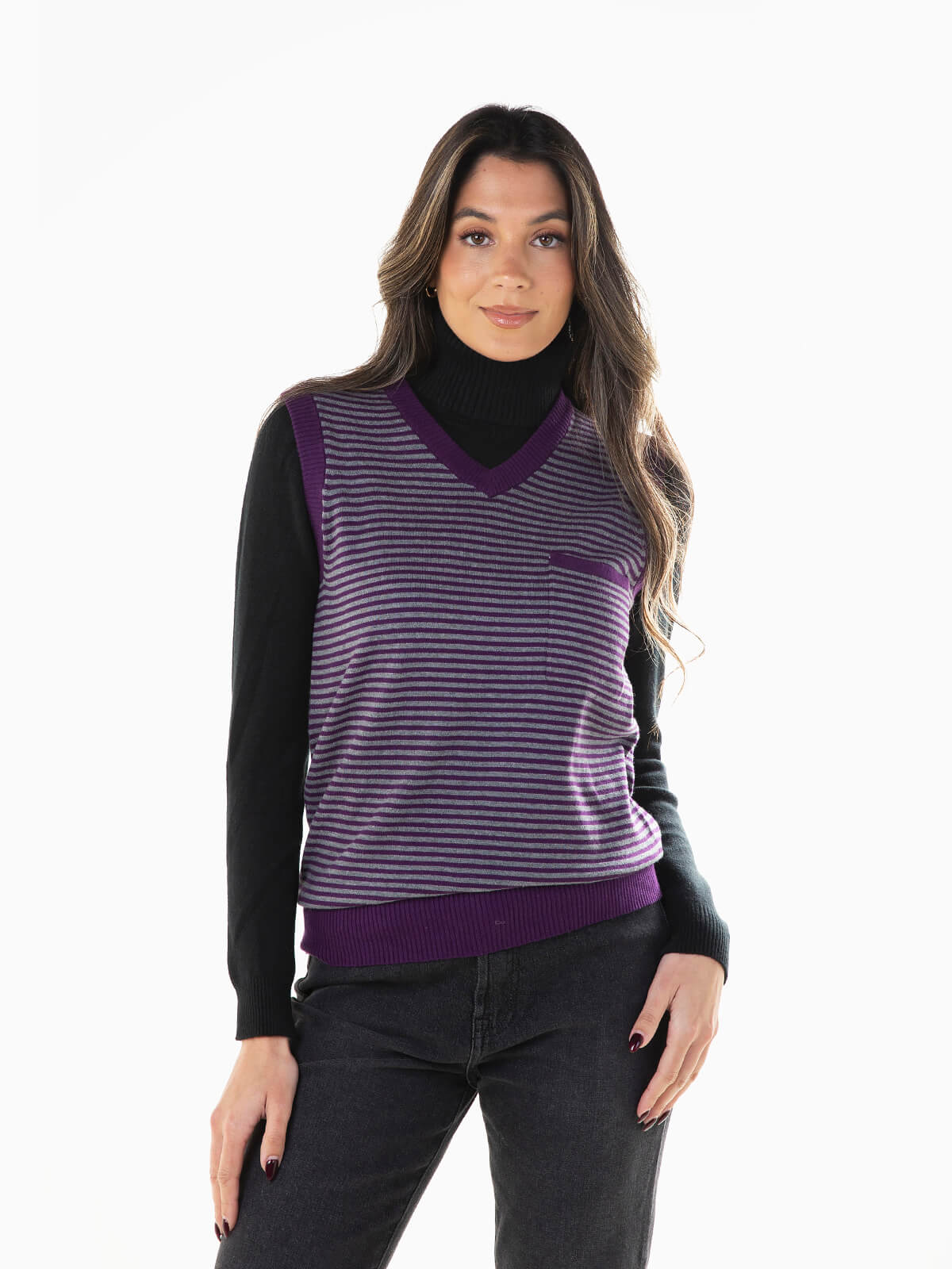 Colete de malha às riscas com bolso no peito. Colete para mulher com decote em V e acabamentos canelados.