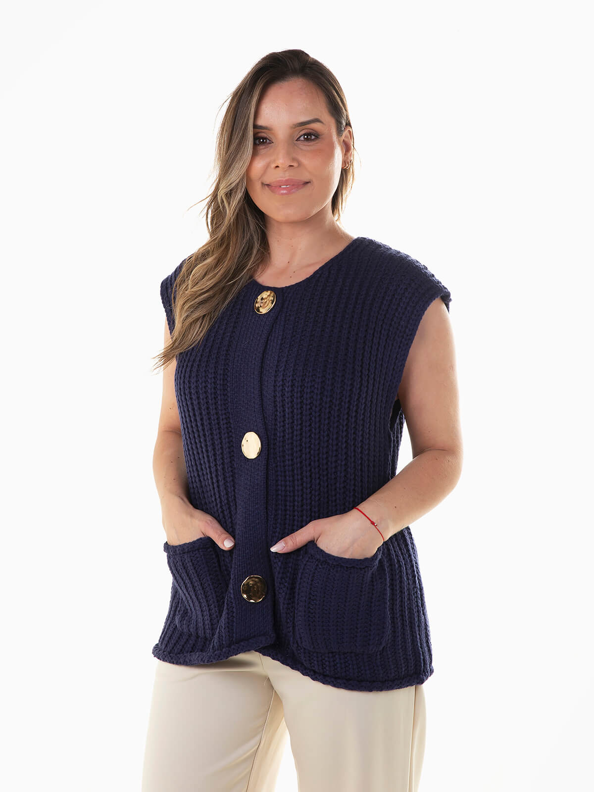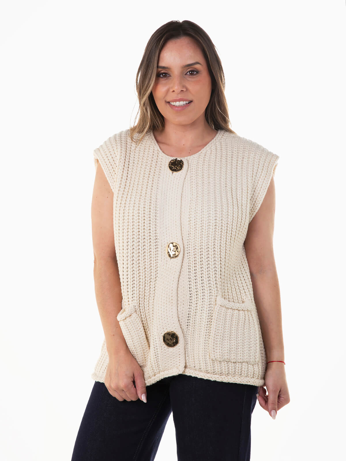 Colete malha grossa trançada com aperto de botões dourados. Colete para senhora com decote redondo e 2 bolsos quadrados.