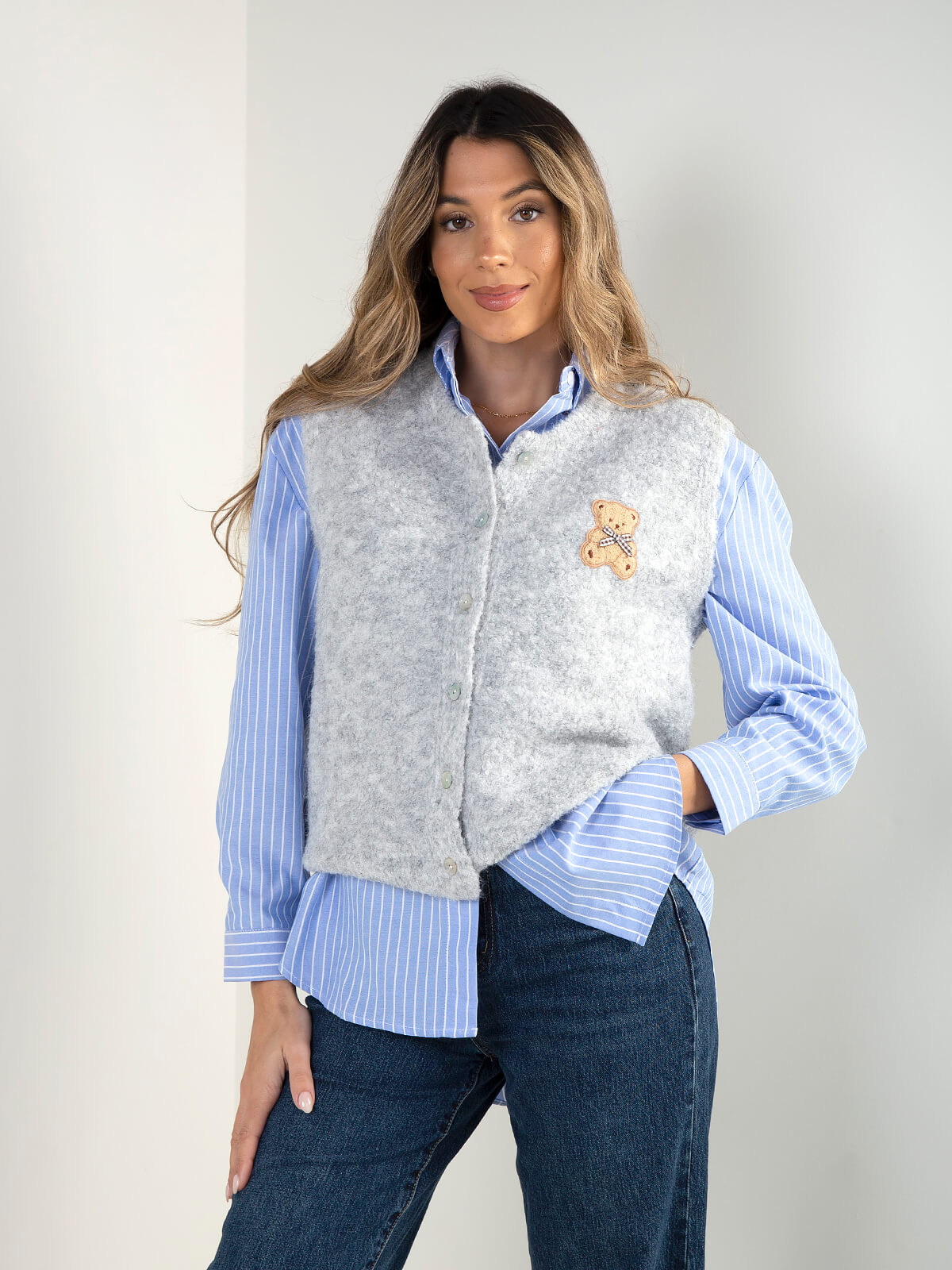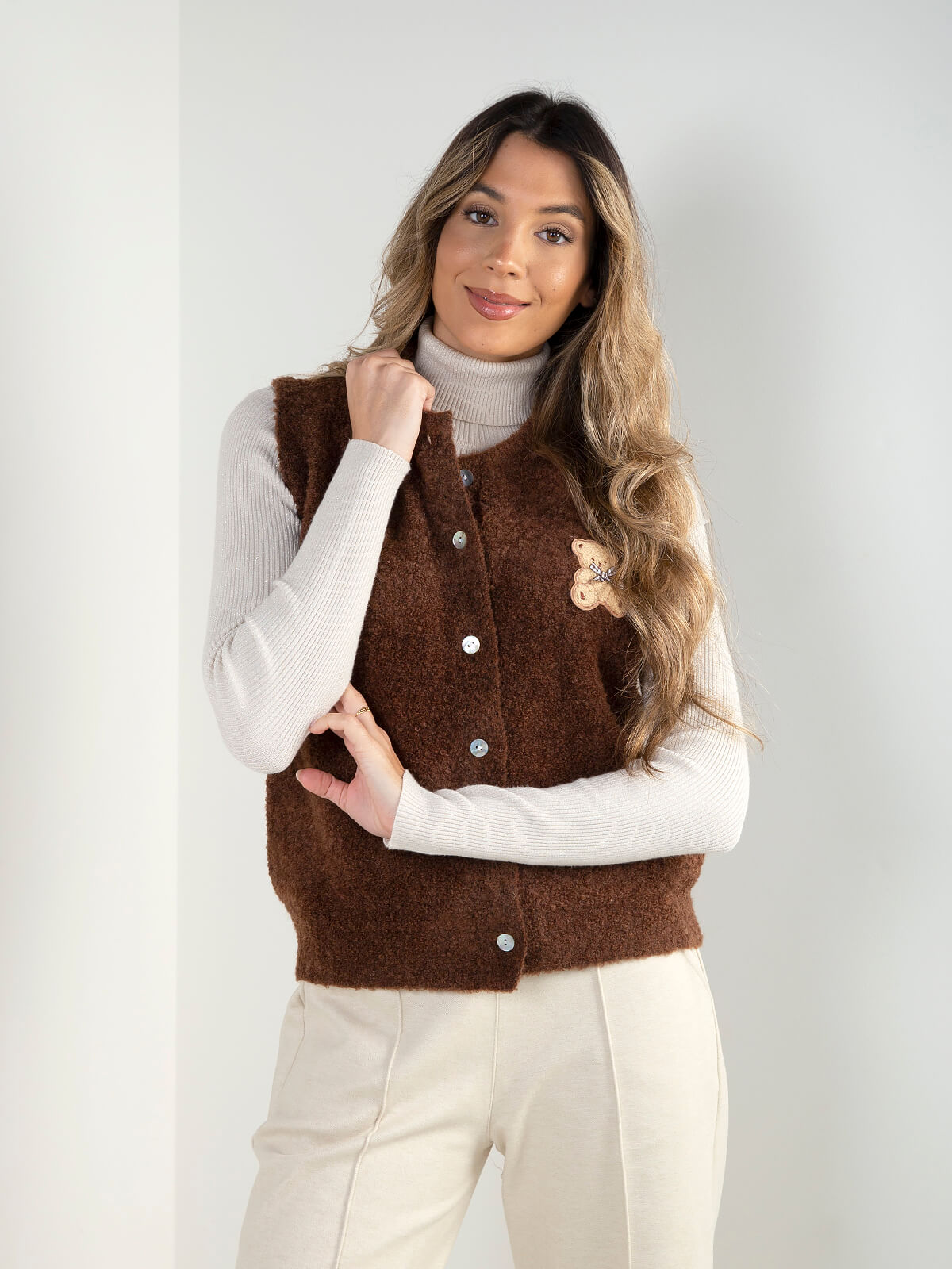 Colete de malha com aplicação de urso, toque macio e fecho frontal com botões. Modelo confortável e versátil para looks de inverno, ideal para sobrepor camisolas finas ou golas altas.
