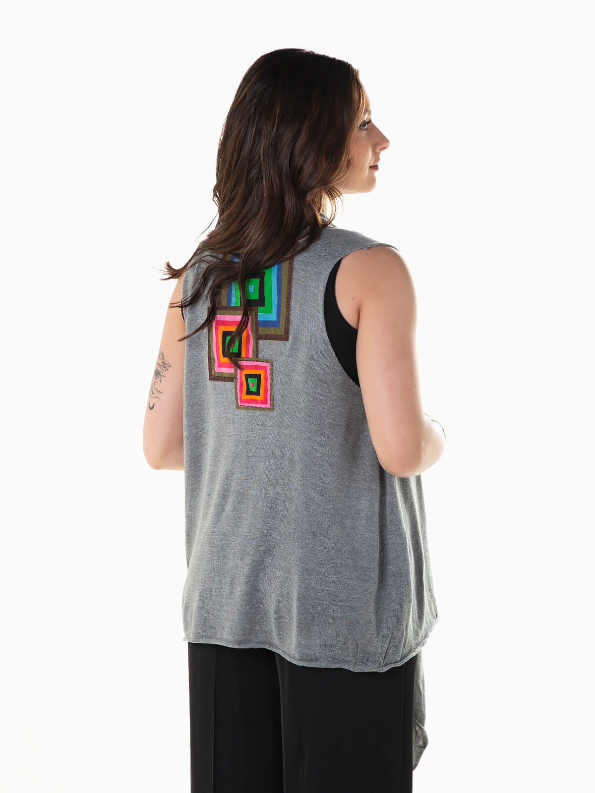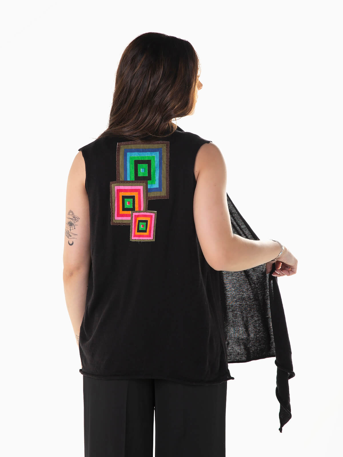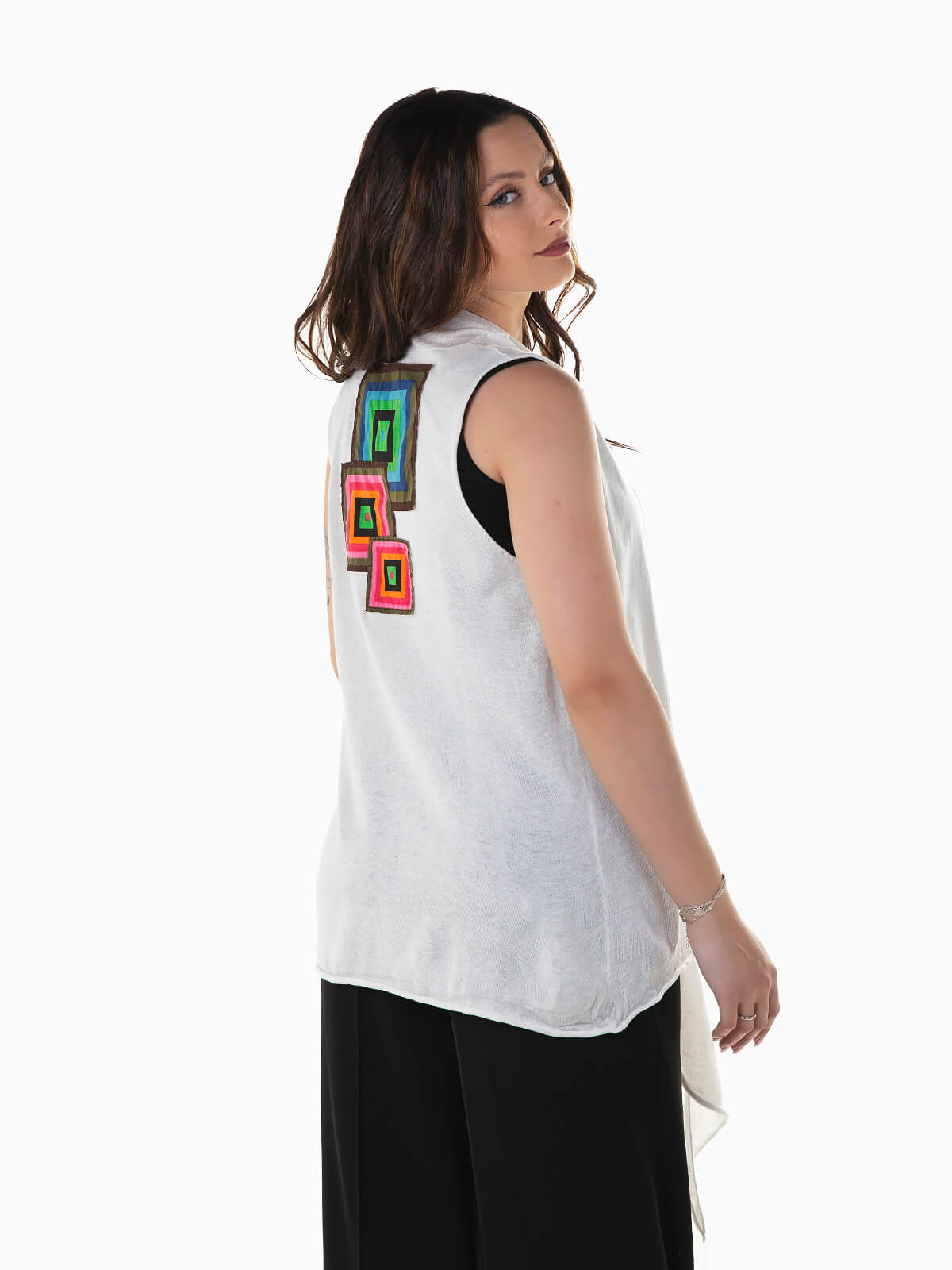 Colete malha com bordados geométricos na parte posterior. Colete manga cava aberto mais comprido à frente.