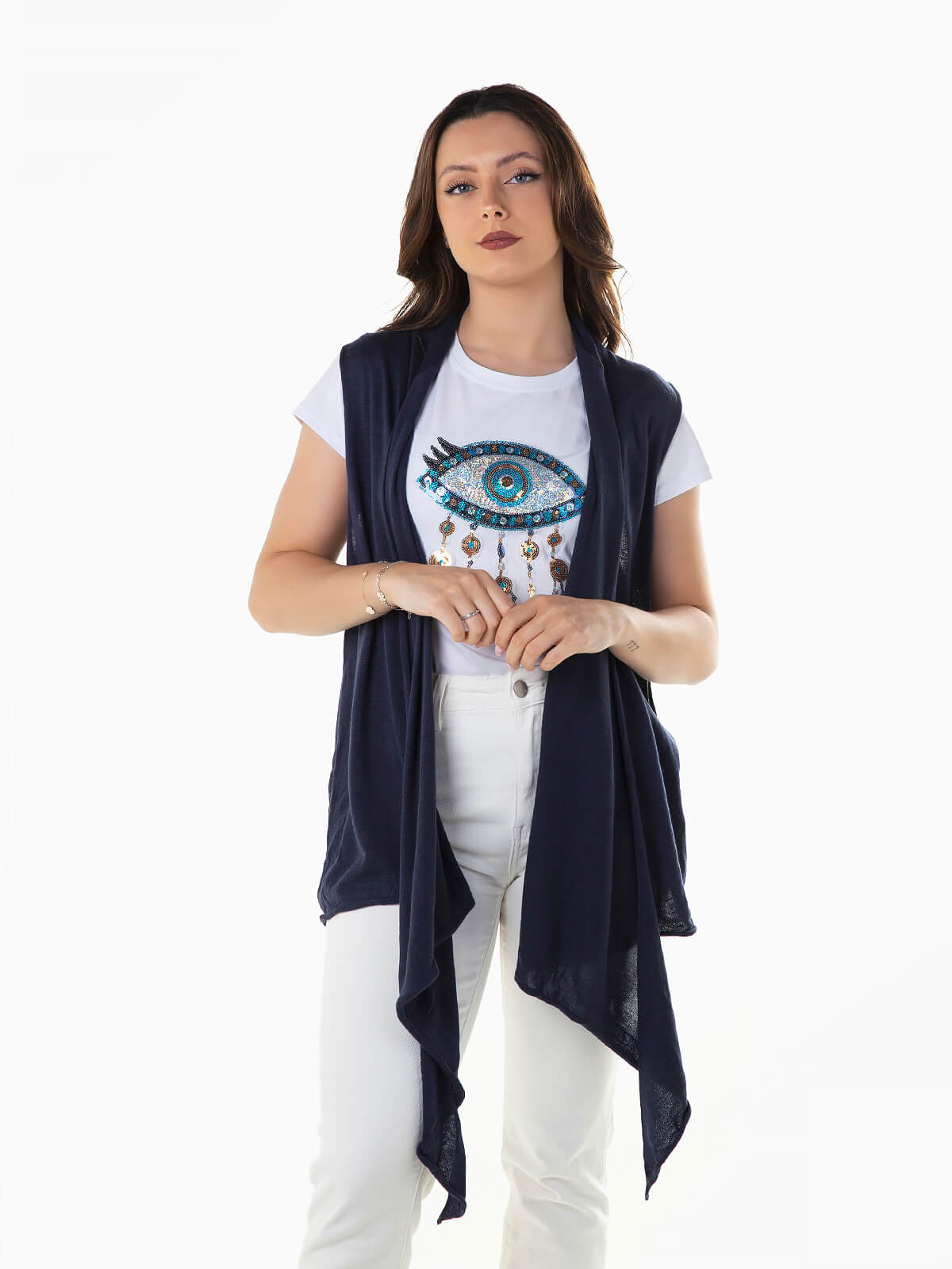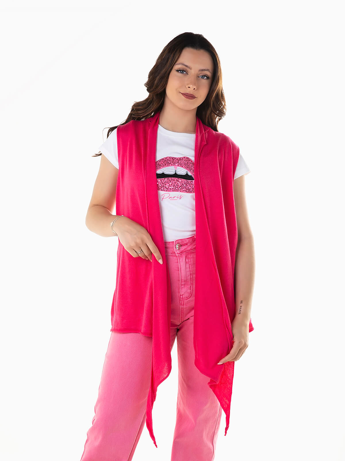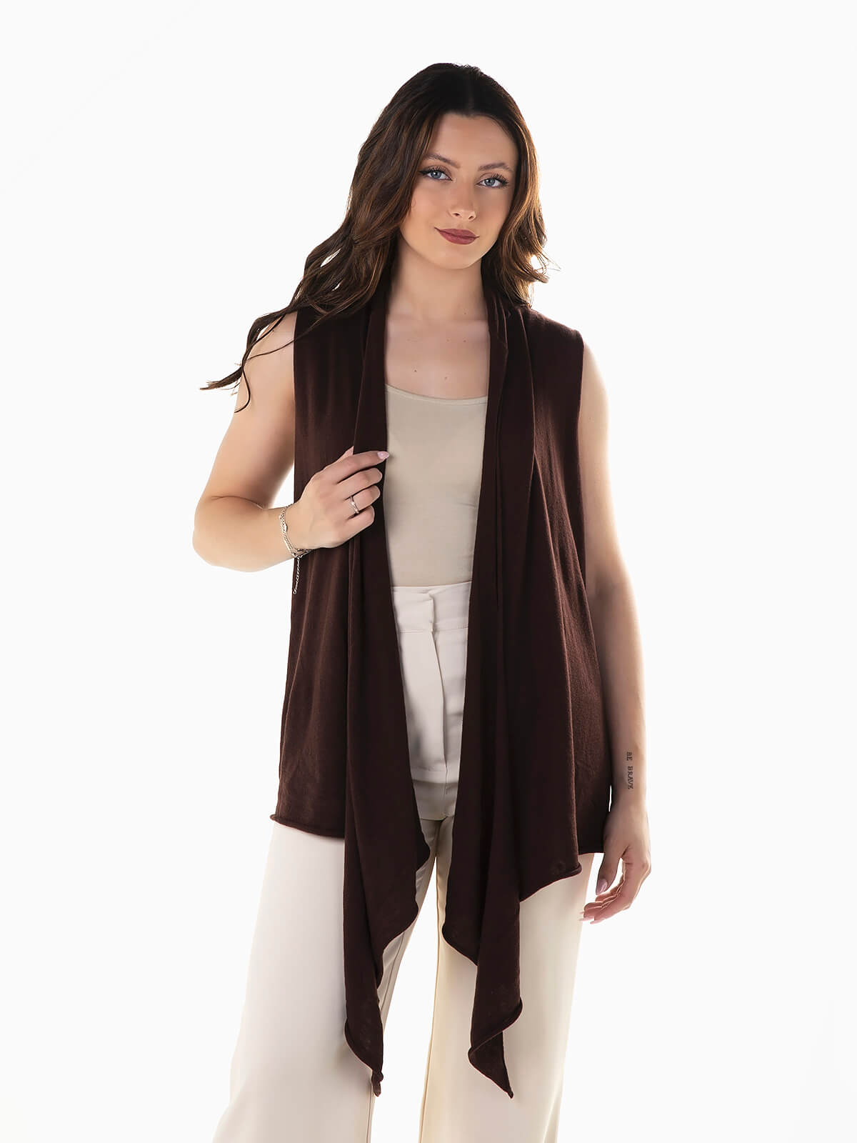 Colete malha com bordados geométricos na parte posterior. Colete manga cava aberto mais comprido à frente.