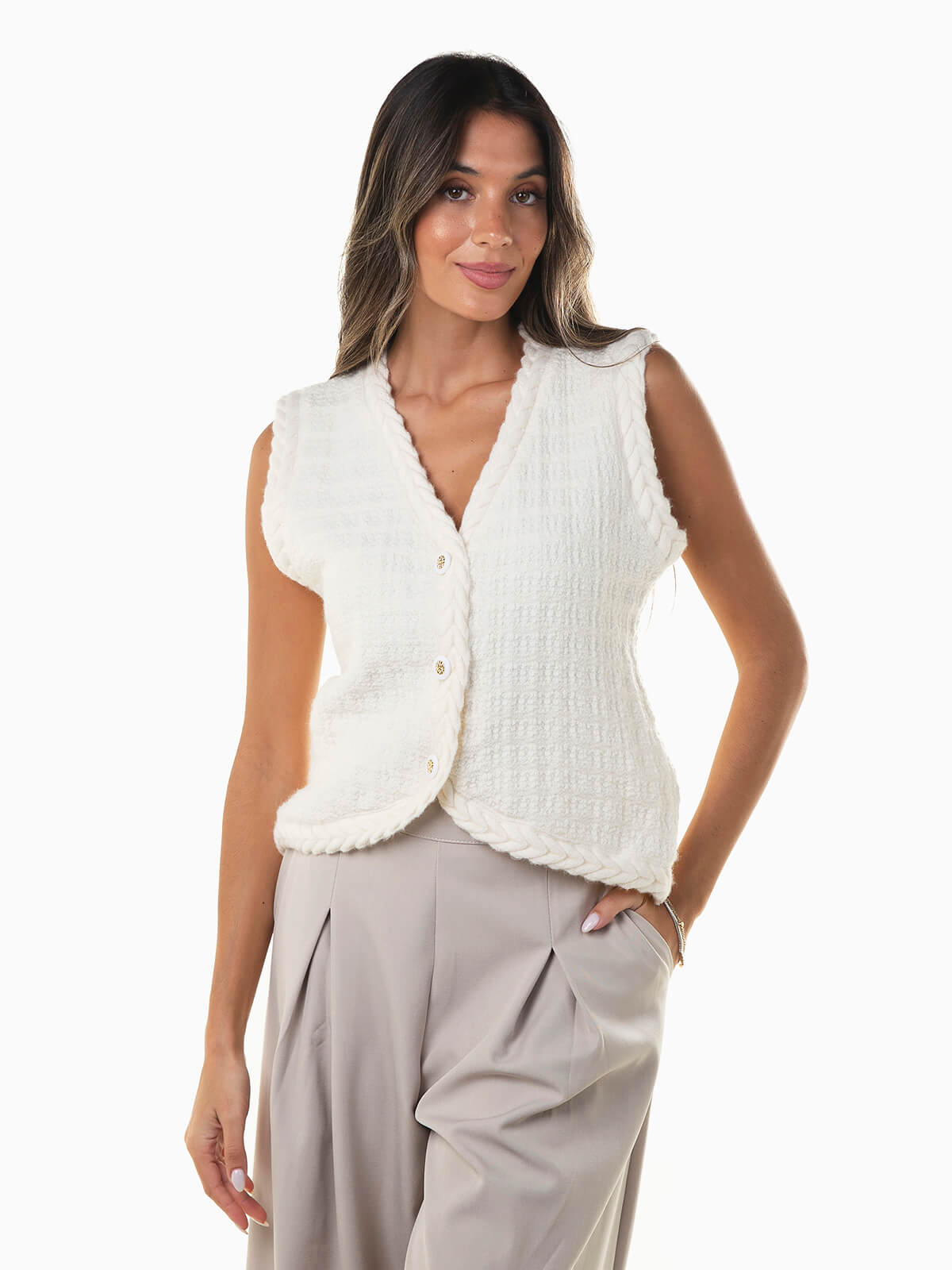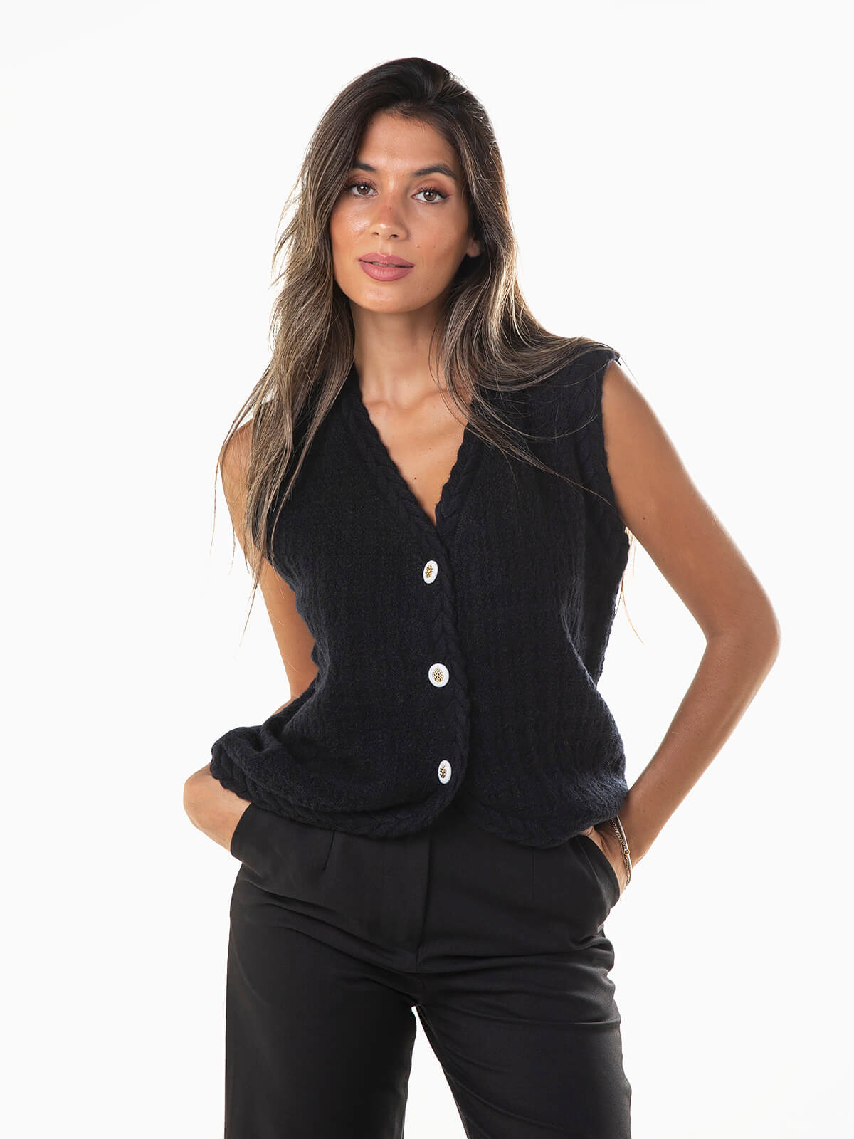 Colete com textura e malha trançada nas extremidades. Colete para mulher com decote em V e aperto frontal e botões.