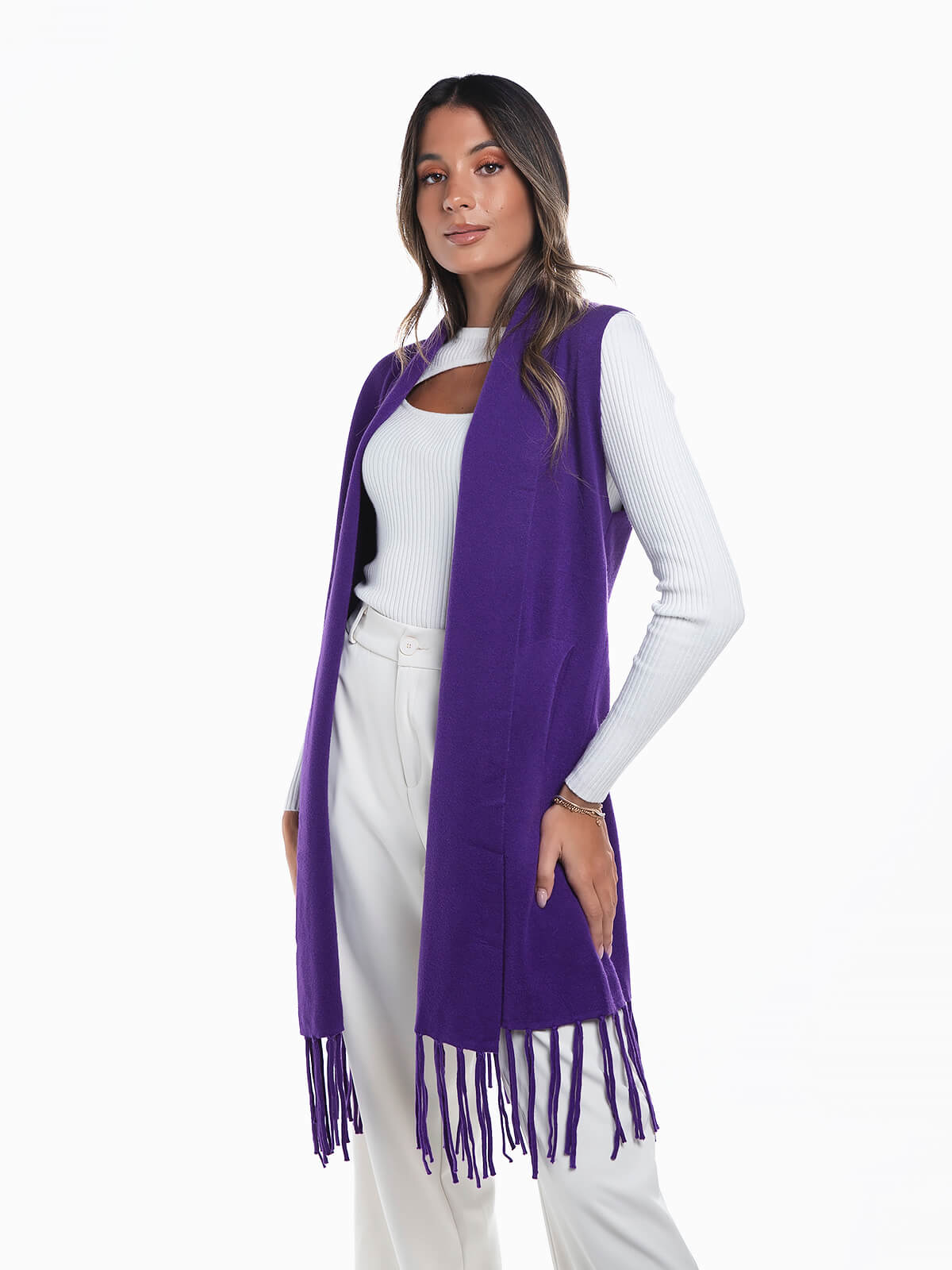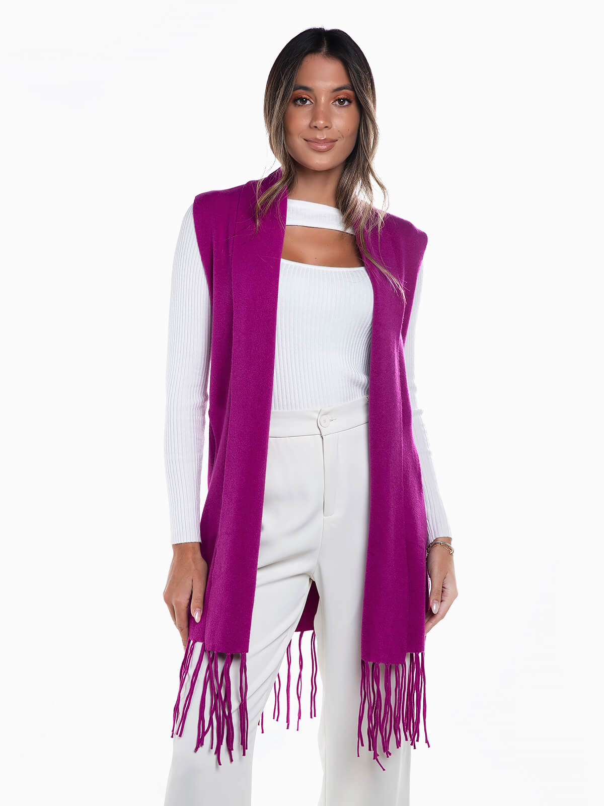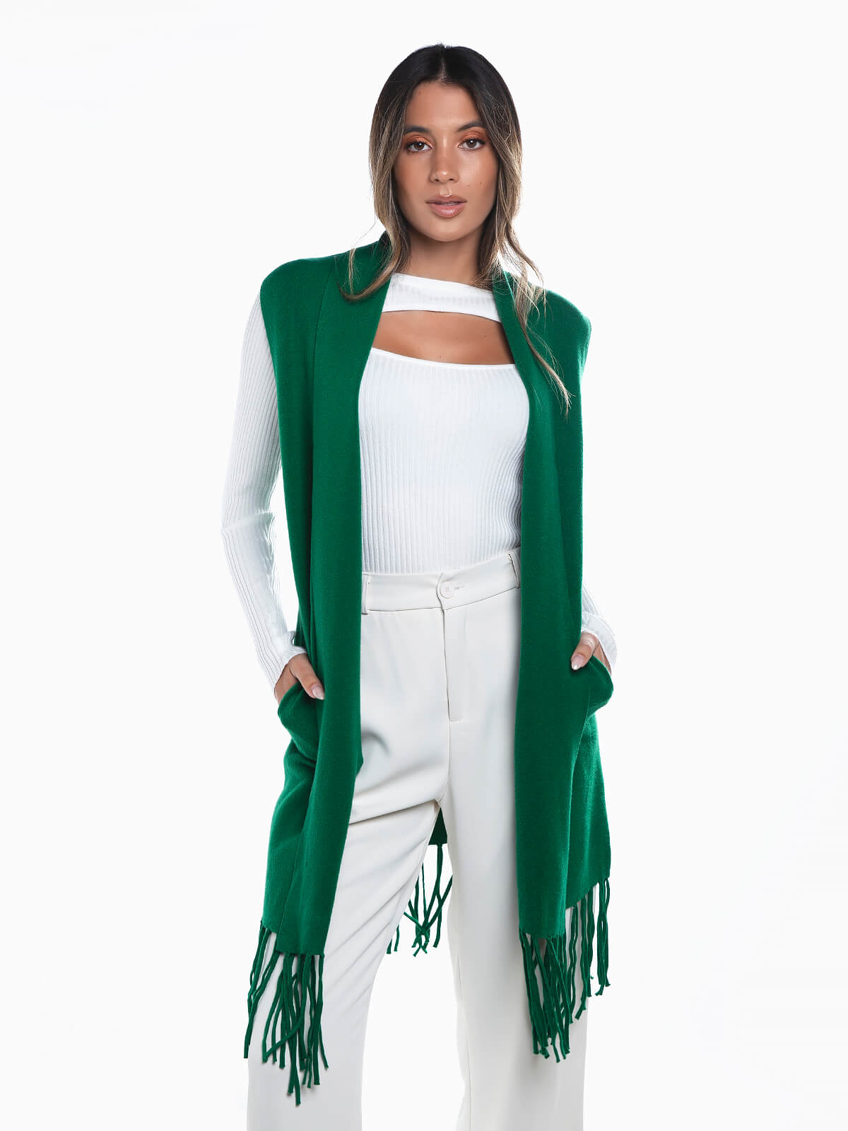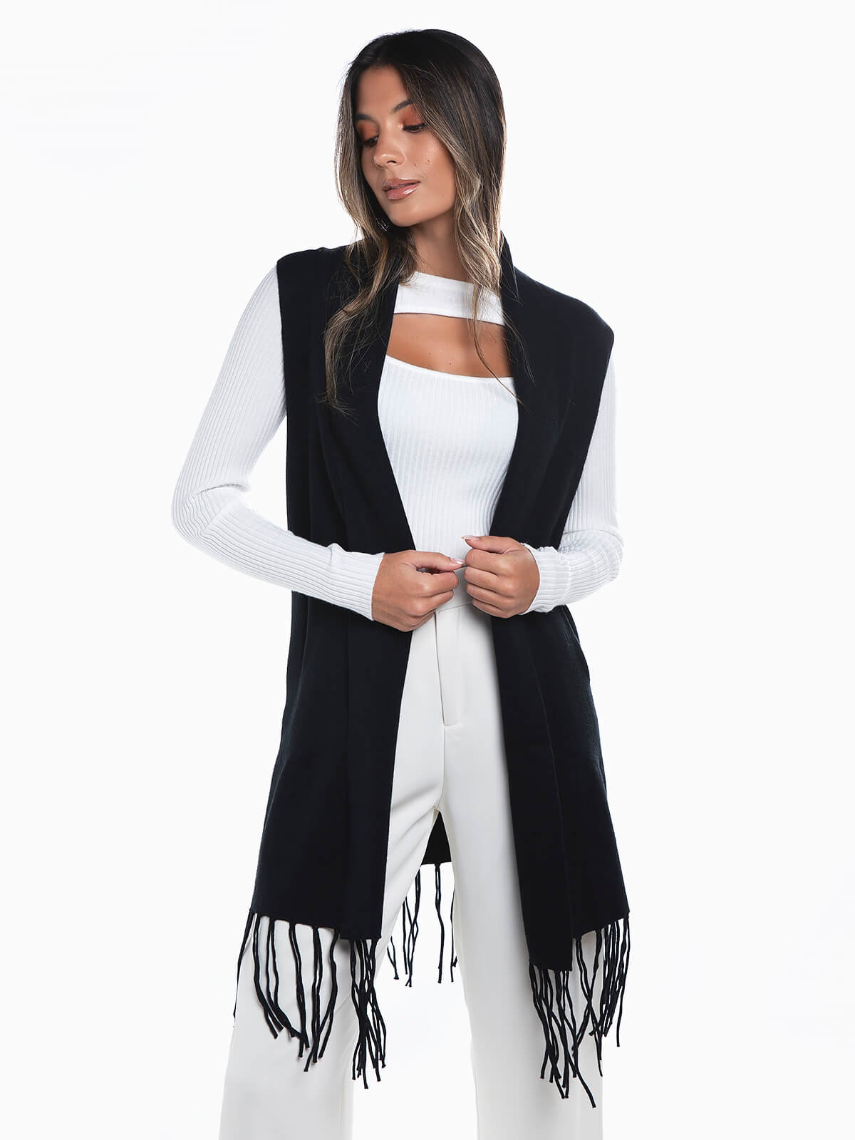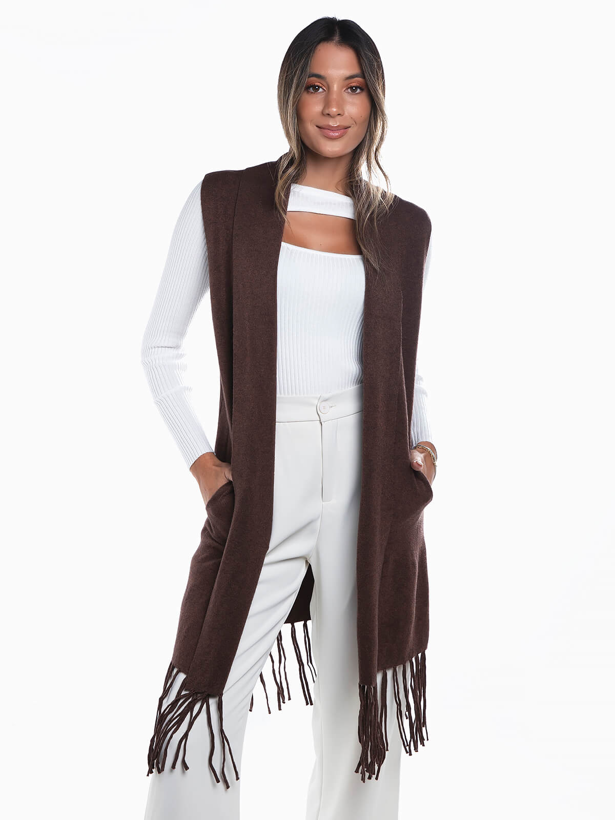 Colete de malha com franjas na base. Colete comprido aberto de manga cava com 2 bolsos.