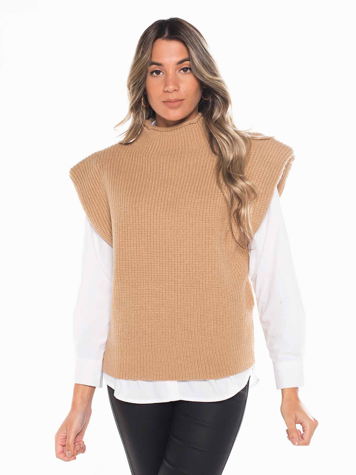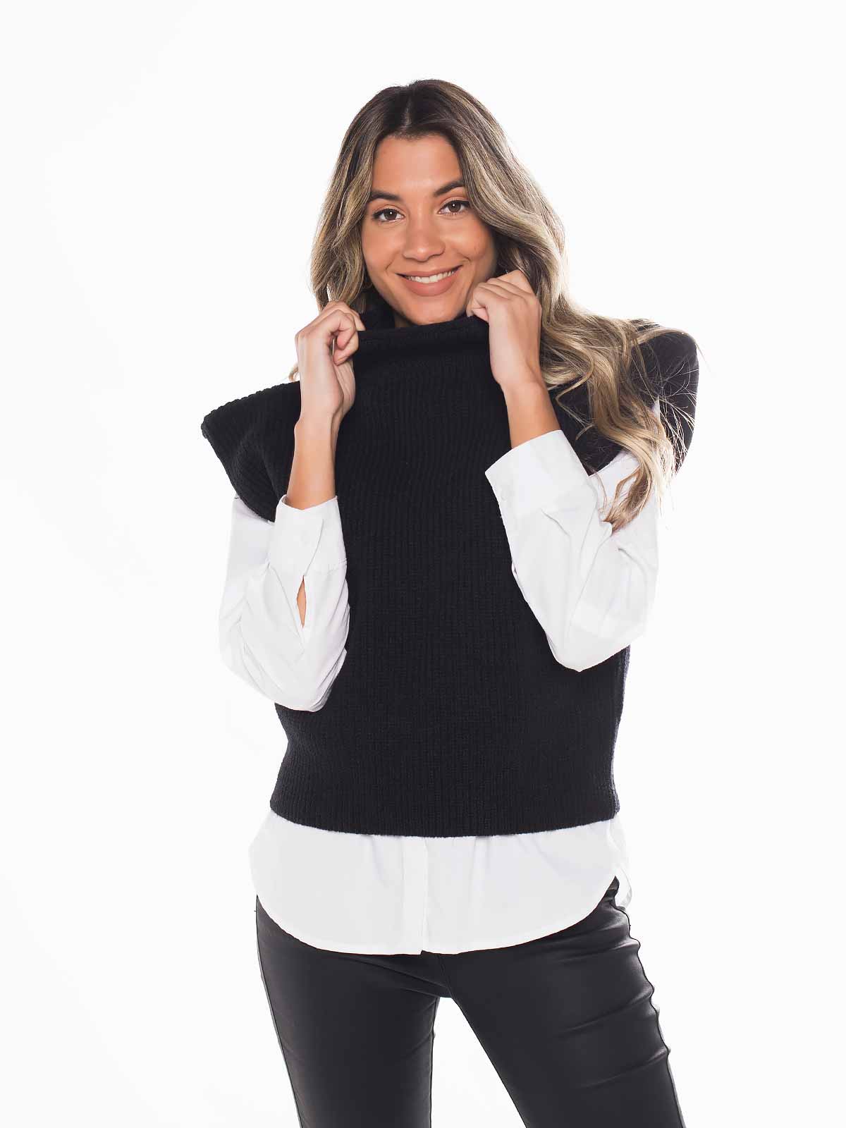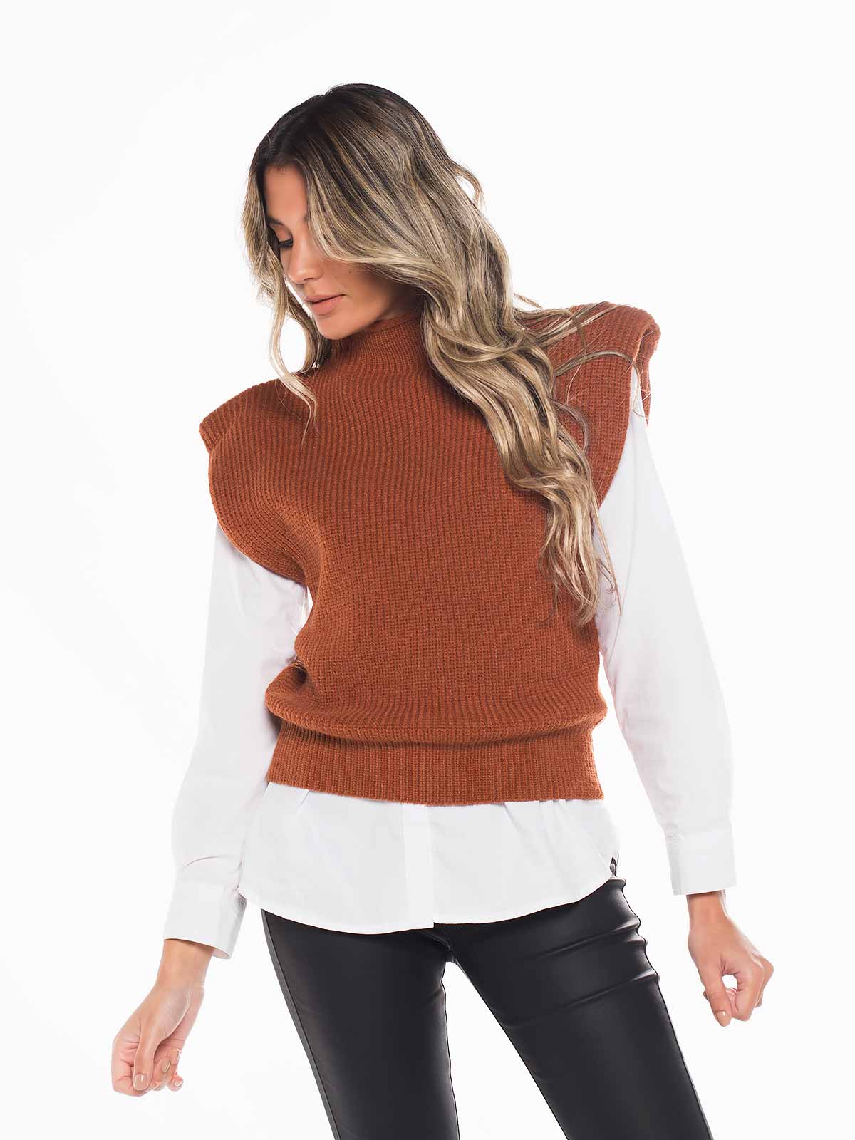 Colete de malha com ombreiras shoulder pad. Colete de malha com gola alta.