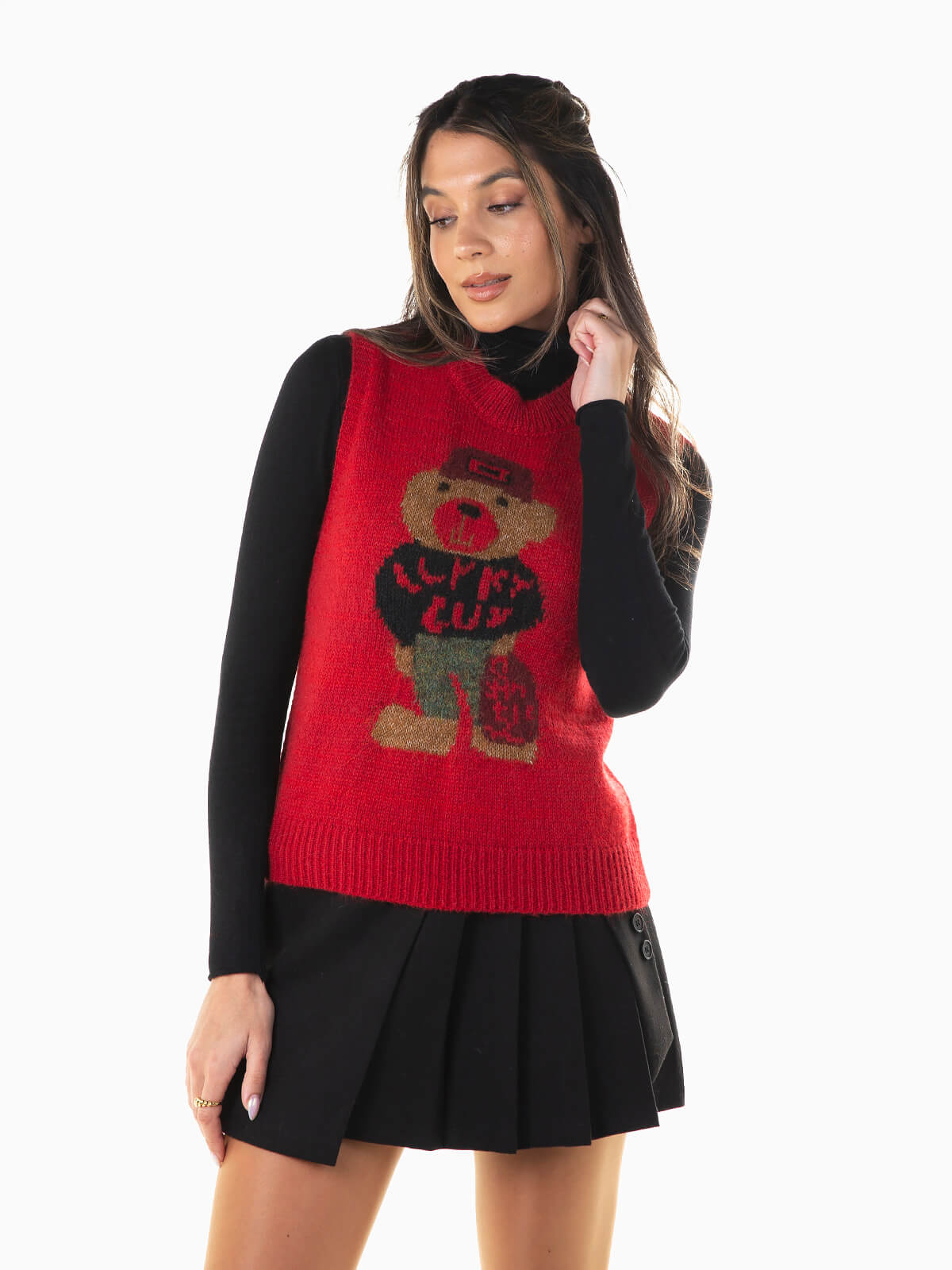 Colete de malha com mistura de lã. Colete para mulher com urso no peito. Acabamentos canelados. Decote redondo.
