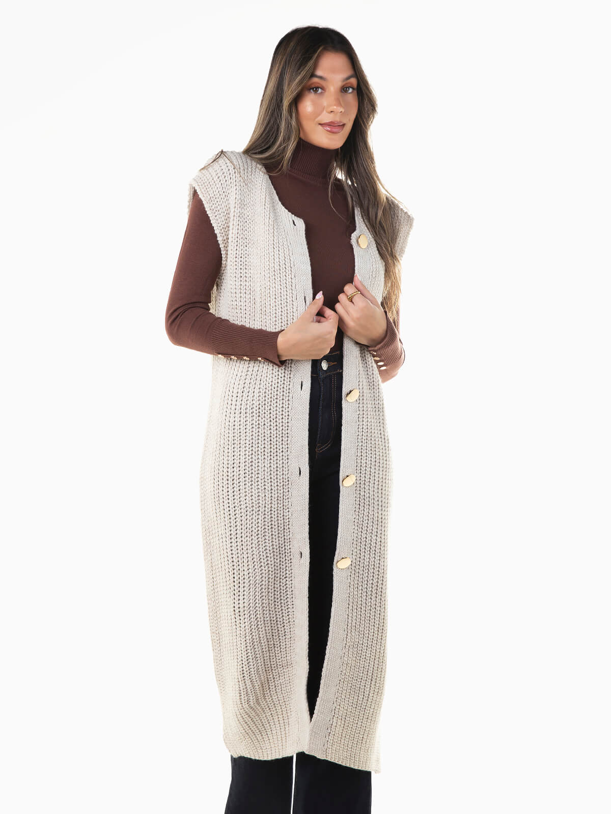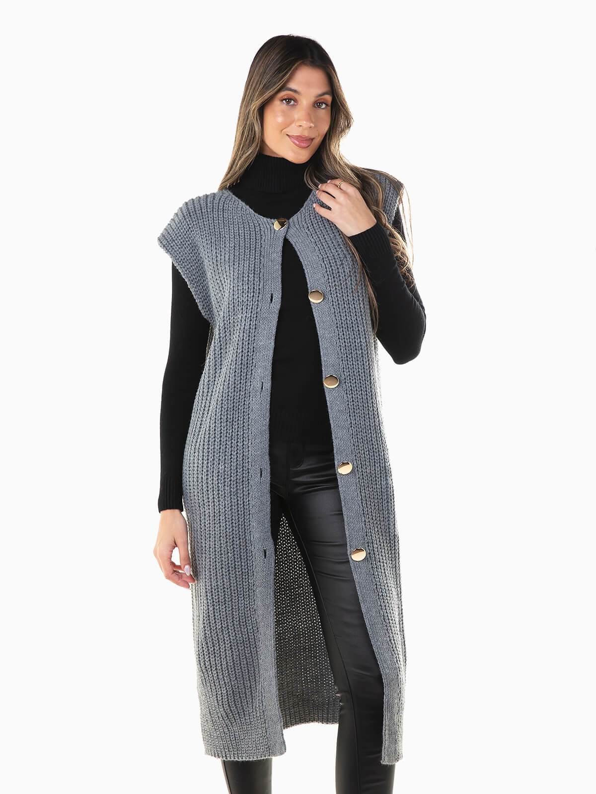 Colete malha comprido com aperto de botões dourados. Colete de manga cava com decote redondo.