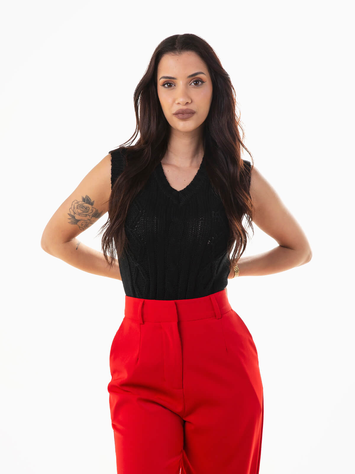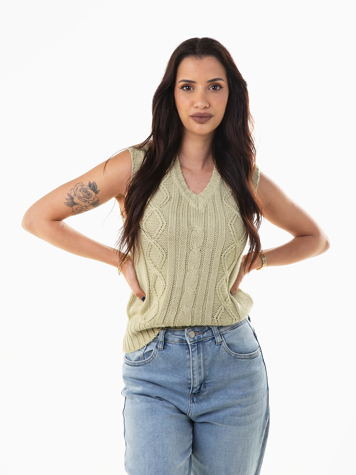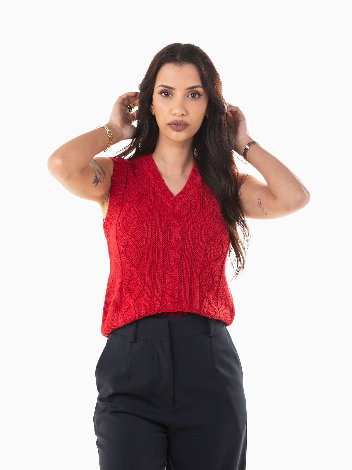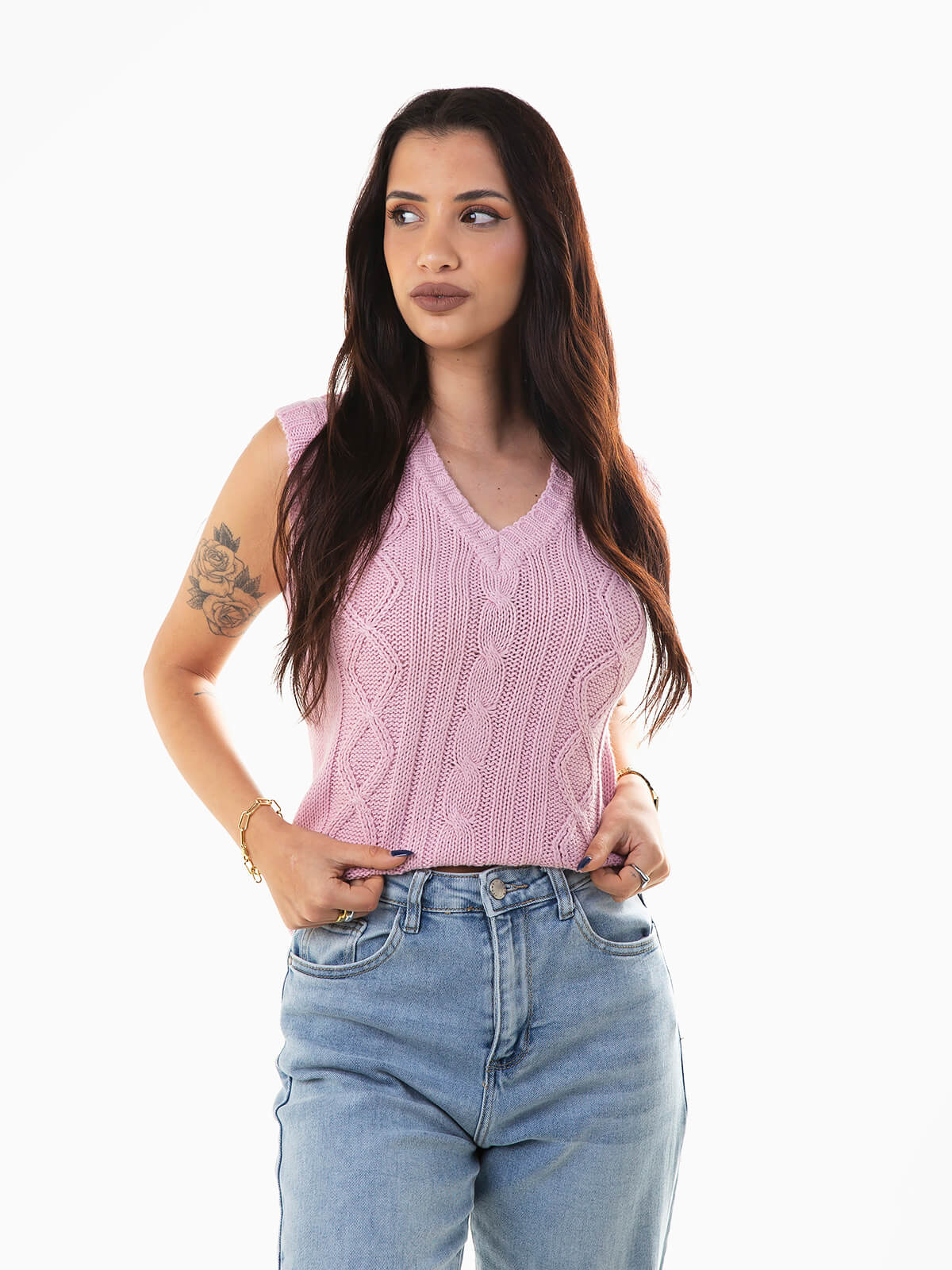 Colete malha trançada com decote em V para mulher. Colete com acabamentos canelados.