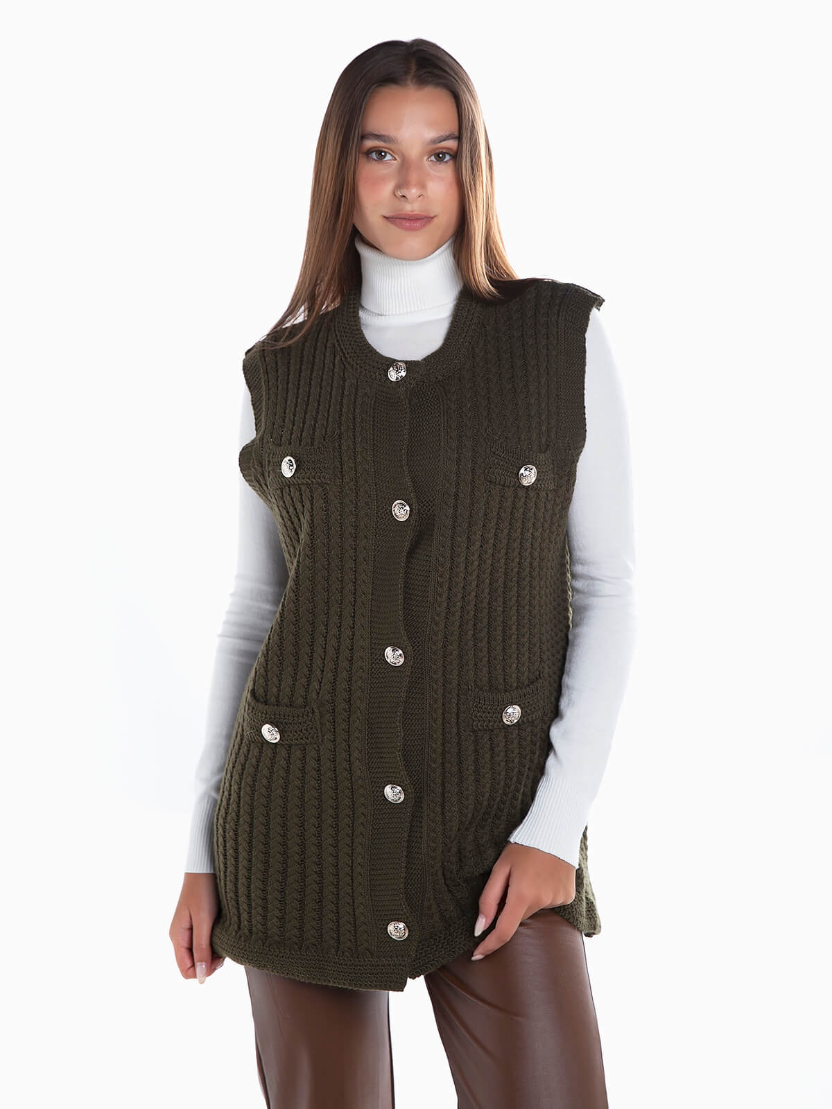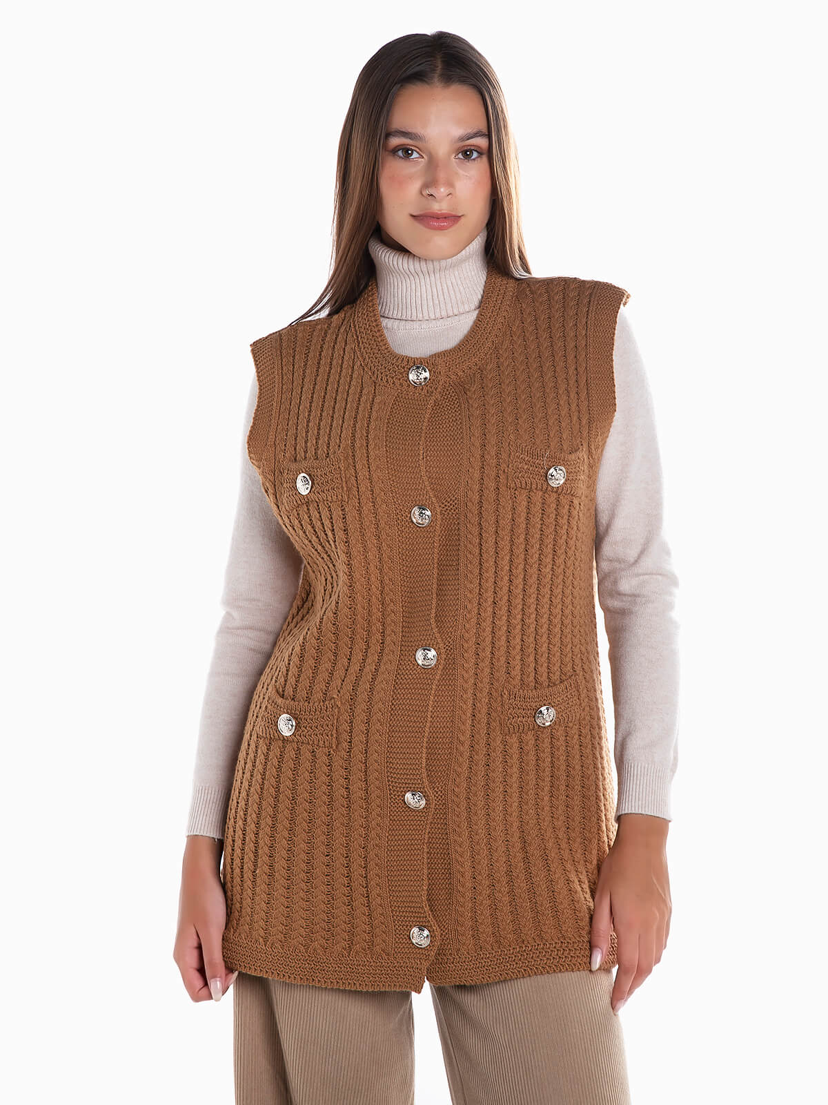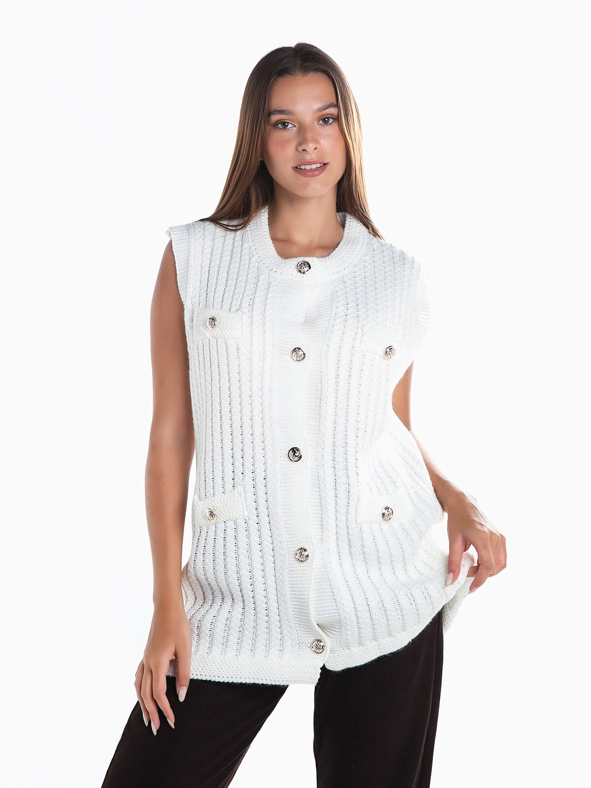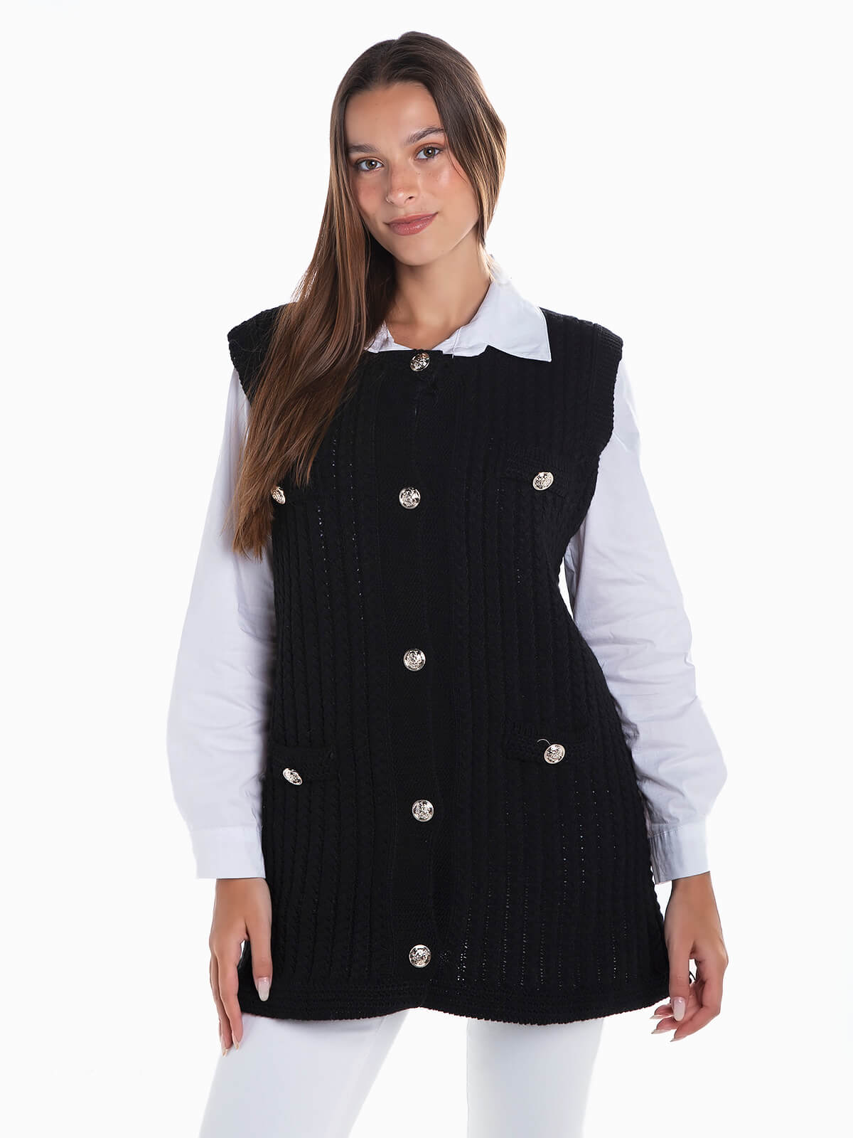Colete em malha entrançada com aperto botões prateados em contraste. Colete manga cava com decote redondo. Corte comprido.
