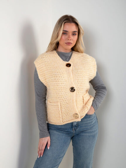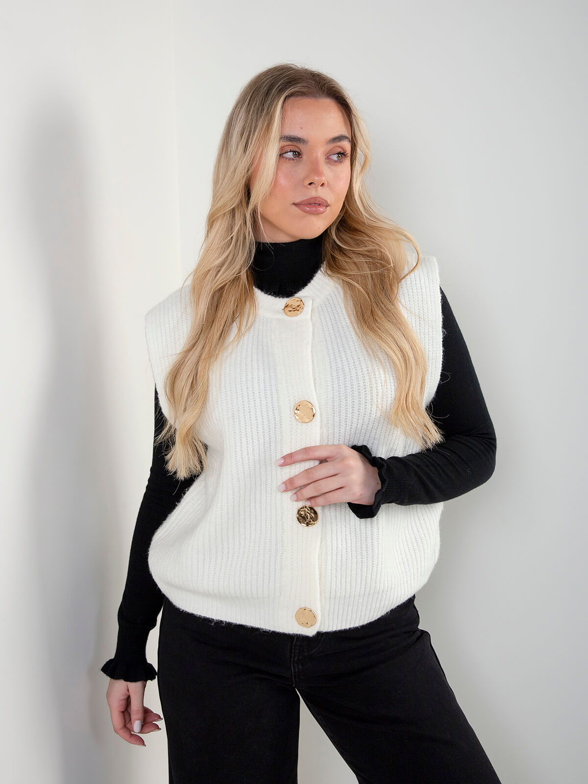 Colete de malha em tom pérola com decote redondo e fecho frontal por botões dourados. Modelo versátil, ideal para usar sobre camisolas, blusas ou vestidos, adaptando-se facilmente a looks casuais ou mais cuidados. Um essencial de meia-estação com um toque clássico.