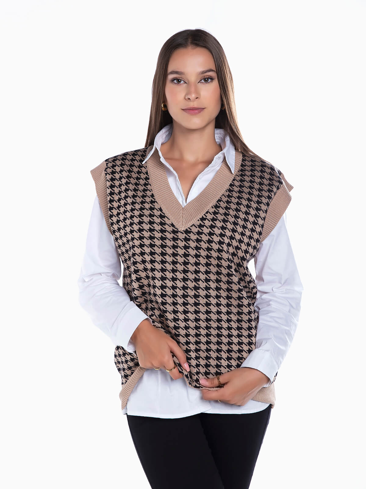 Colete de malha estampado pied-de-poule. Colete malha com decote em V.