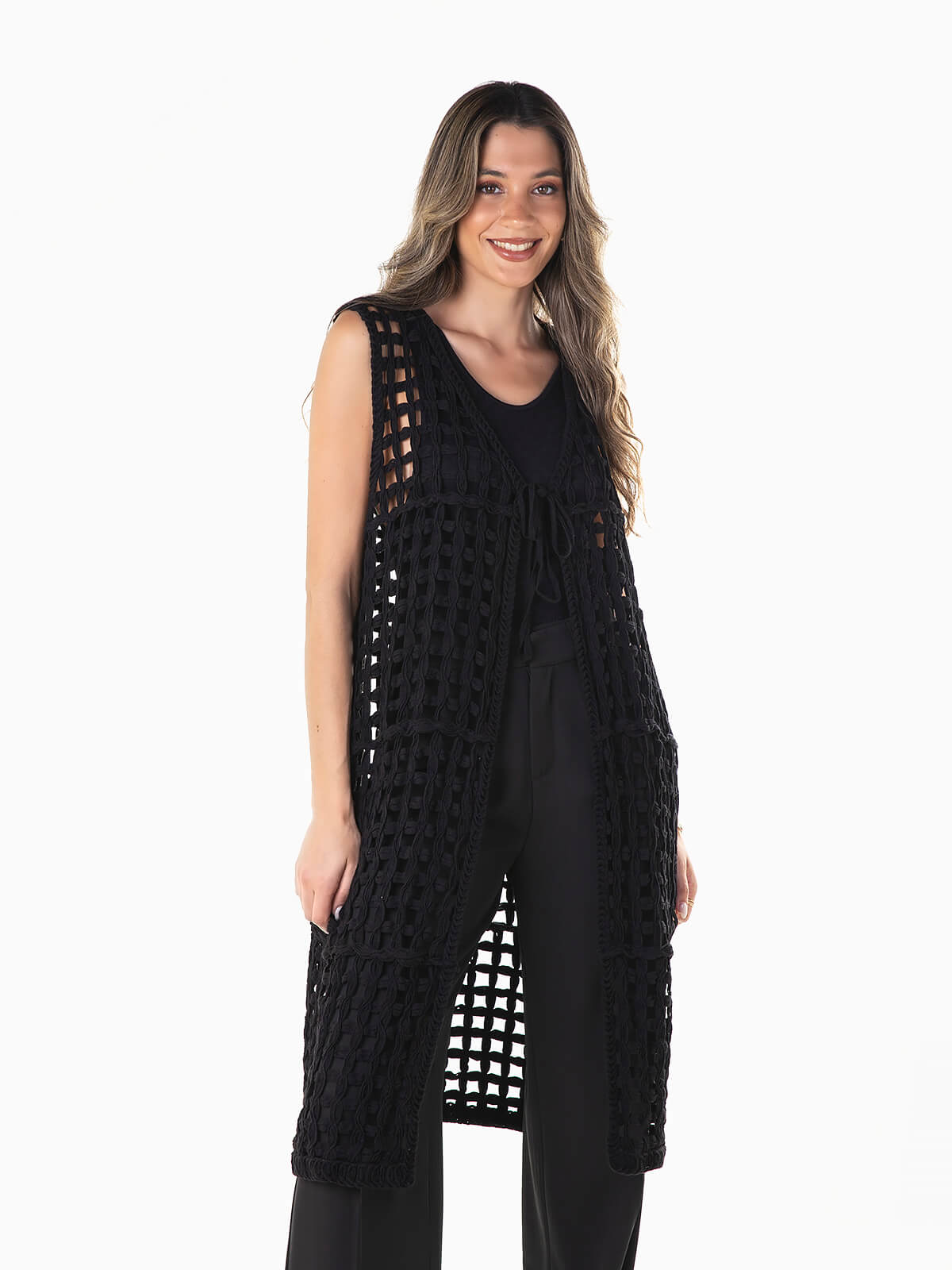 Colete em malha de ponto aberto para senhora. Colete comprido com decote em bico e aperto de cordão.