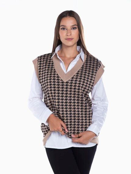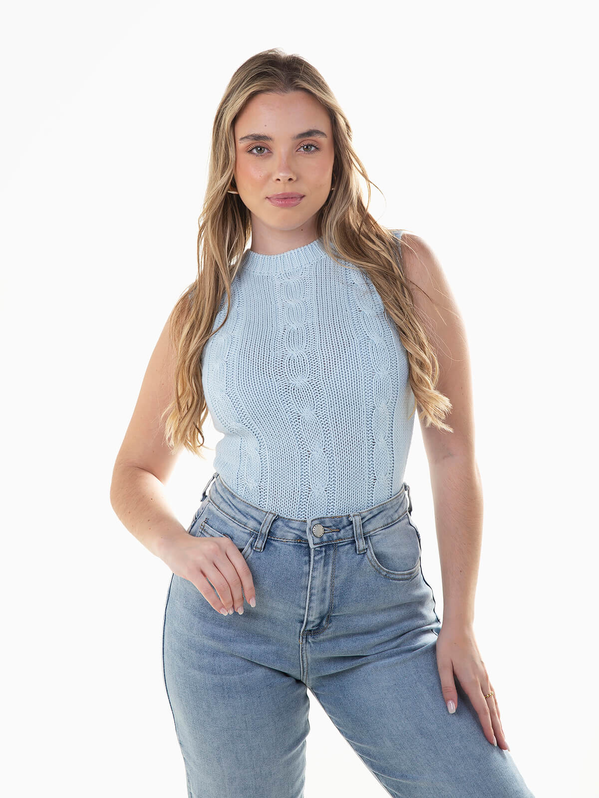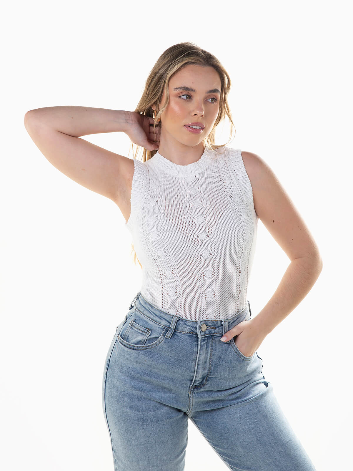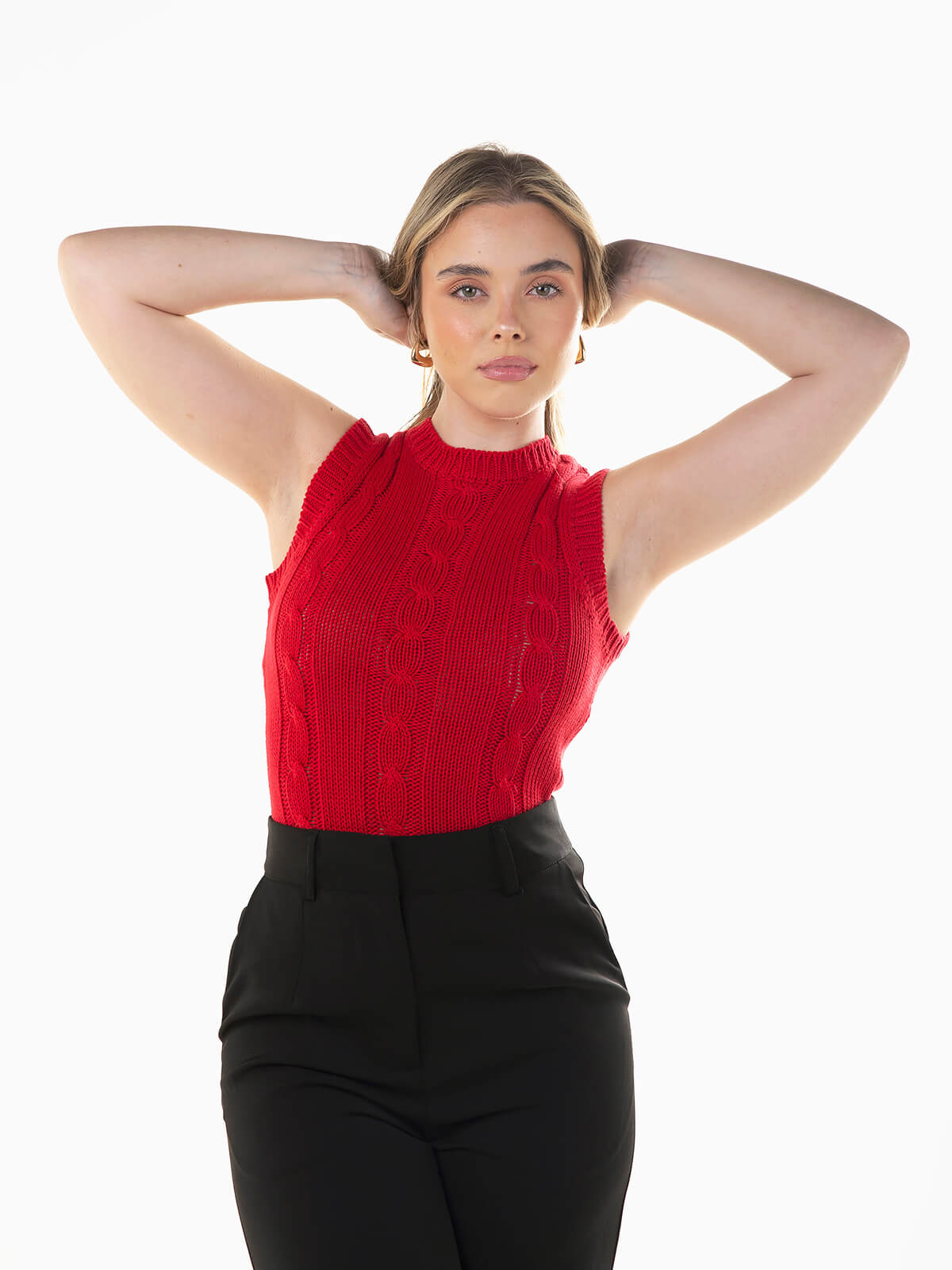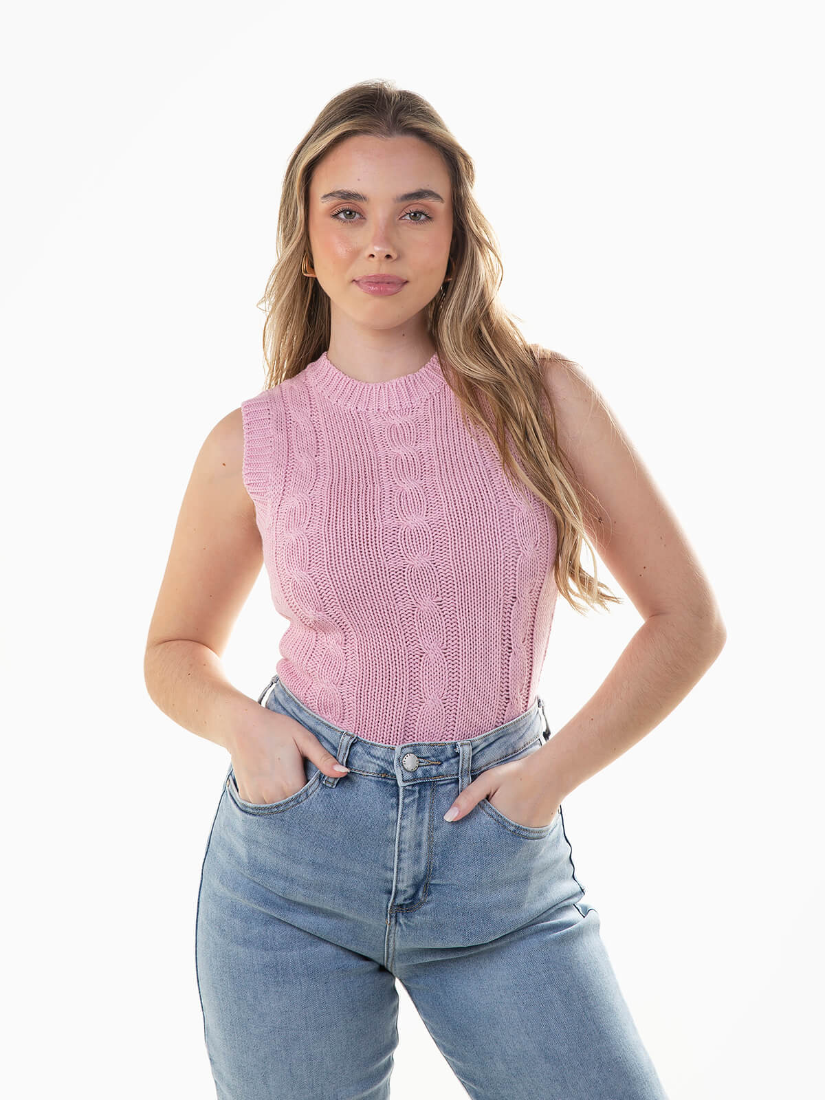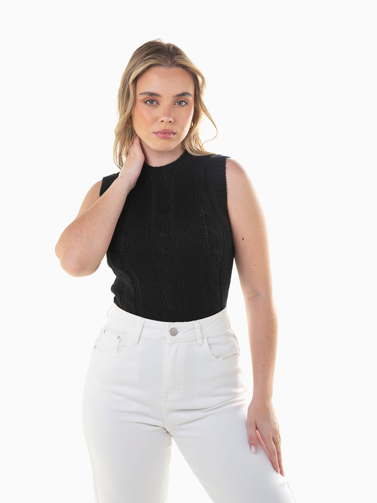 Colete malha trançada para senhora. Colete manga cava com decote redondo e acabamentos canelados.