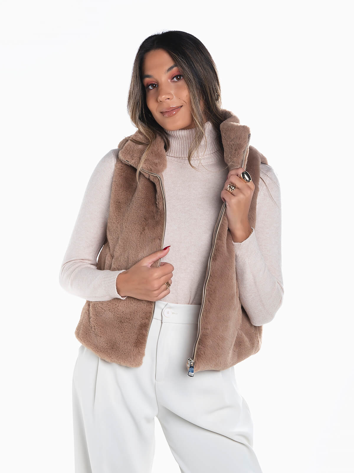 Colete em pelo sintético com gola subida para senhora. Colete manga cava com interior forrado e 2 bolsos. Aperto fecho zíper.