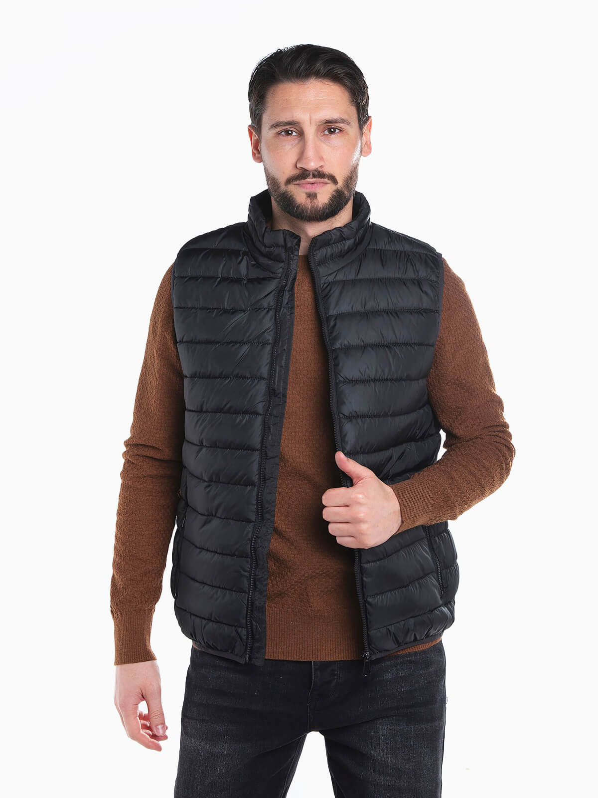 Colete preto acolchoado leve para homem. Colete impermeável com gola subida e 2 bolsos. Aperto de fecho zíper.