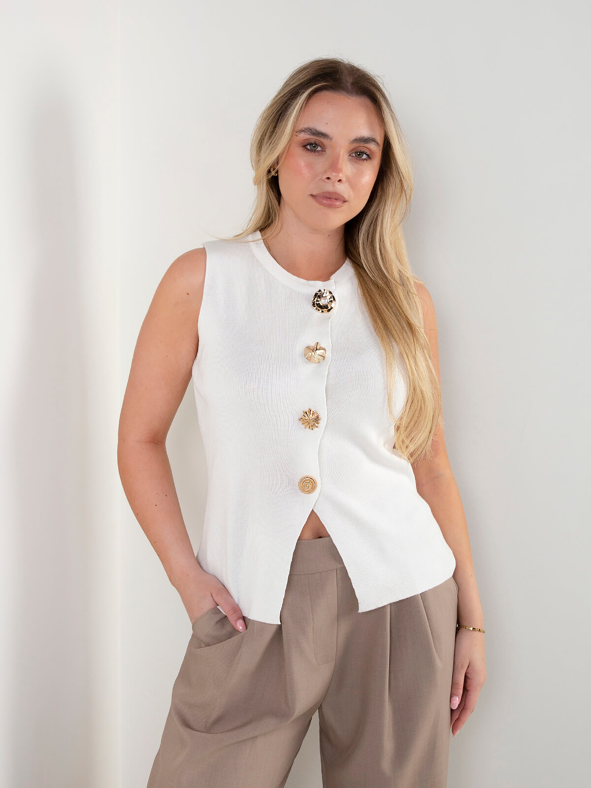 Colete sem mangas com decote redondo e aperto frontal. Destaca-se pelos botões dourados decorativos que acrescentam um toque elegante ao look. Corte direito, ideal para usar sozinho ou em sobreposição para um visual mais atual.