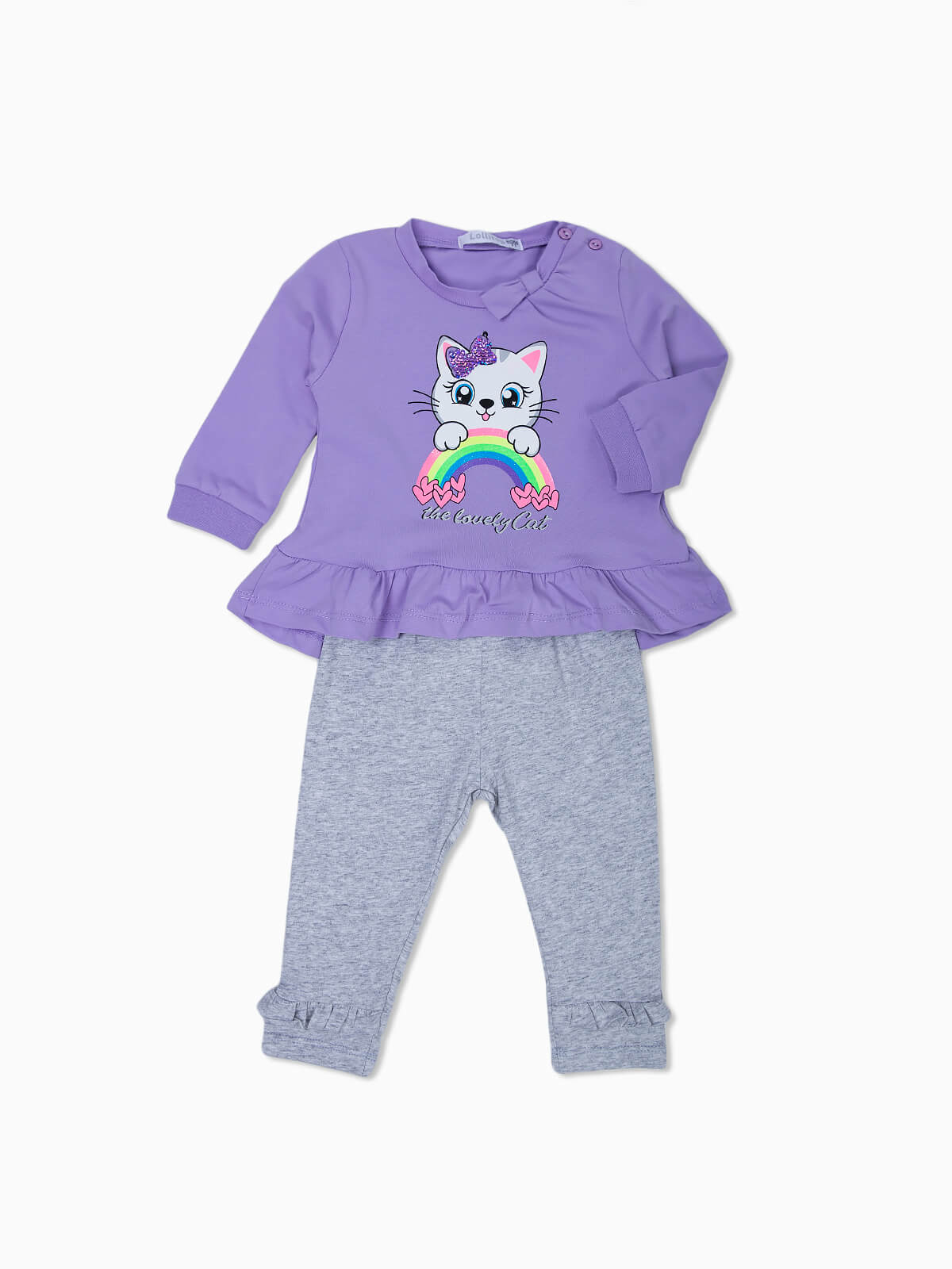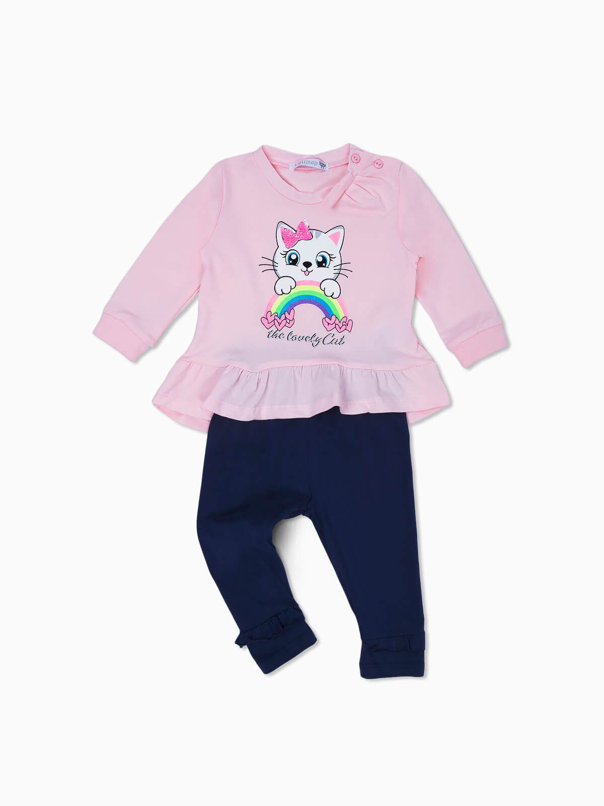 Conjunto de bebé menina composto por 2 peças. Sweatshirt estampada com cós aos folhos. Gola redonda com 2 botões. Punhos elásticos. Leggings com folhos de cintura elástica.