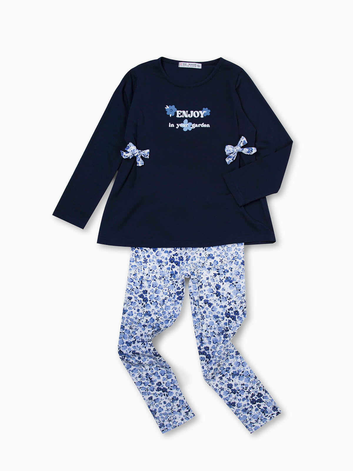 Conjunto de 2 peças para menina em tecido de algodão. T-shirt manga comprida com decote redondo e laços aplicados dos lados. Estampado no peito. Leggings com cintura elástica.
