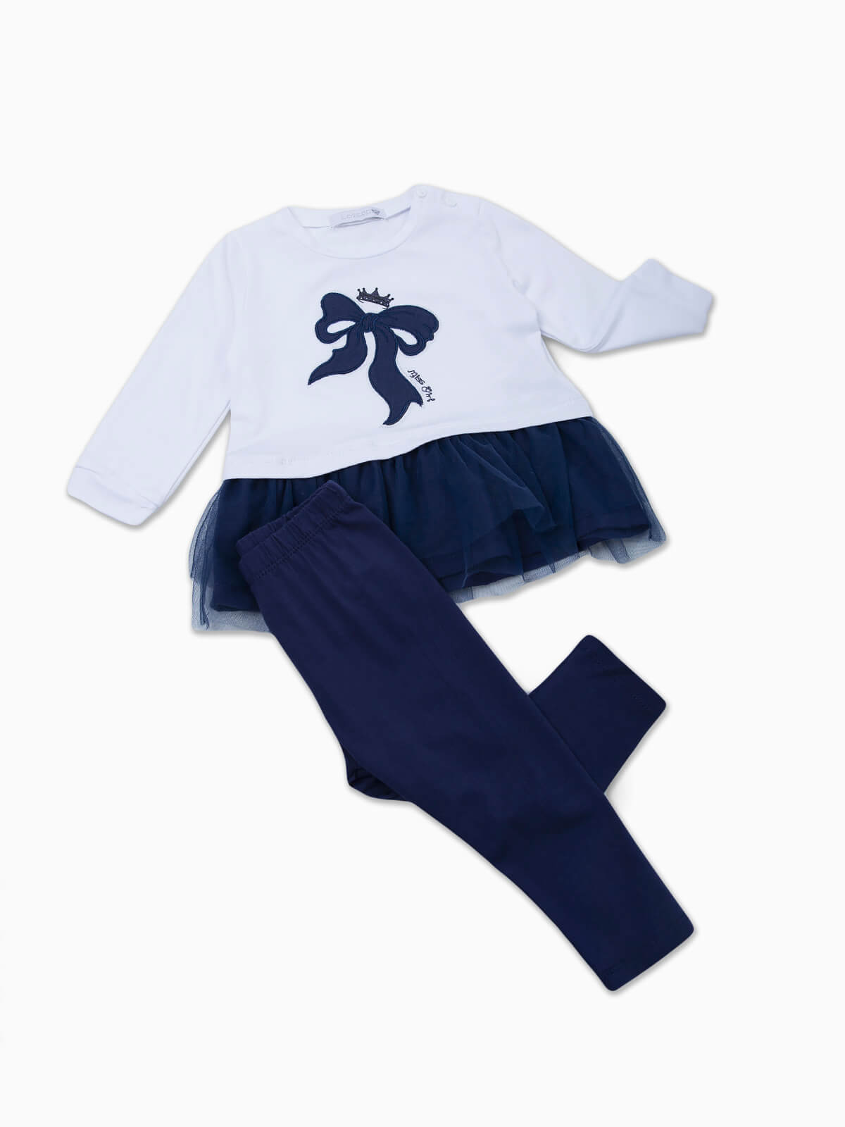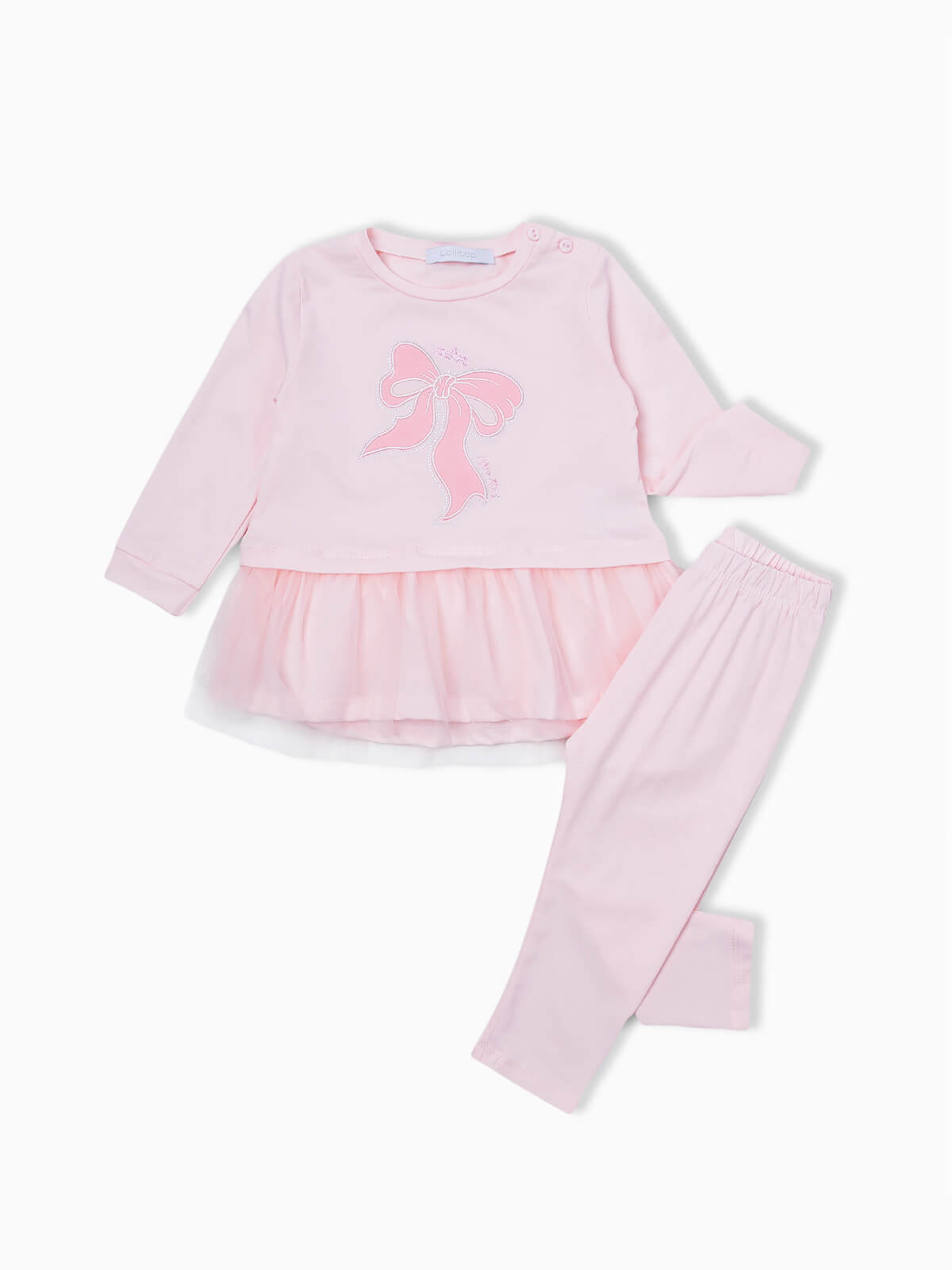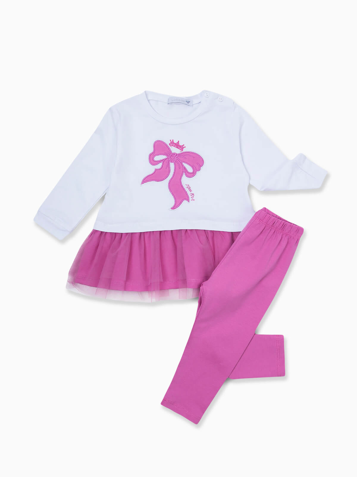 Conjunto de 2 peças com tule aplicado para bebé menina. Camisola de manga comprida com bordado de laço. Gola redonda com aperto de botões. Leggings elásticas.