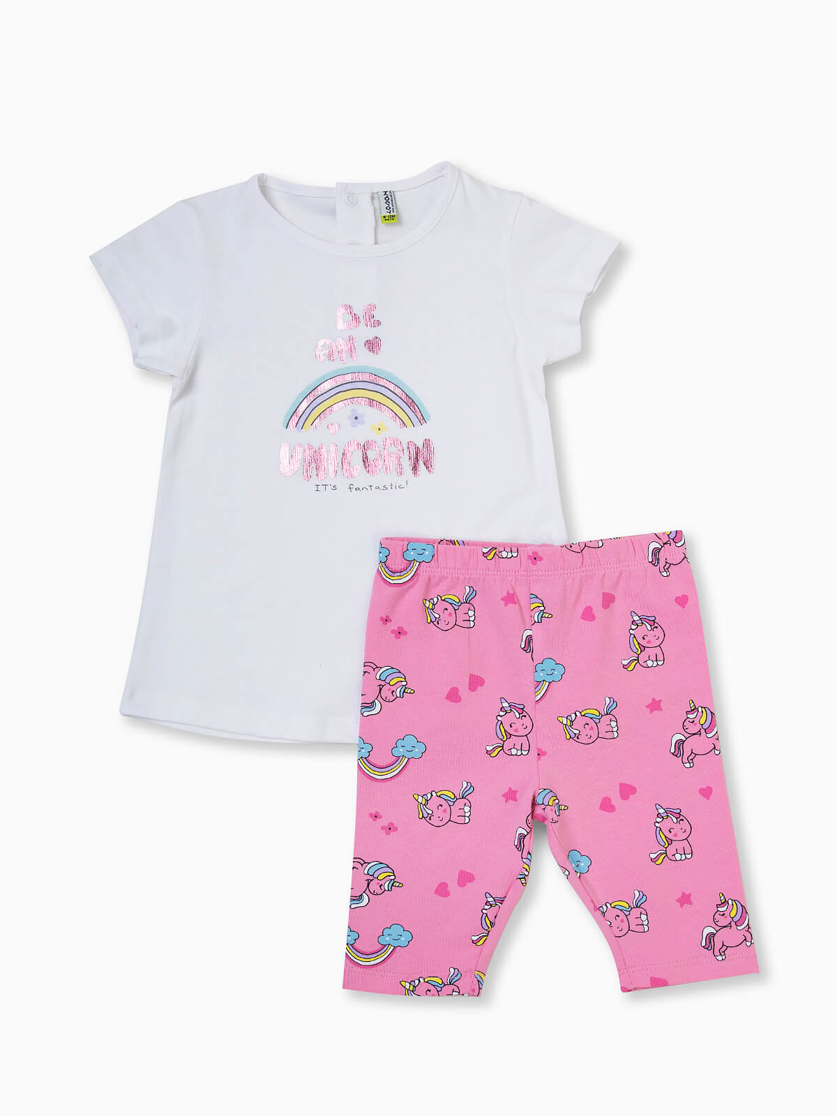 Conjunto de 2 peças para bebé menina com unicórnios estampados. T-shirt manga curta com decote redondo e aperto posterior botões de mola. Leggings com cintura elástica.