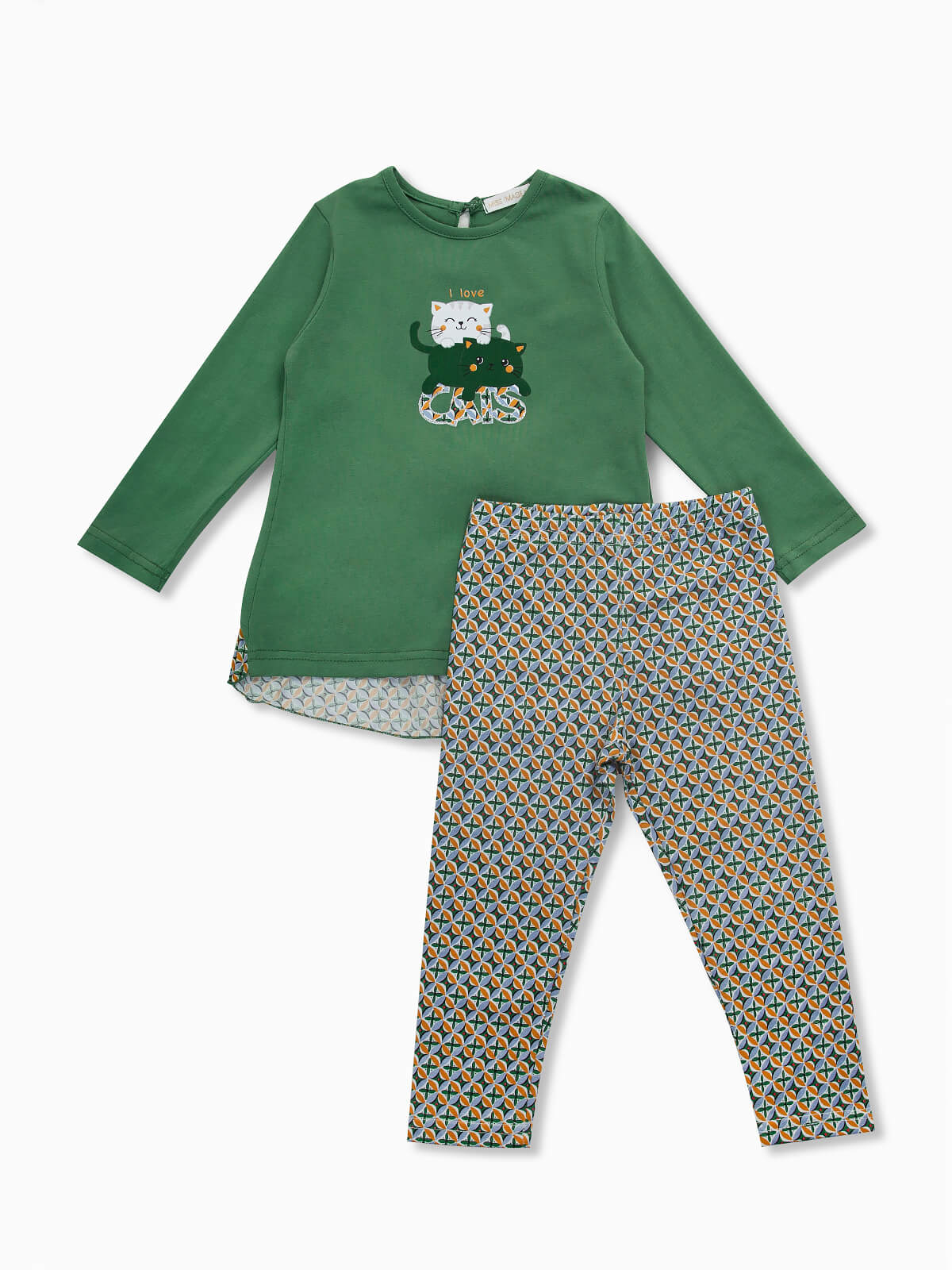 Conjunto com estampado geométrico e gatos. T-shirt manga comprida com encaixe de folho na parte posterior. Decote redondo. Leggings de cintura elástica.