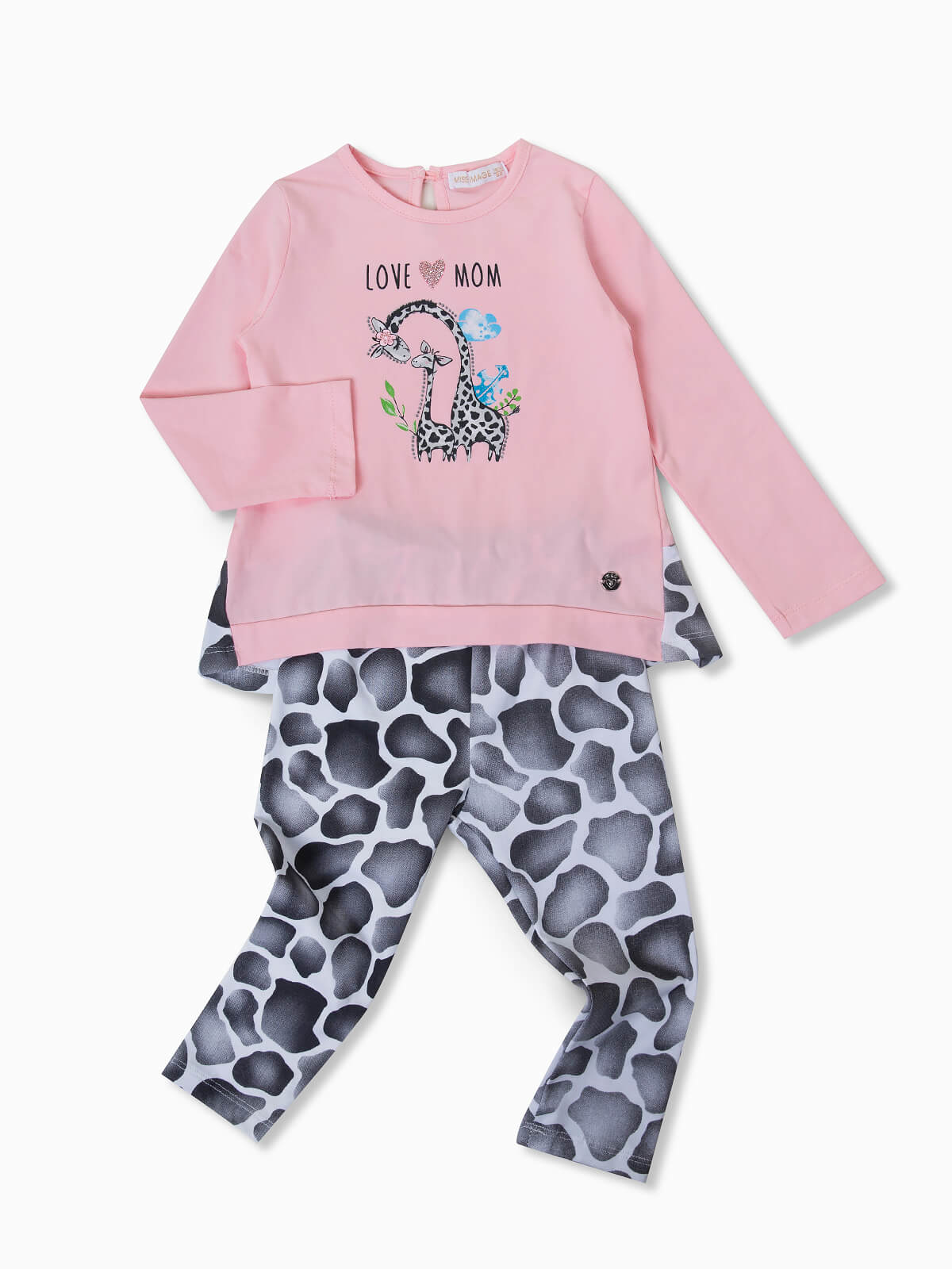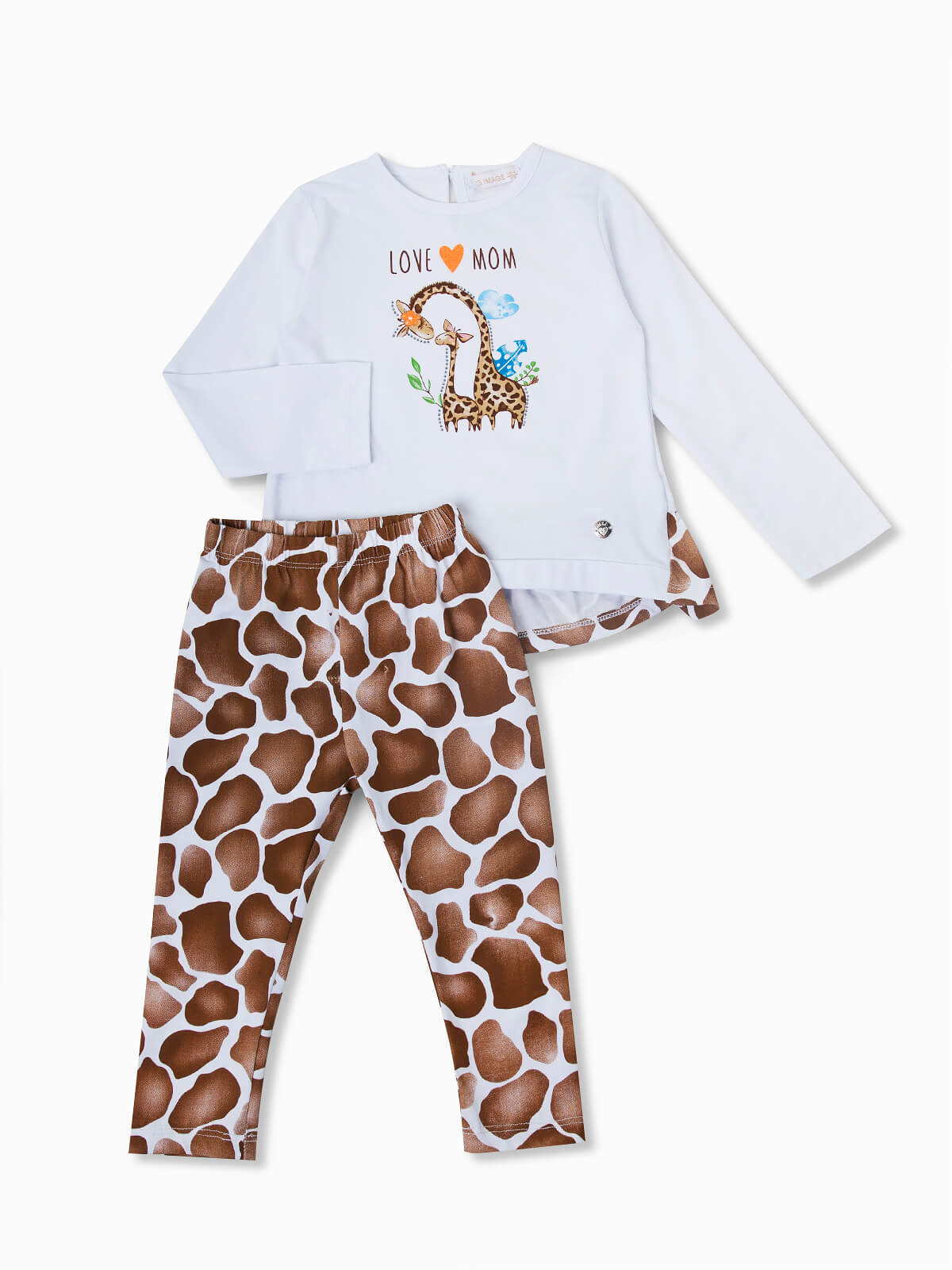 T-shirt de manga comprida estampada com encaixe folho na base. Decote redondo e aperto posterior de botão. Leggings para menina de cintura elástica.