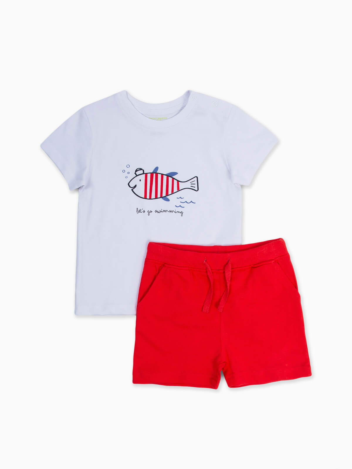 Conjunto 2 peças com estampado de peixe. T-shirt de manga curta com gola redonda e aperto de 2 botões de pressão. Calções de cintura elástica com cordão para ajustar. 2 bolsos.