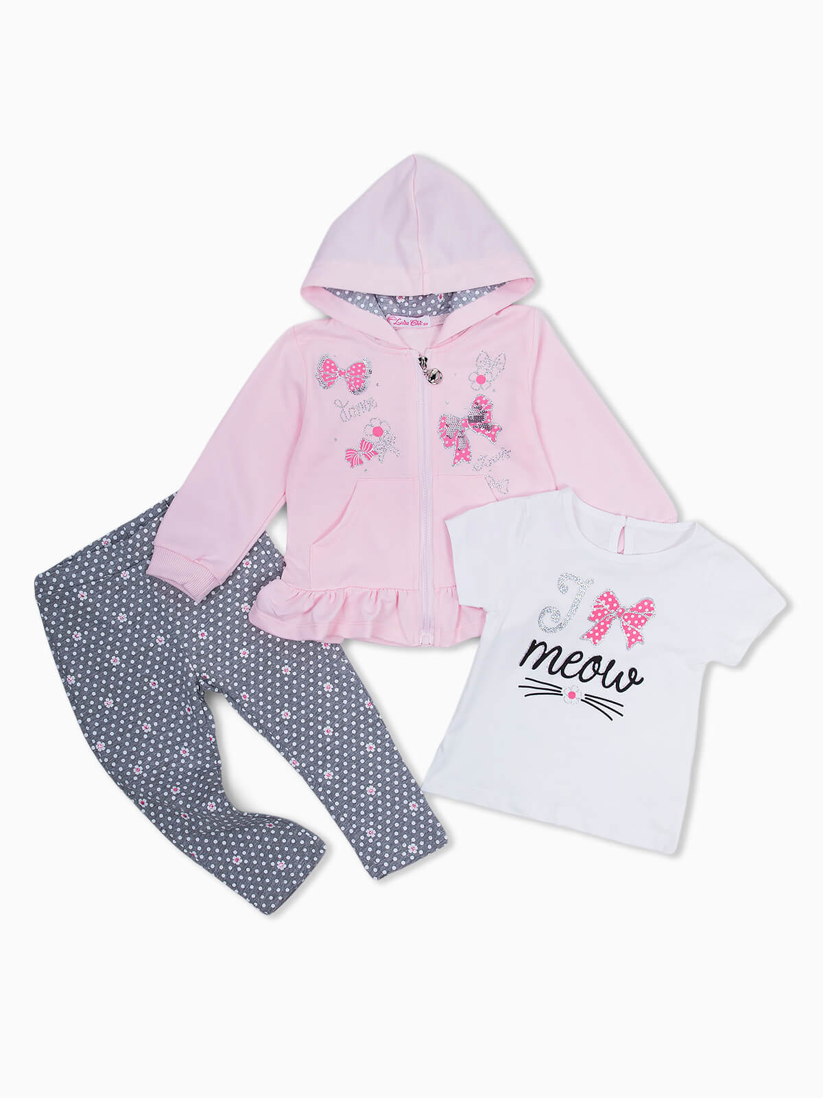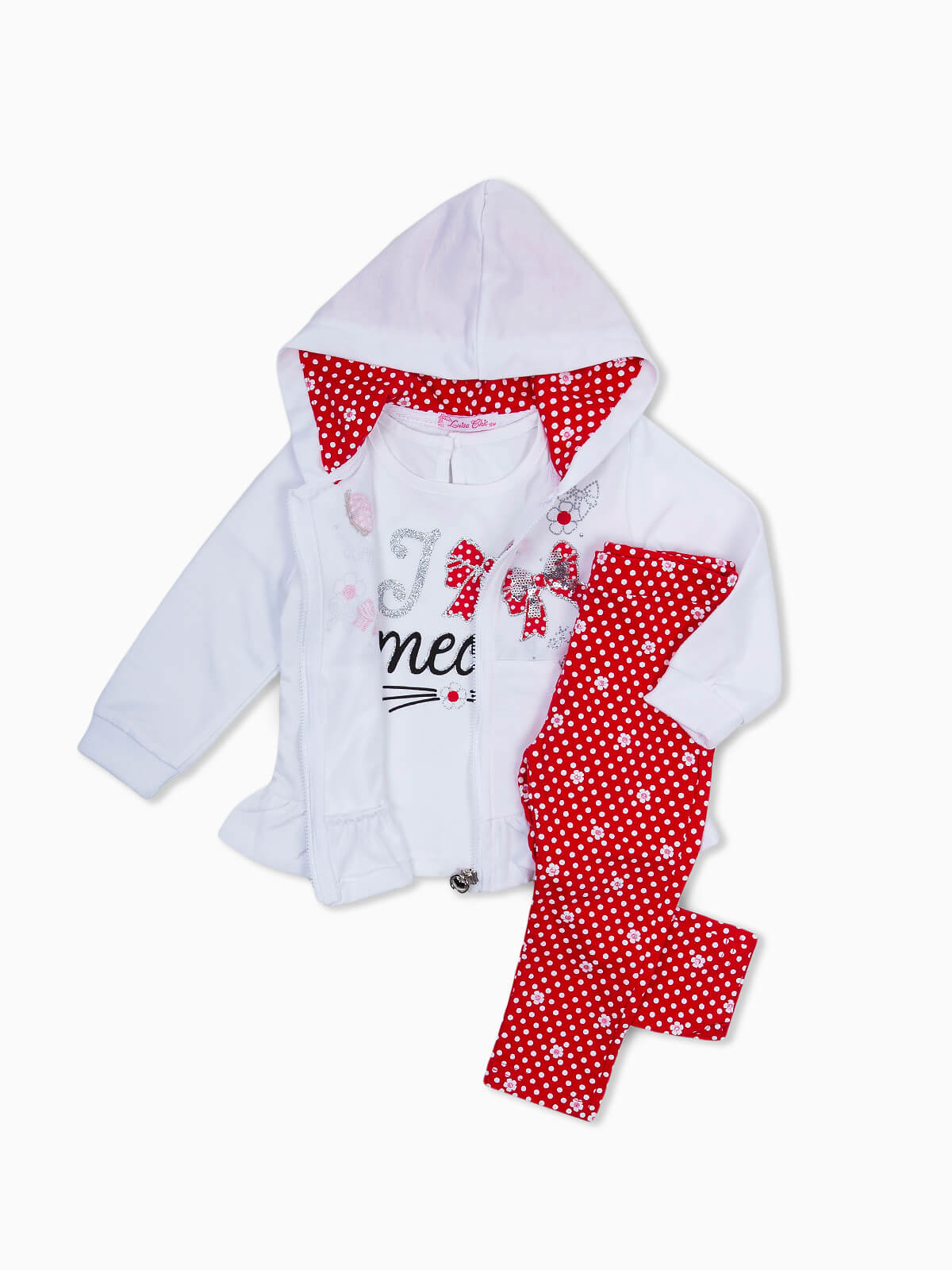Conjunto 3 peças com bolinhas e lantejoulas. Casaco desportivo com capuz e base acabada em folho. Manga comprida. Aperto de fecho zíper. 2 bolsos. T-shirt estampada de manga curta com aperto posterior de botão. Gola redonda. Leggings elásticas.
