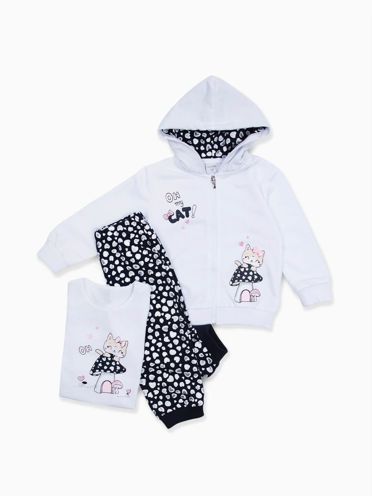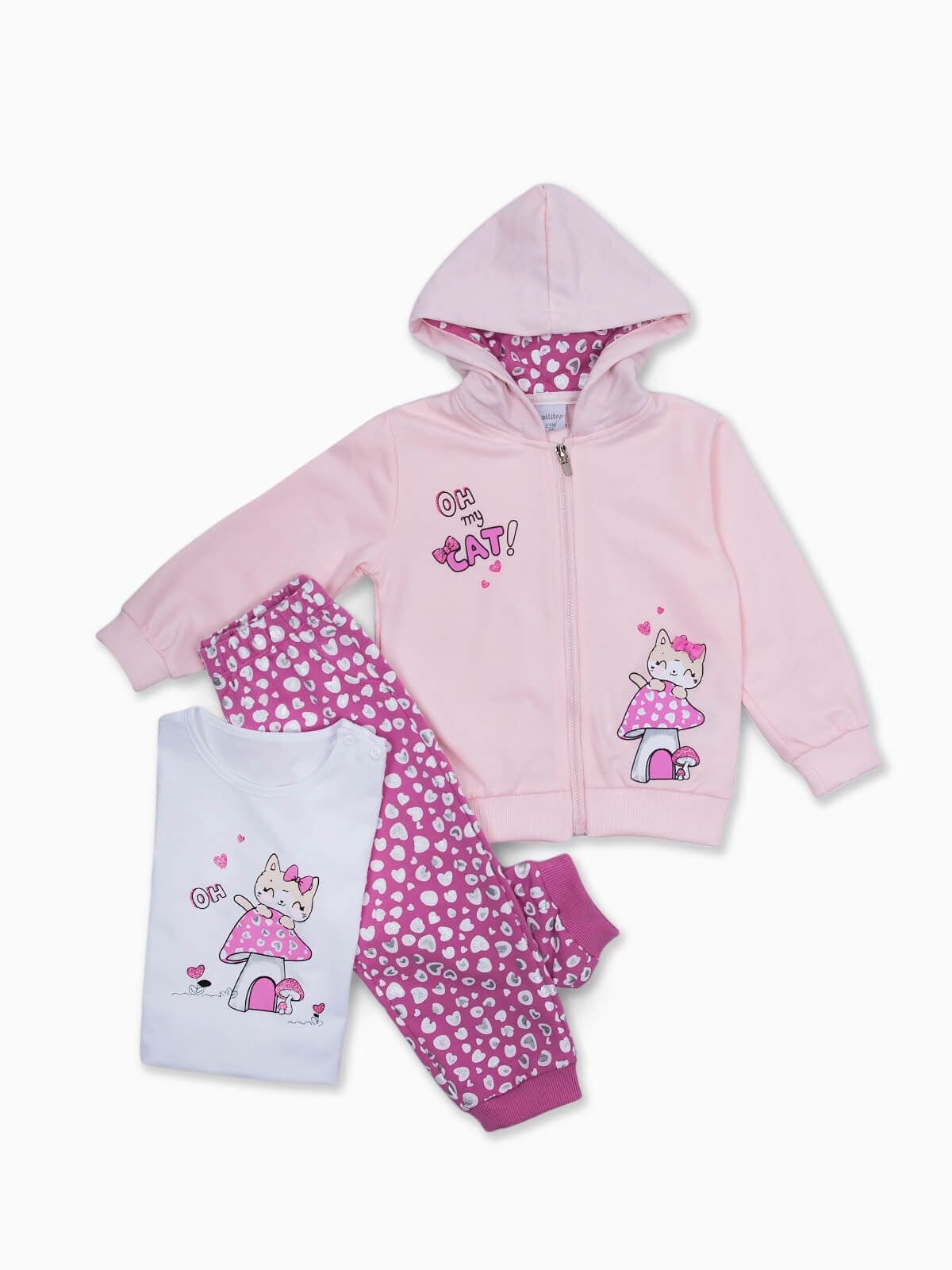 Conjunto de 3 peças com estampado de corações para bebé menina. Casaco de manga comprida com capuz e pormenores brilhantes. T-shirt branca de manga curta com gola redonda e aperto de dois botões. Calças jogger elásticas.