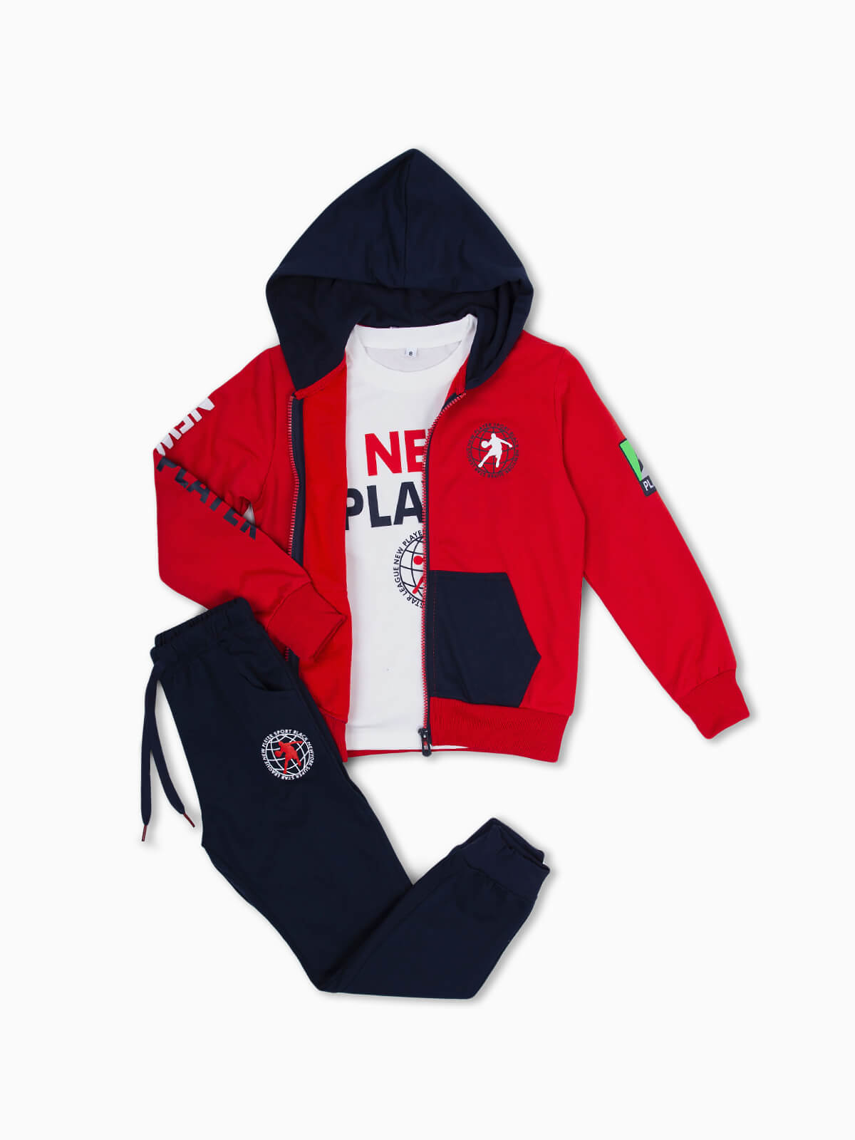 Conjunto de 3 peças com estampado para menino. Casaco hoodie com bolso canguro e símbolo no peito. Aperto de fecho zíper. T-shirt de manga comprida com gola redonda. Calças jogger com cordão para ajustar. 2 bolsos. Extremidades elásticas.