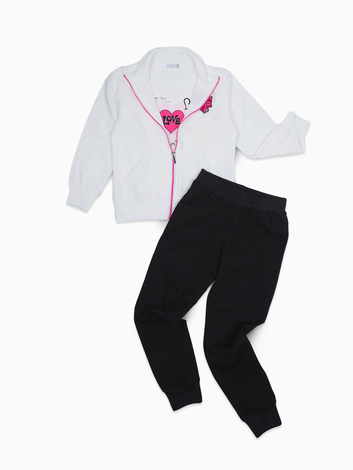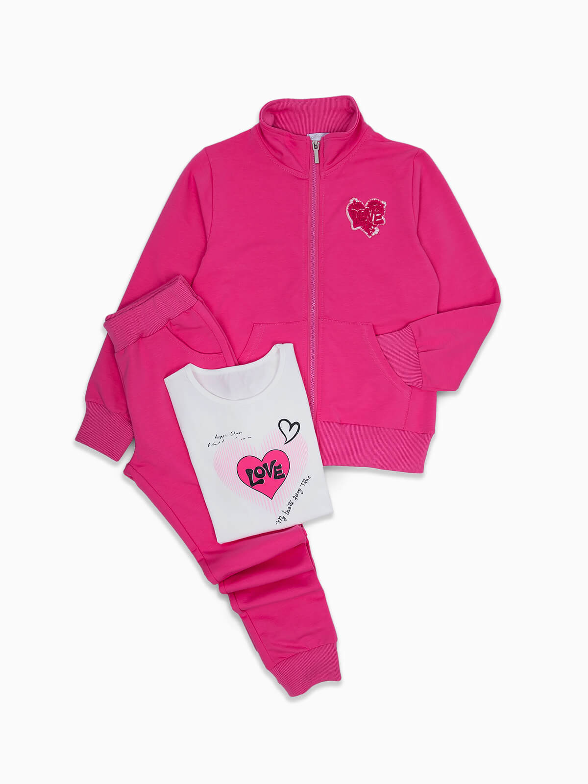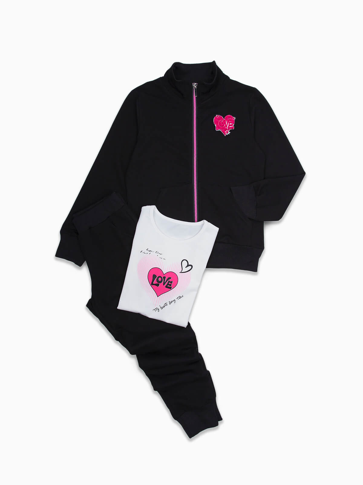 Conjunto de 3 peças estampado Love. Casaco manga comprida com gola subida. Bordado no peito. 2 bolsos. Aperto de fecho zíper. T-shirt de manga curta com decote redondo. Calças jogger elásticas.