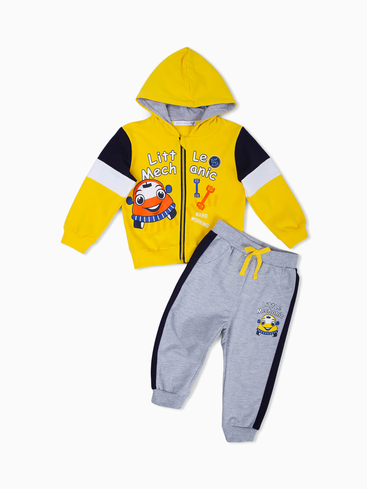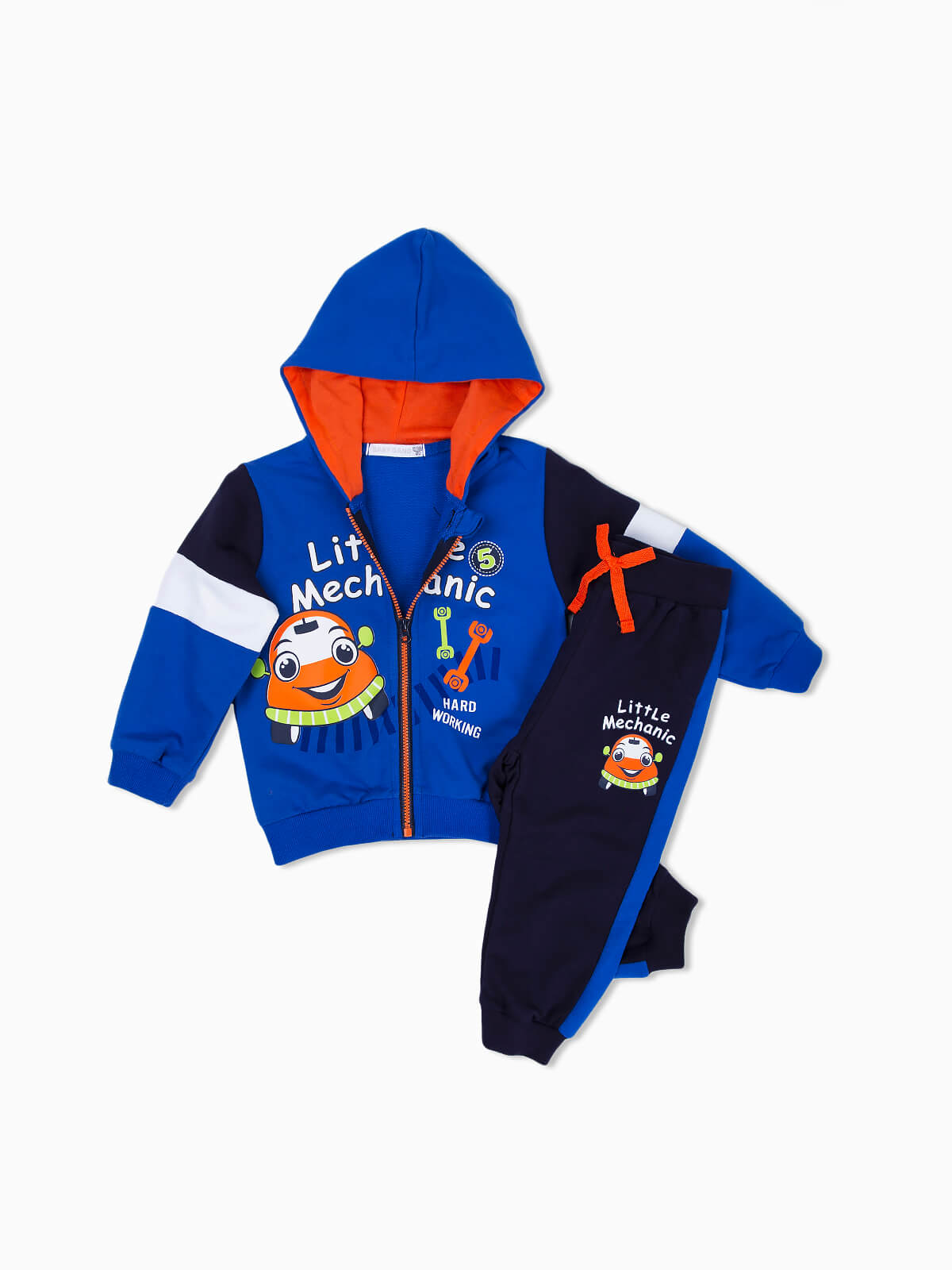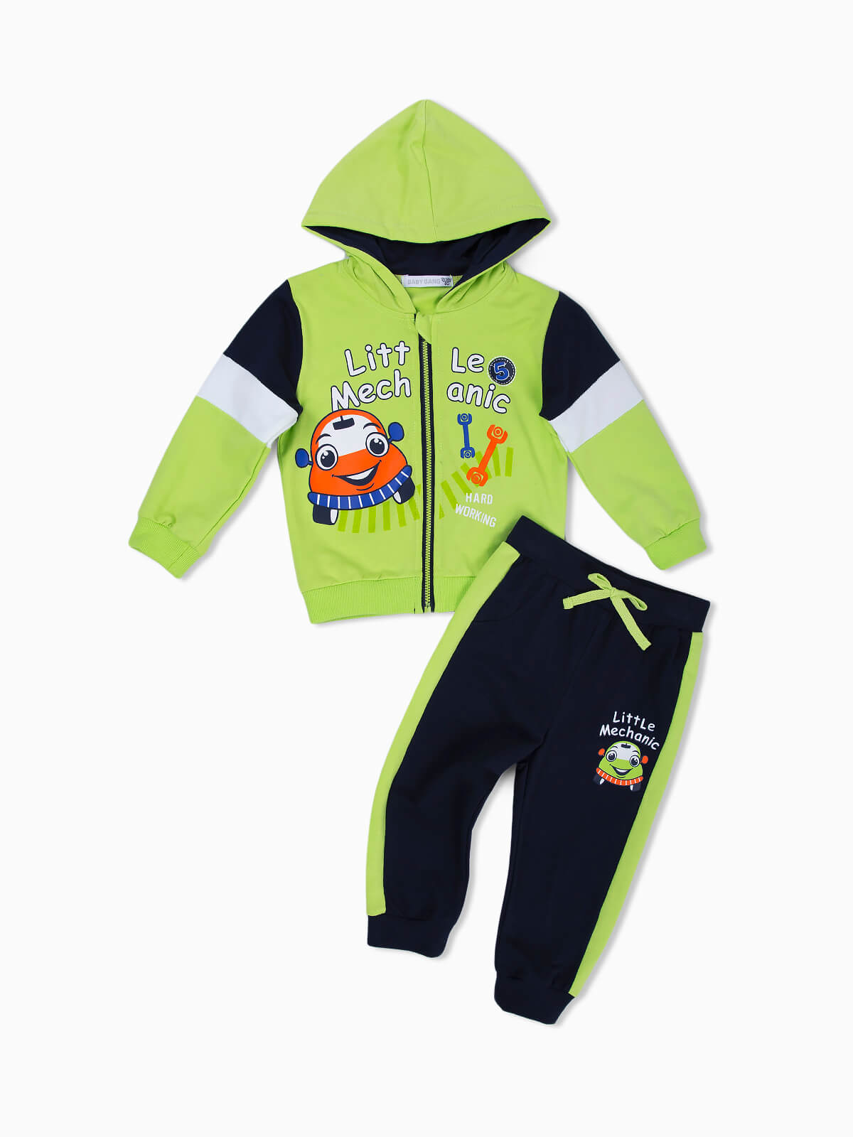 Conjunto para bebé menino de 2 peças. Casaco estampado com capuz e encaixe de cores. Punhos elásticos. Aperto de fecho zíper. Calças fato de treino com extremidades elásticas.